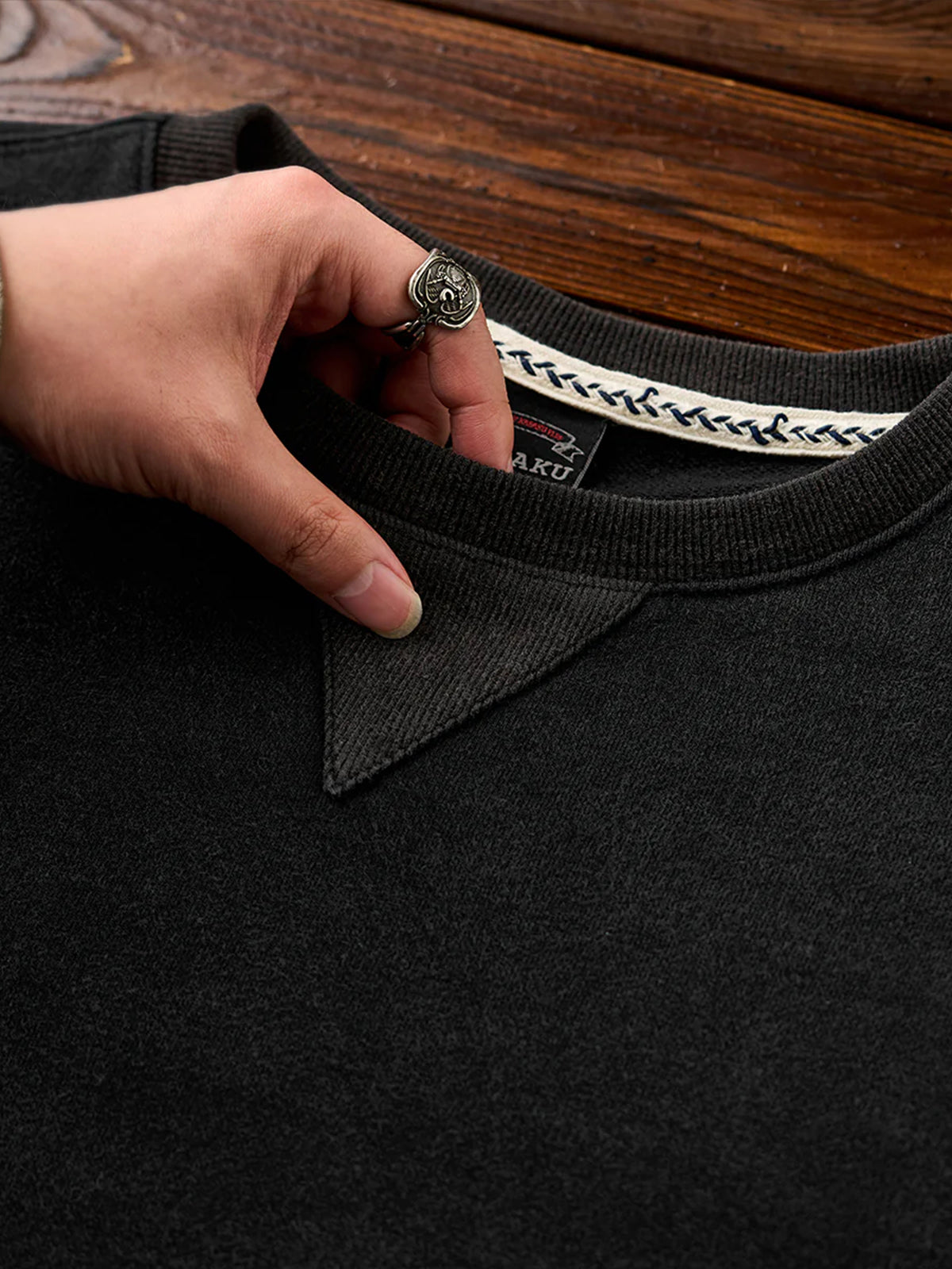 Waffle Pullover Sweatshirt with Washed Denim Sleeve and Pocket Panels
