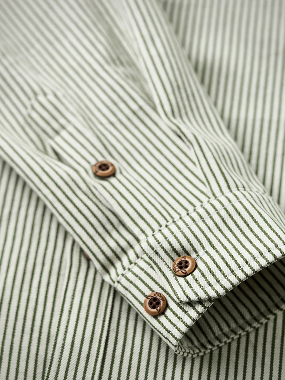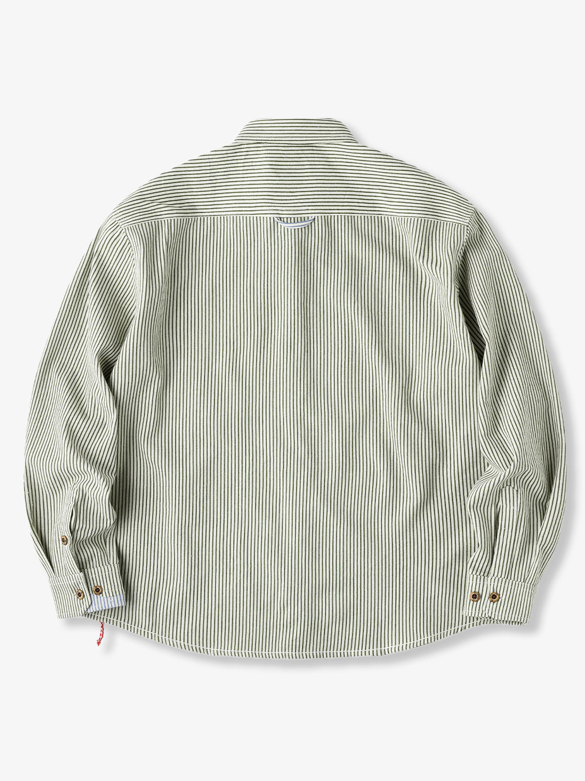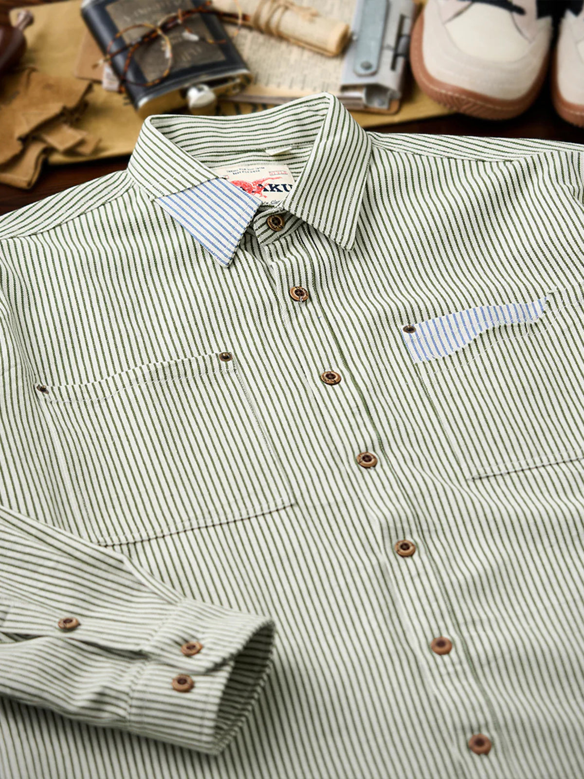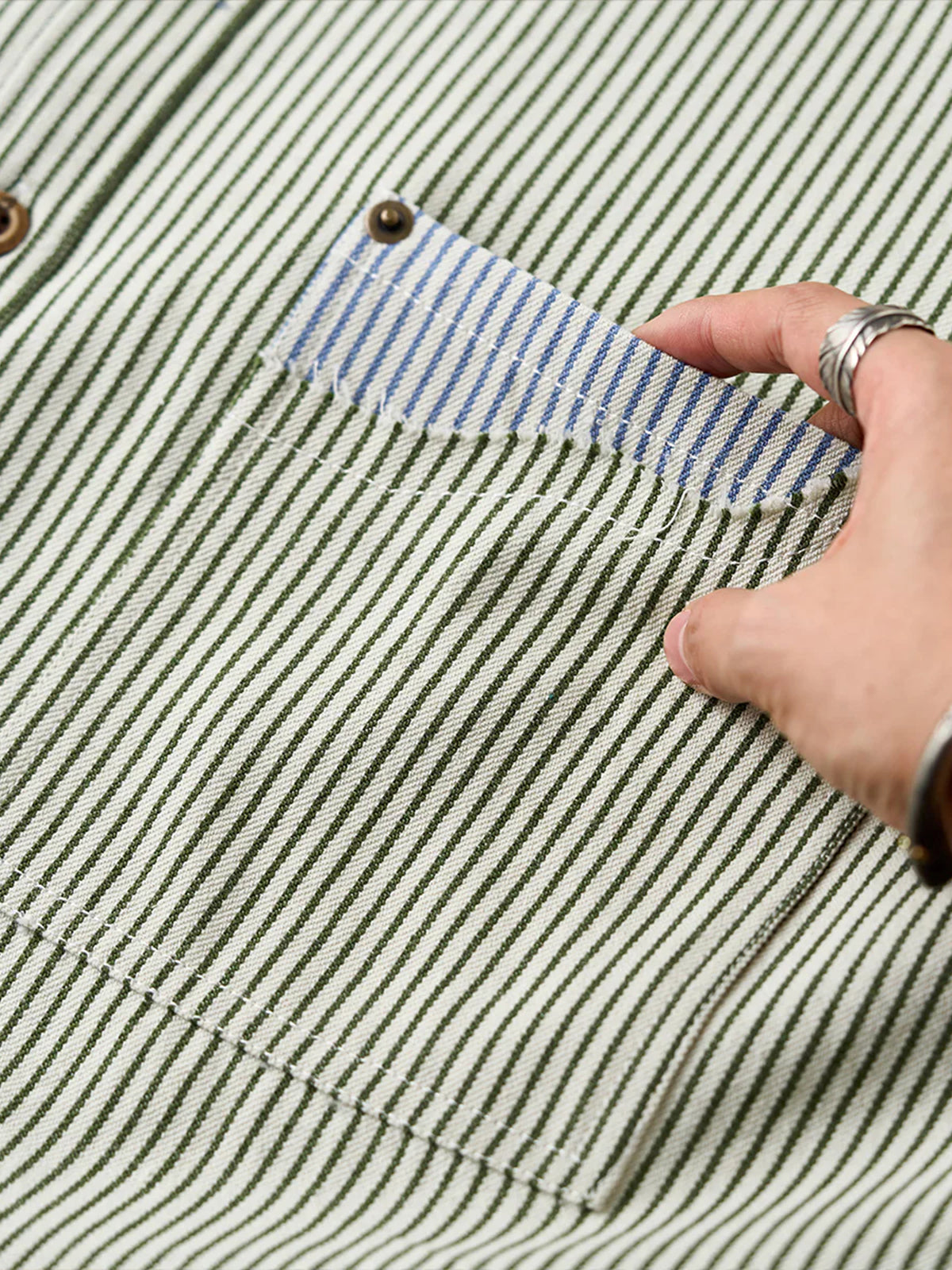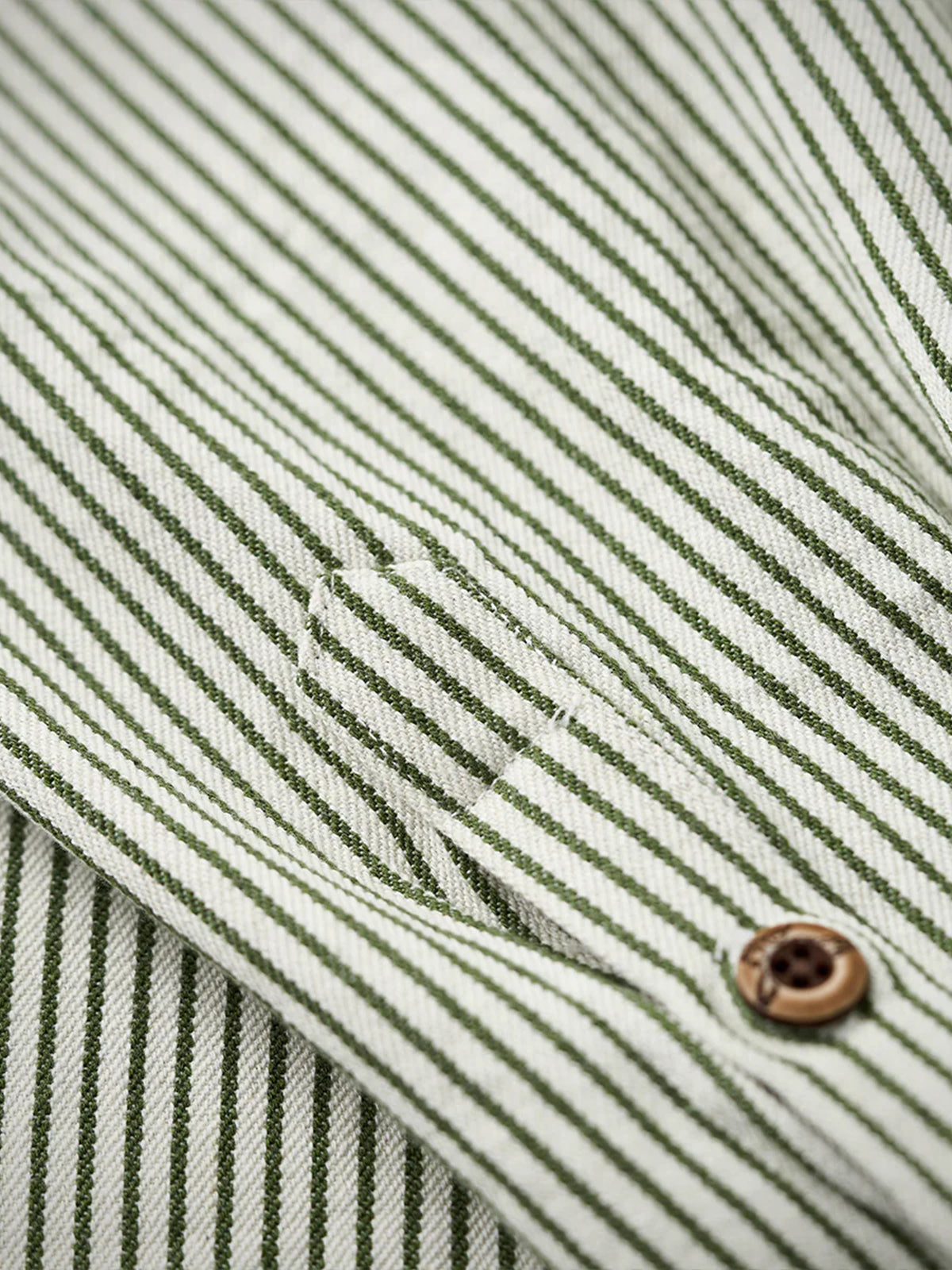 A work shirt featuring a fine all-over stripe pattern for a classic, understated look. The collar, pockets, and cuffs use contrasting blue stripes, creating standout design accents. Two chest pockets enhance functionality, staying true to the practical workwear style. Wood-look buttons add durability and a vintage touch. A red-and-white drawcord at the hem adds a playful element, emphasizing casual charm while drawing attention.