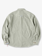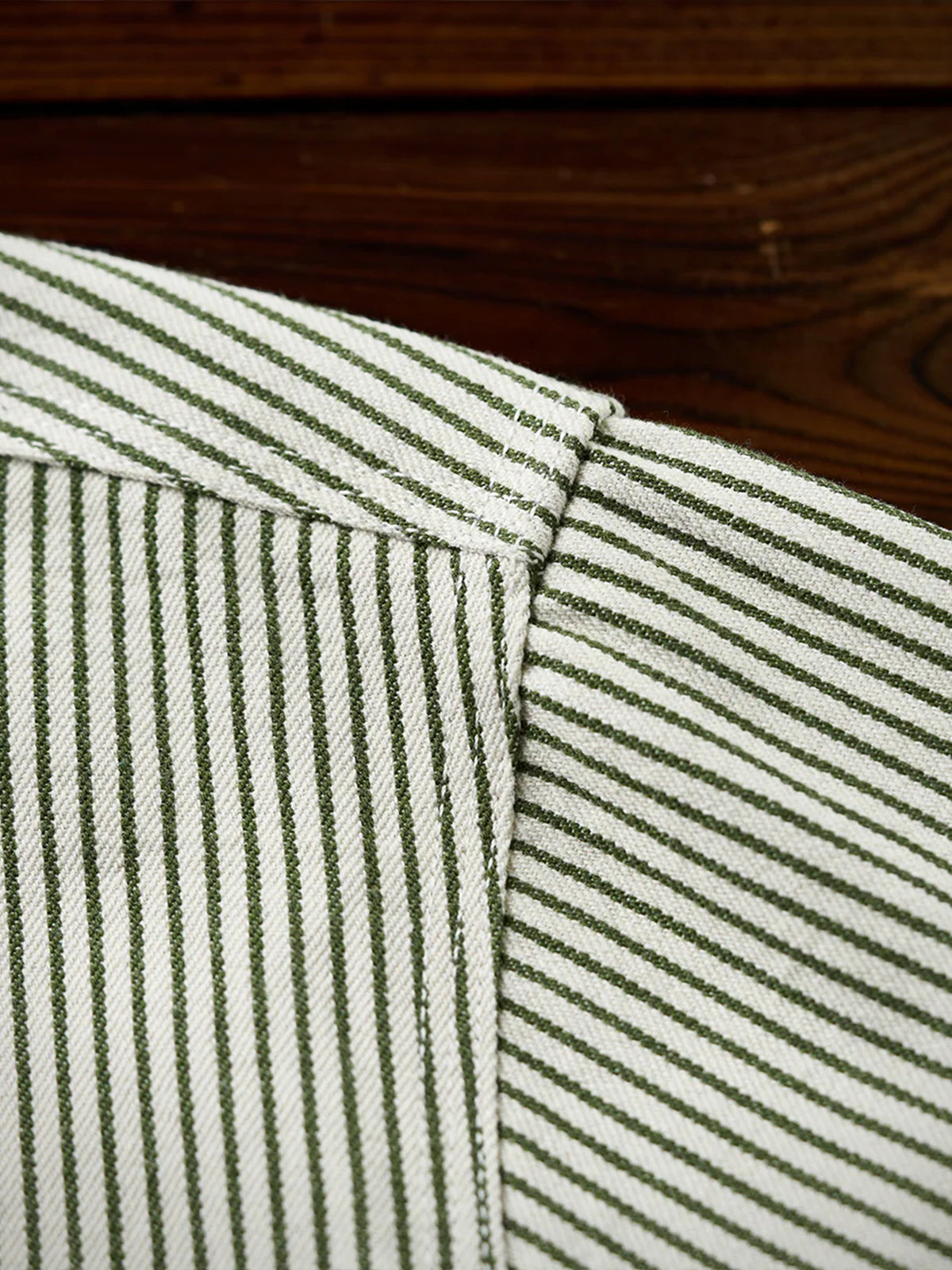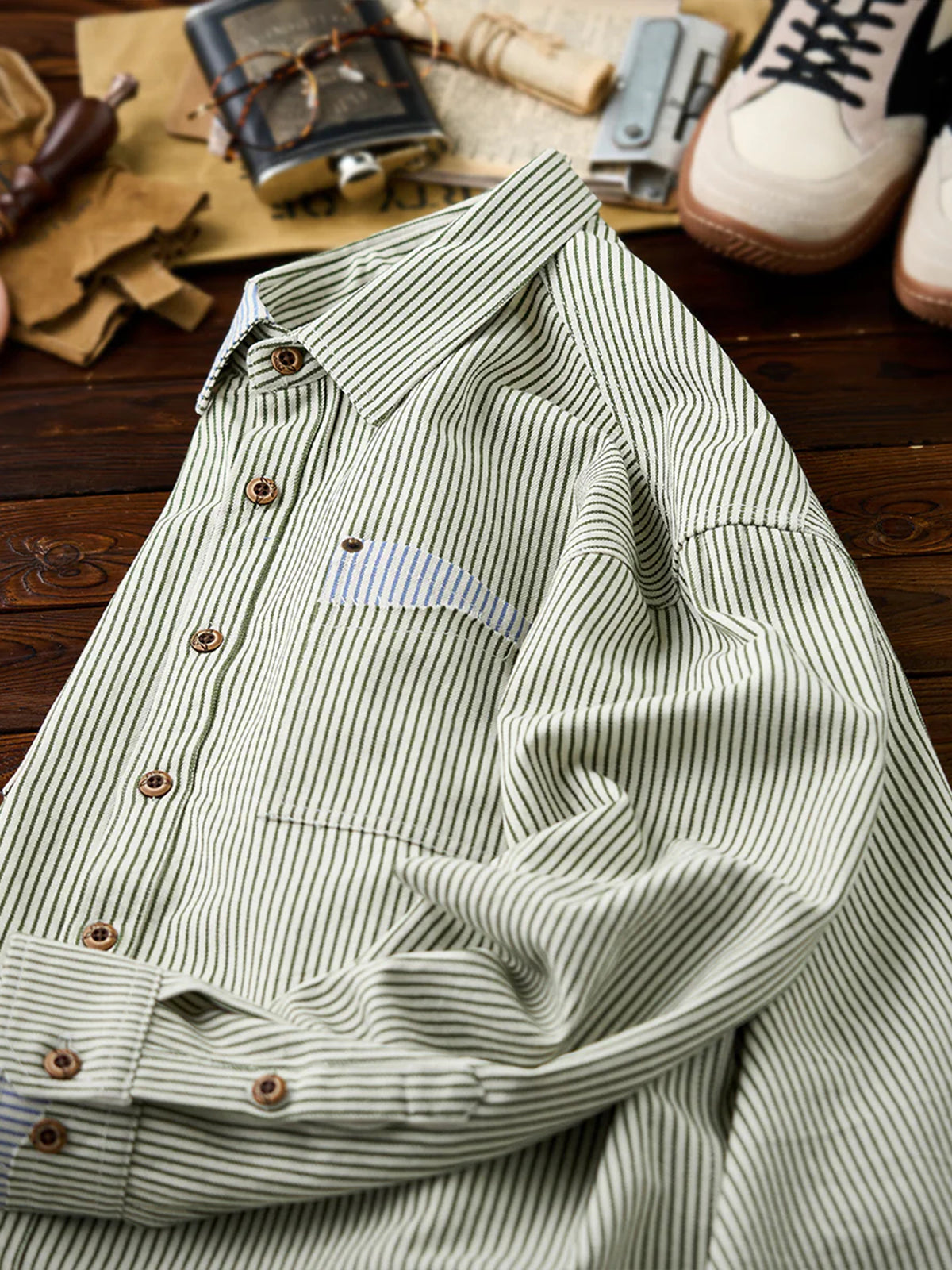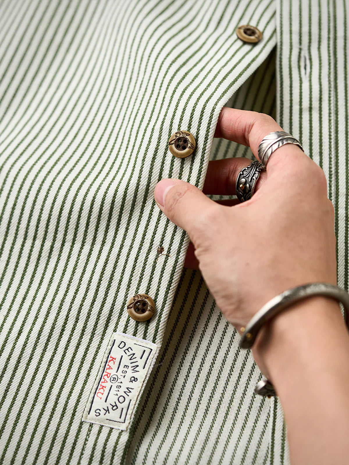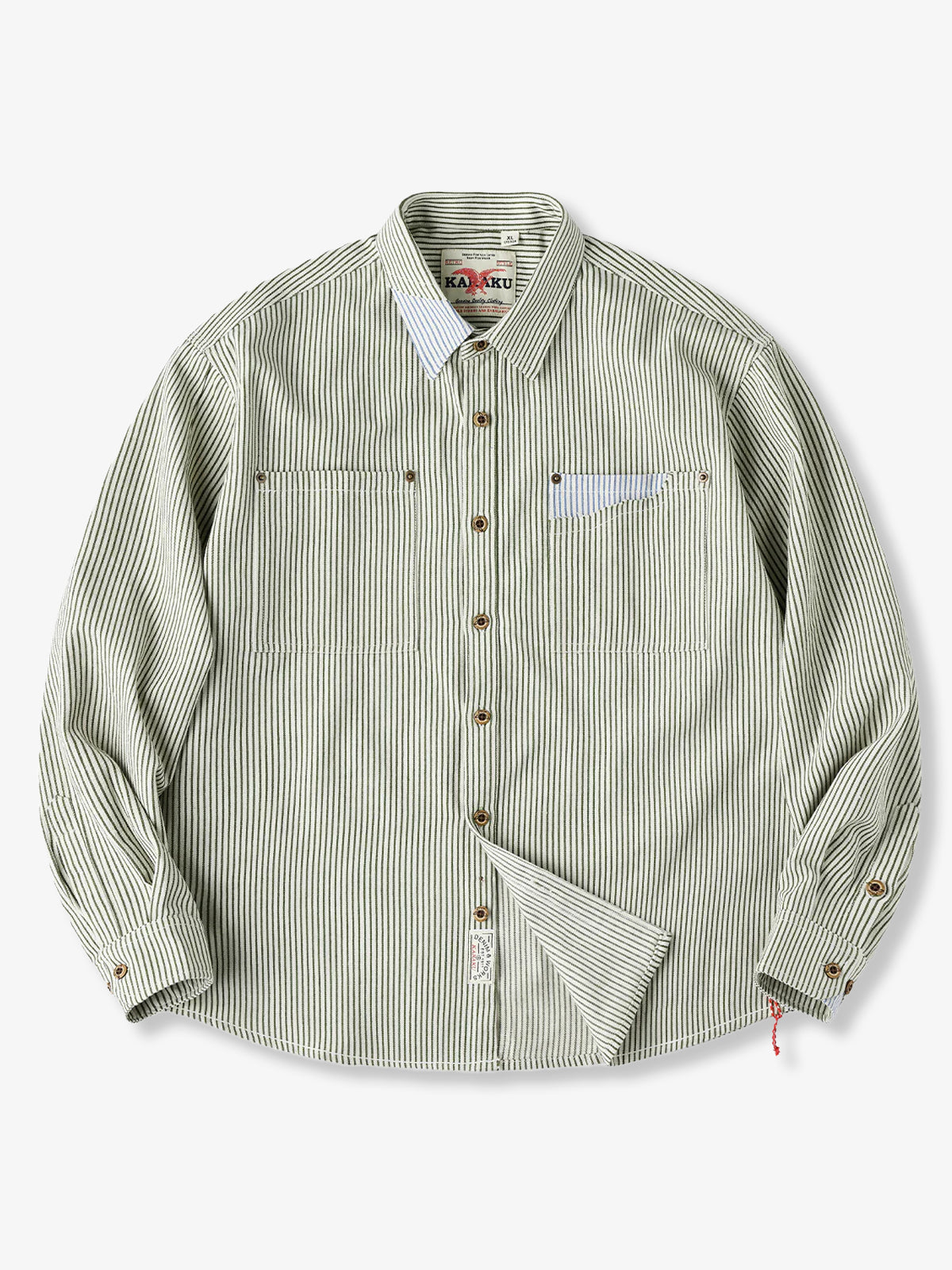 A work shirt featuring a fine all-over stripe pattern for a classic, understated look. The collar, pockets, and cuffs use contrasting blue stripes, creating standout design accents. Two chest pockets enhance functionality, staying true to the practical workwear style. Wood-look buttons add durability and a vintage touch. A red-and-white drawcord at the hem adds a playful element, emphasizing casual charm while drawing attention.