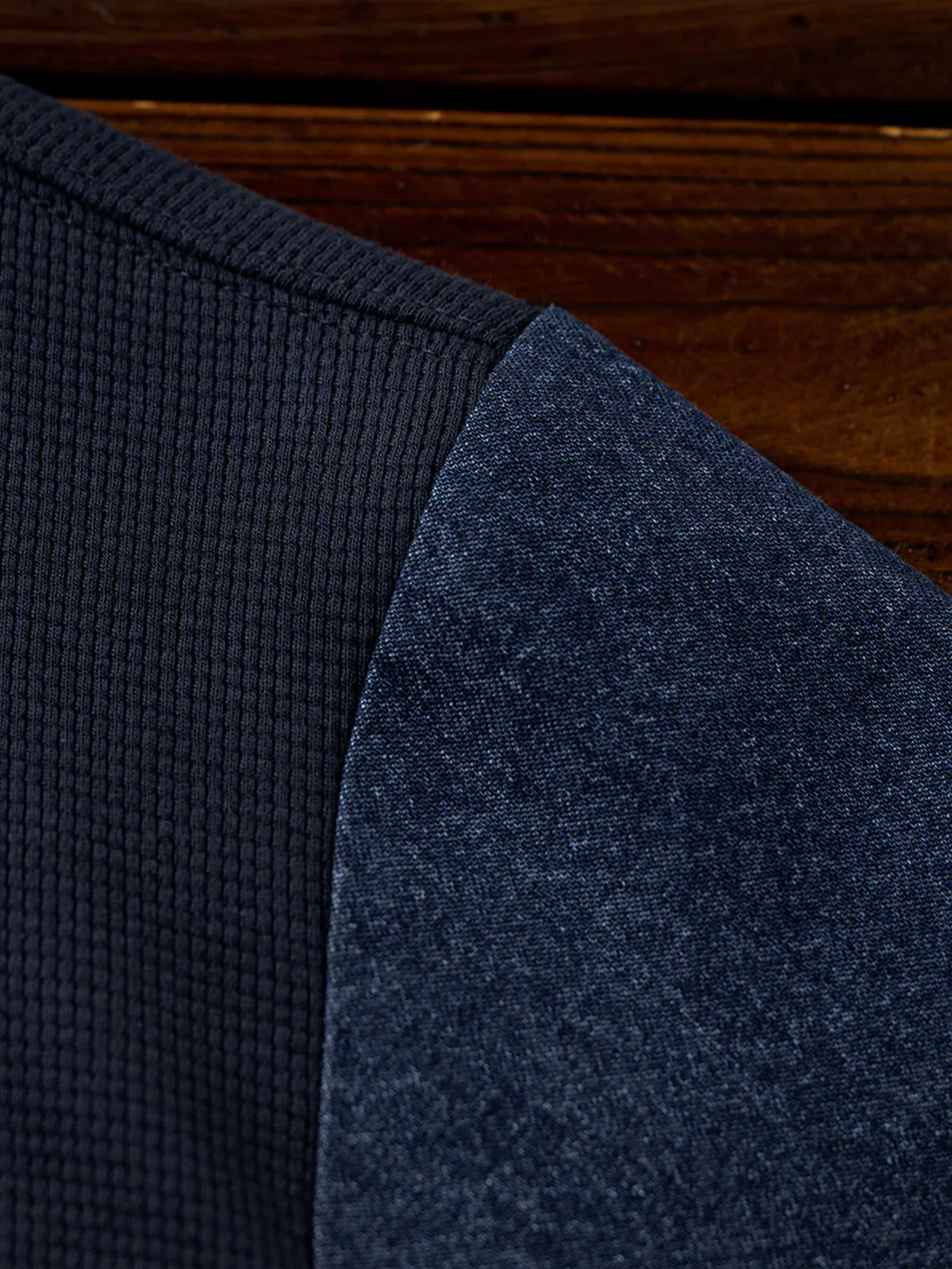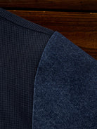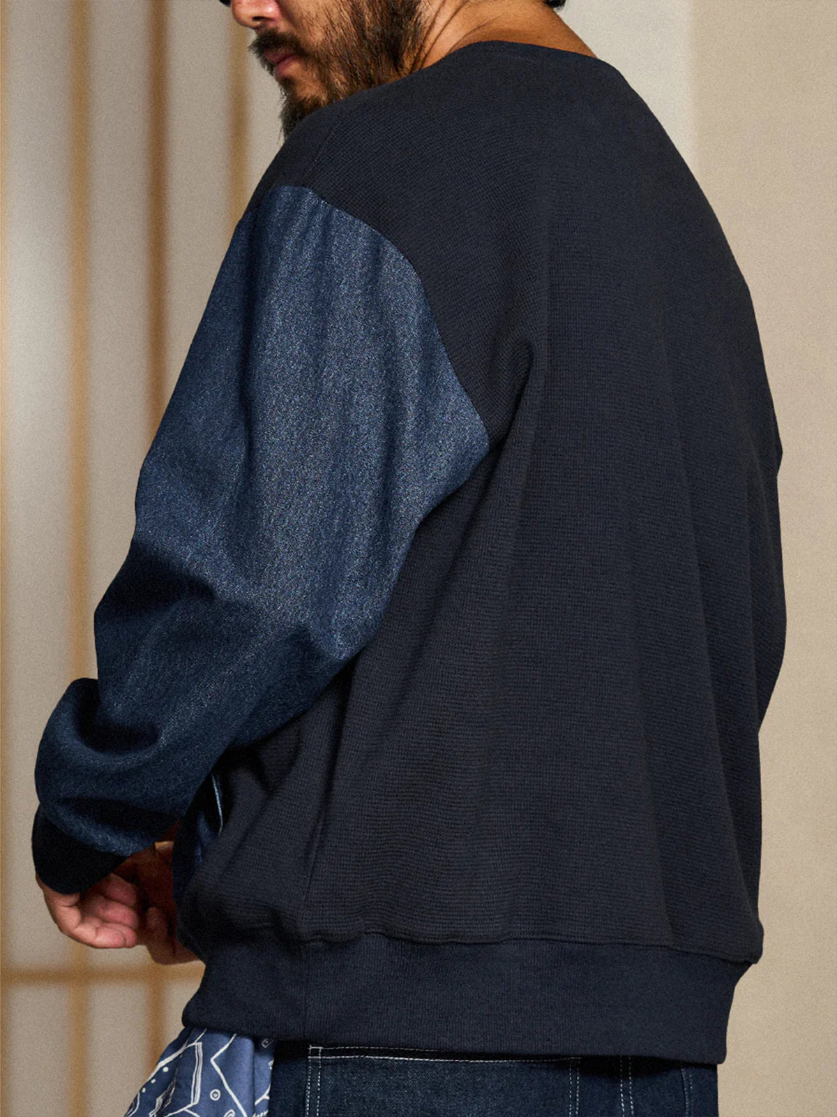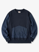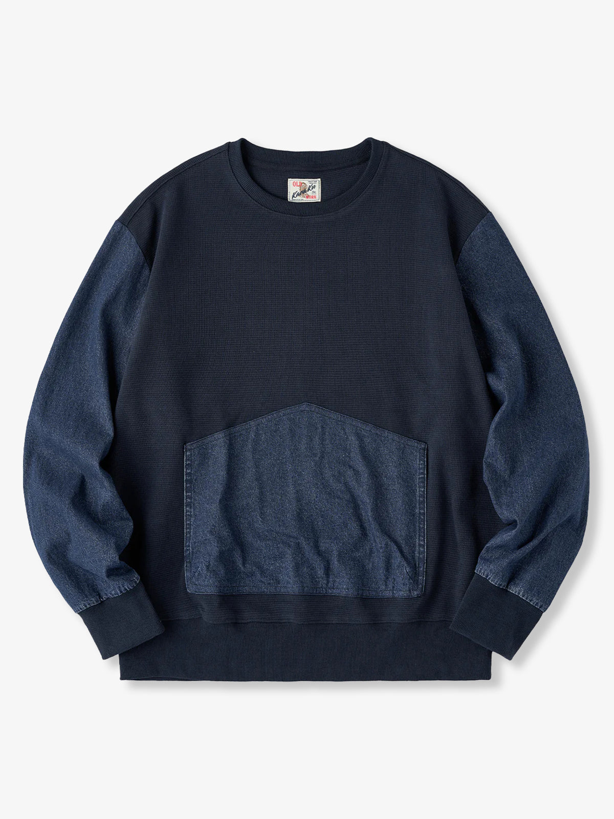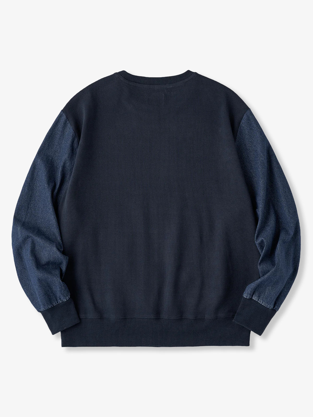Waffle Pullover Sweatshirt with Washed Denim Sleeve and Pocket Panels