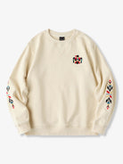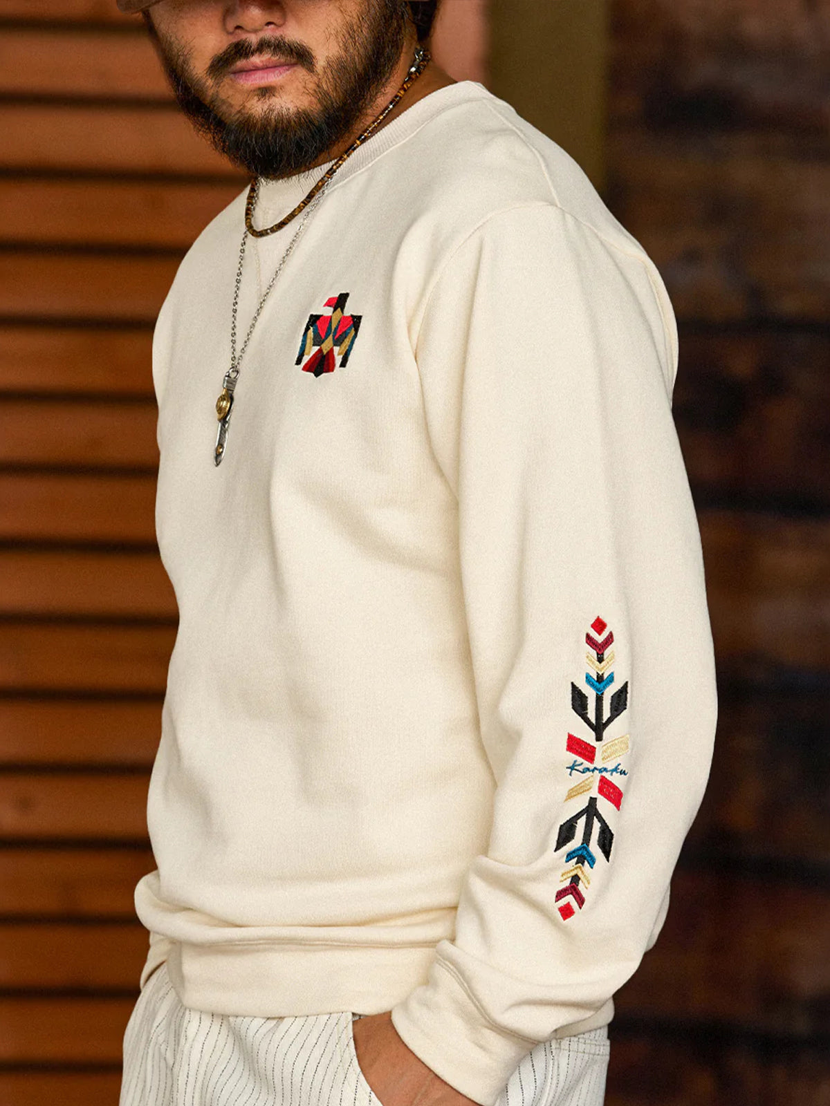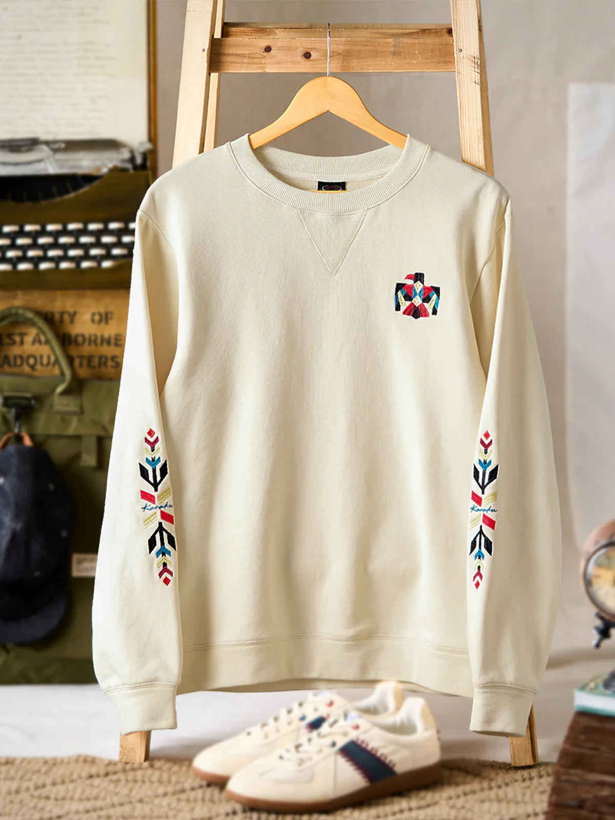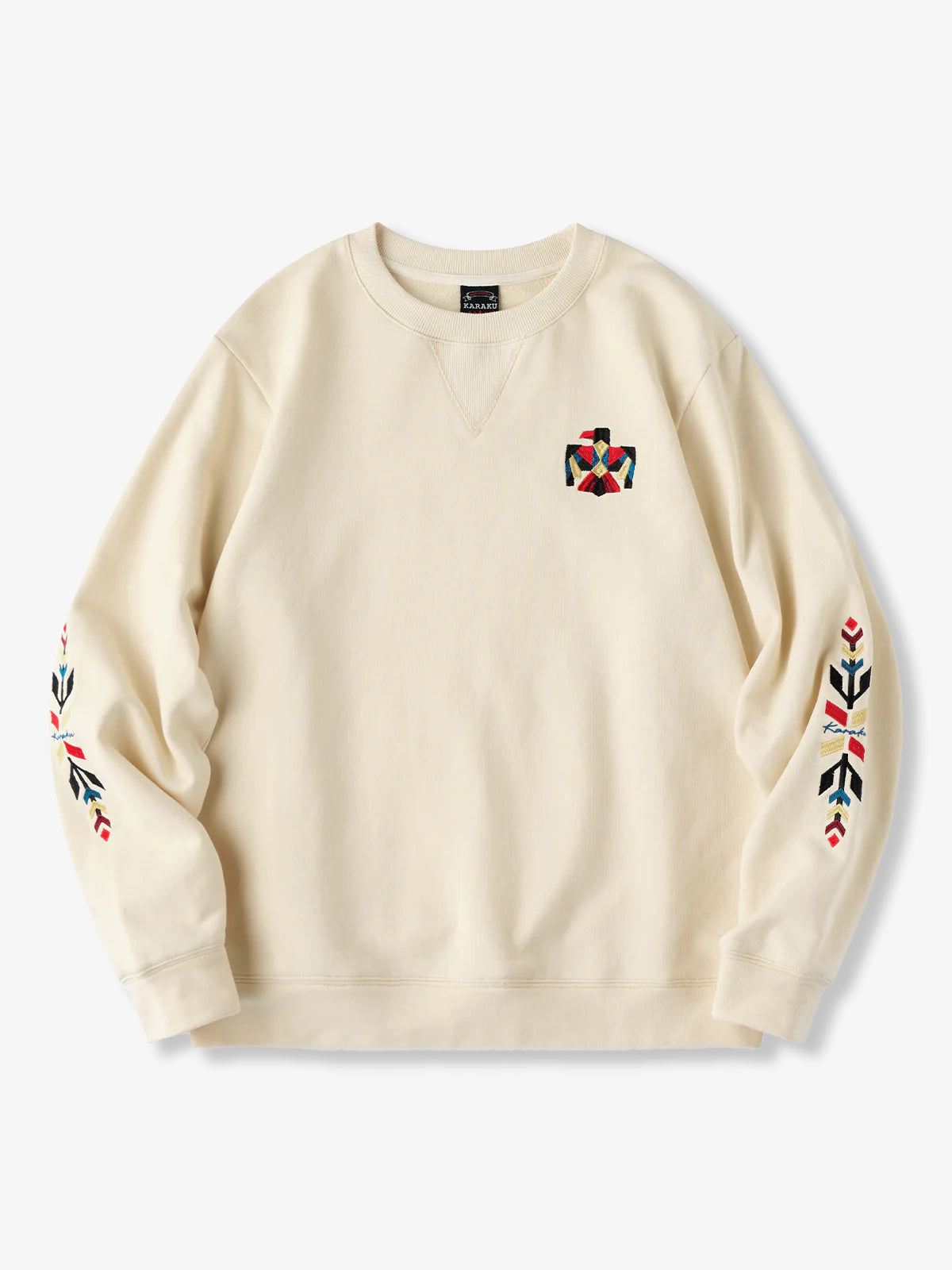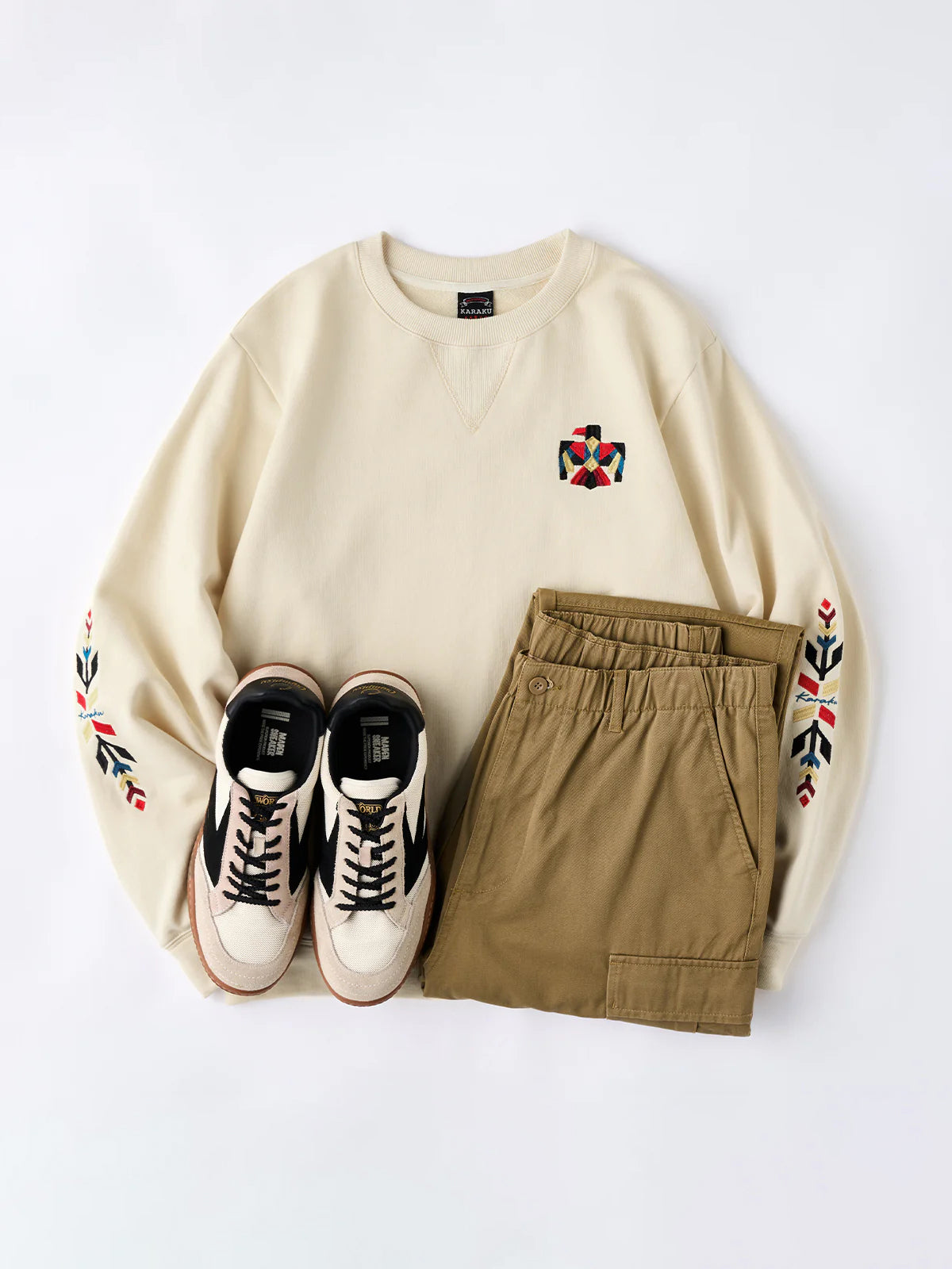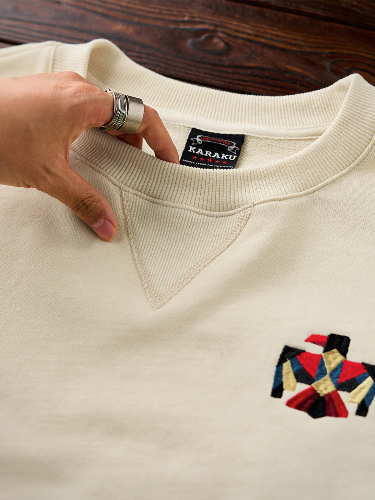 This bold sweatshirt features the Native American symbol “Thunderbird” embroidered on the chest, paired with powerful Navajo-style embroidery on both sleeves. The textured, raised embroidery adds depth and visual impact, making the piece eye-catching even when worn on its own. A classic V-gusset at the neckline gives a subtle sporty touch, balancing out the overall silhouette. Thick ribbed trims in matching tones at the collar, cuffs, and hem enhance its vintage-inspired look. Whether worn solo or layered under a jacket, this piece blends traditional motifs with modern design—true to Karaku's aesthetic.