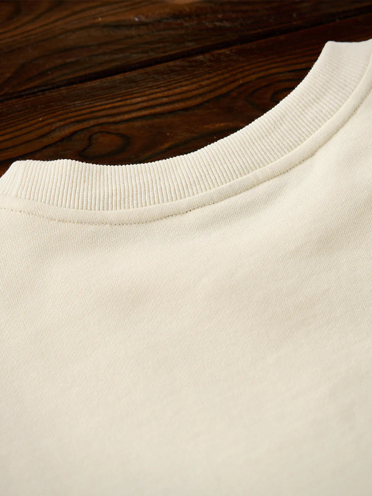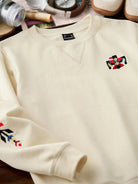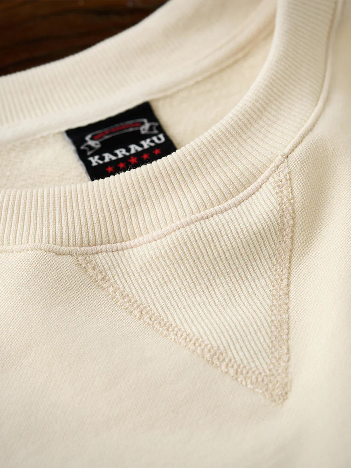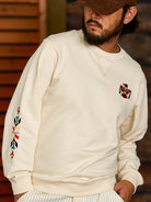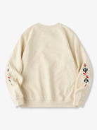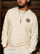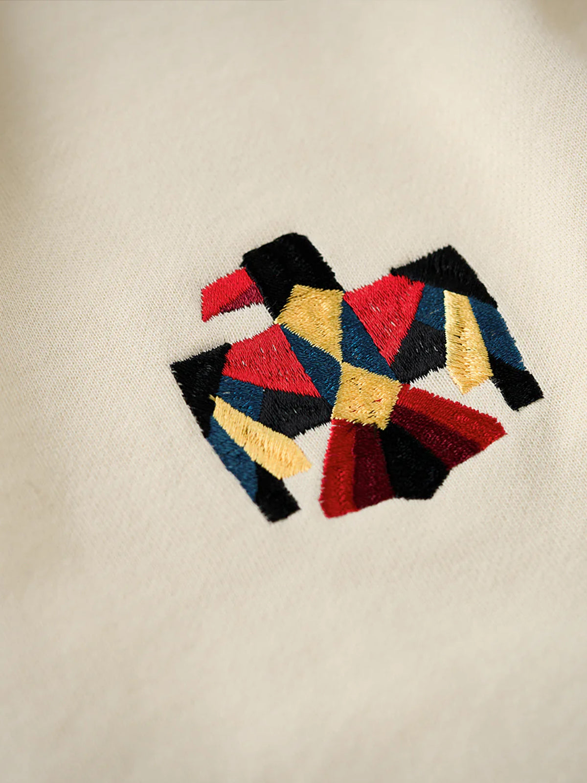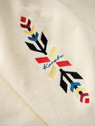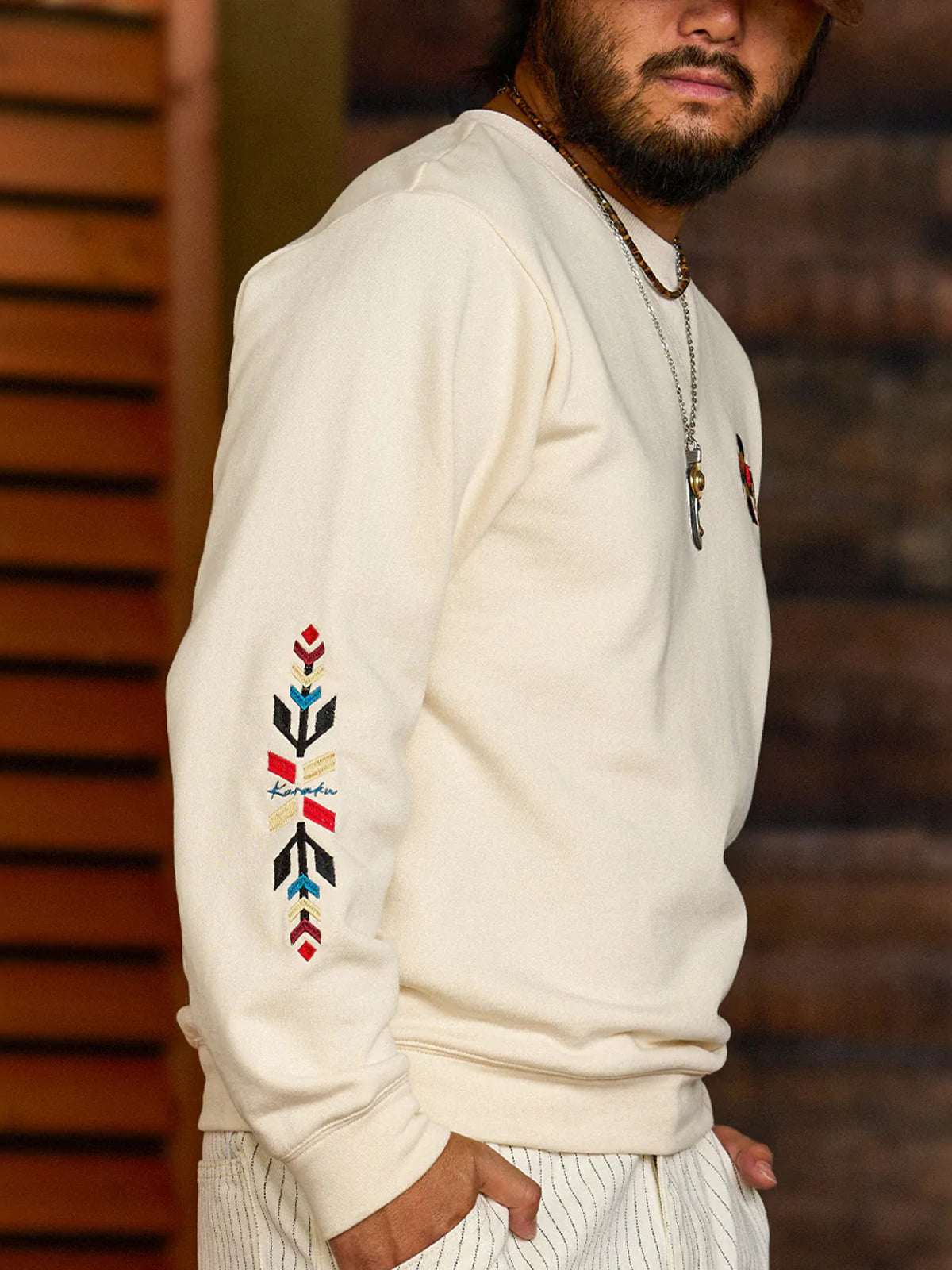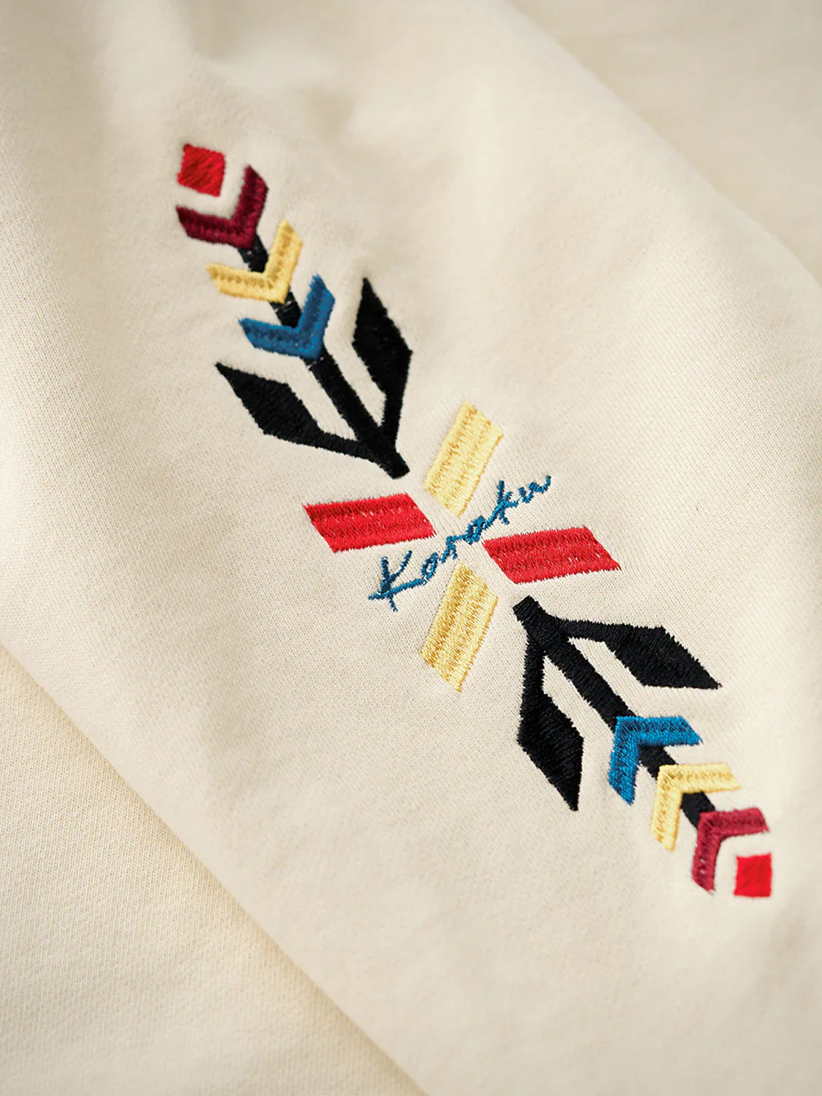 This bold sweatshirt features the Native American symbol “Thunderbird” embroidered on the chest, paired with powerful Navajo-style embroidery on both sleeves. The textured, raised embroidery adds depth and visual impact, making the piece eye-catching even when worn on its own. A classic V-gusset at the neckline gives a subtle sporty touch, balancing out the overall silhouette. Thick ribbed trims in matching tones at the collar, cuffs, and hem enhance its vintage-inspired look. Whether worn solo or layered under a jacket, this piece blends traditional motifs with modern design—true to Karaku's aesthetic.