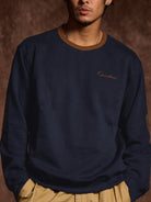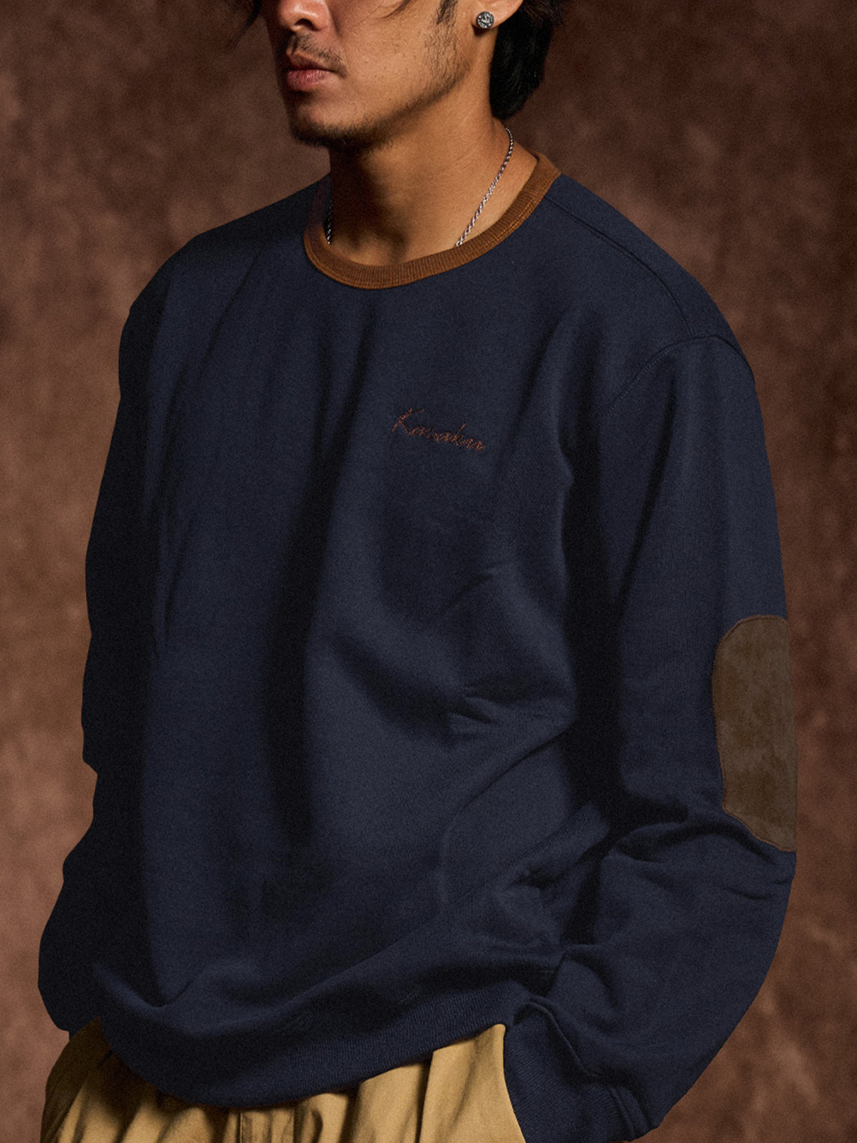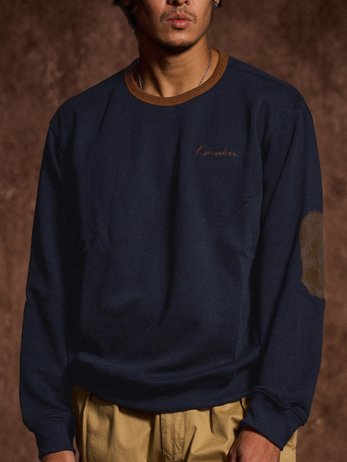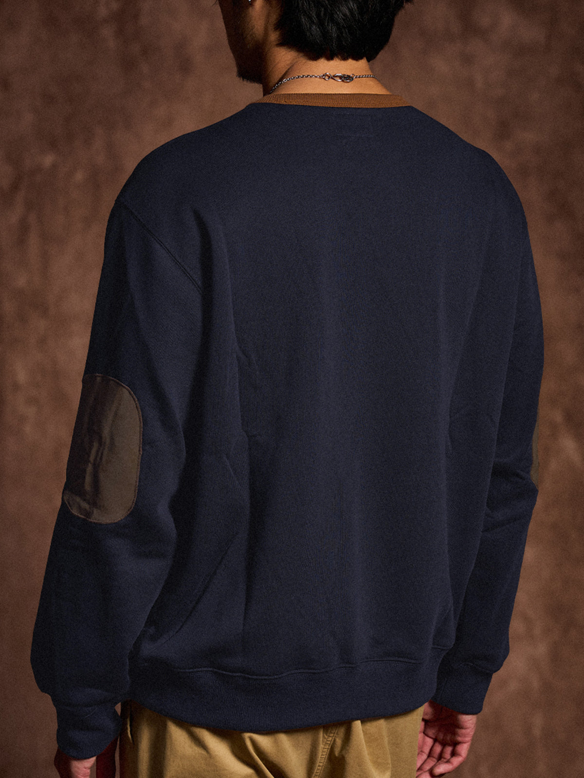 This crewneck sweatshirt features a simple design that makes it easy to pair with a wide range of outfits. The brown rib-knit accents add a subtle touch of contrast. A small chest embroidery showcases the brand’s identity in an understated yet refined way. The elbow patches are softly rounded to fit the shape of the arm, enhancing durability without compromising comfort or mobility. With a relaxed silhouette, it offers a laid-back look and ease of movement, making it perfect for streetwear or casual styles.