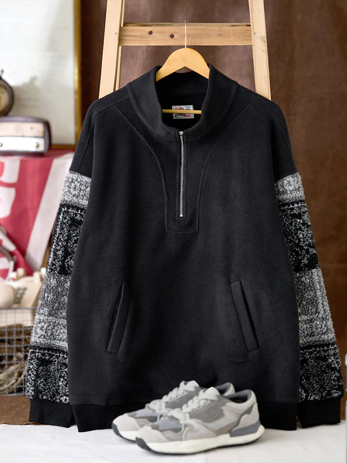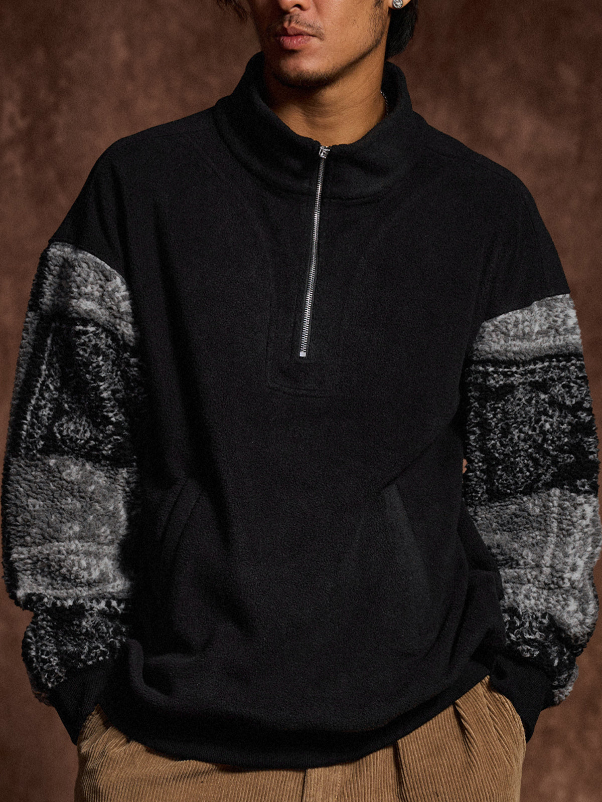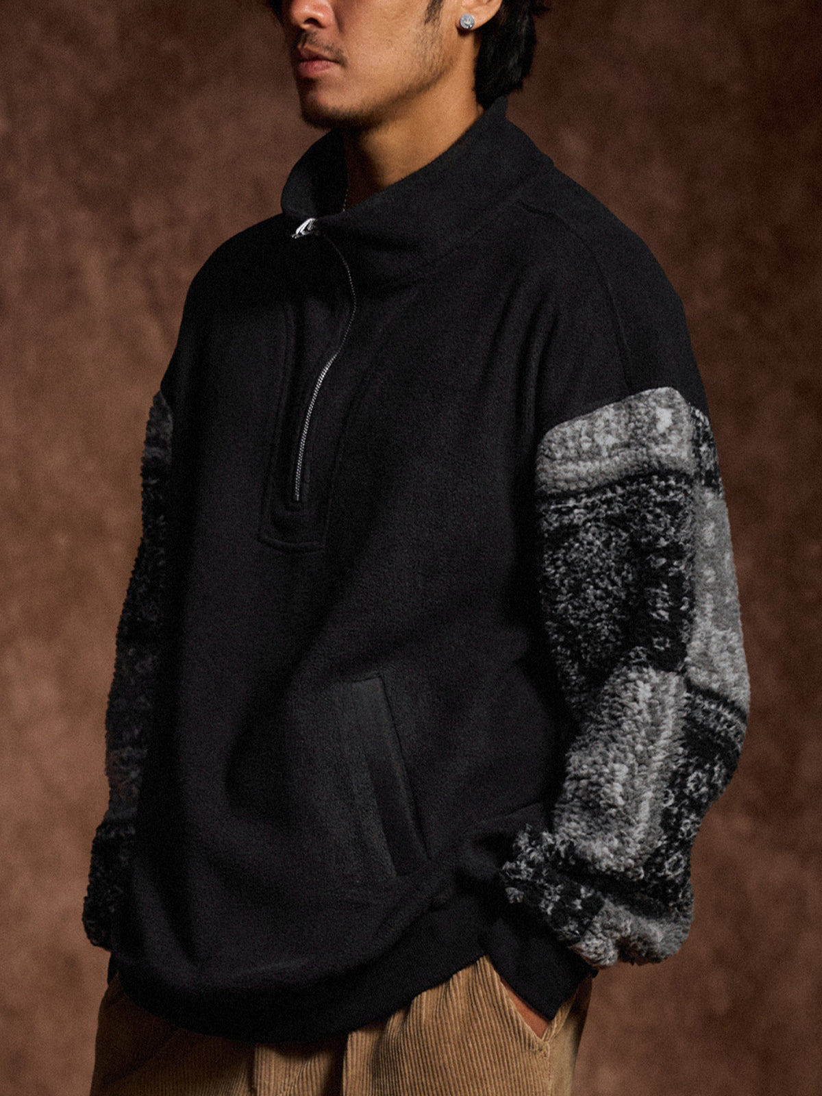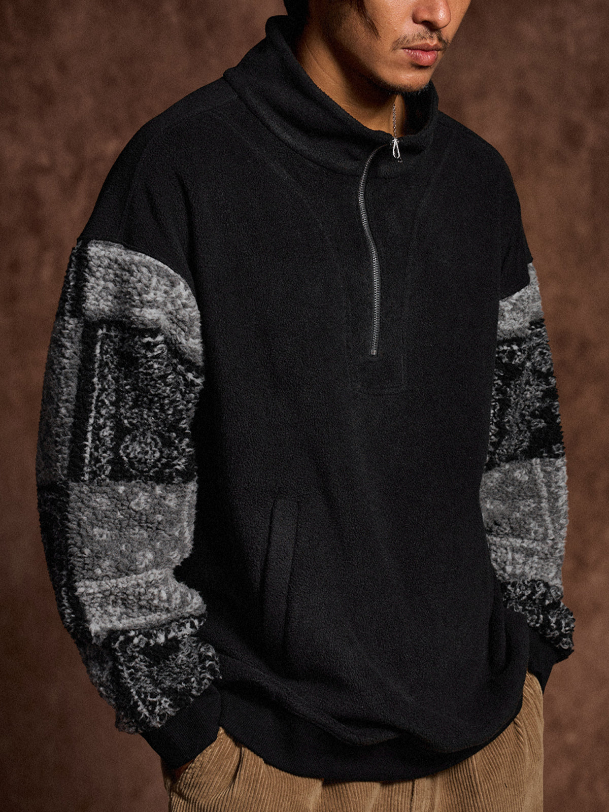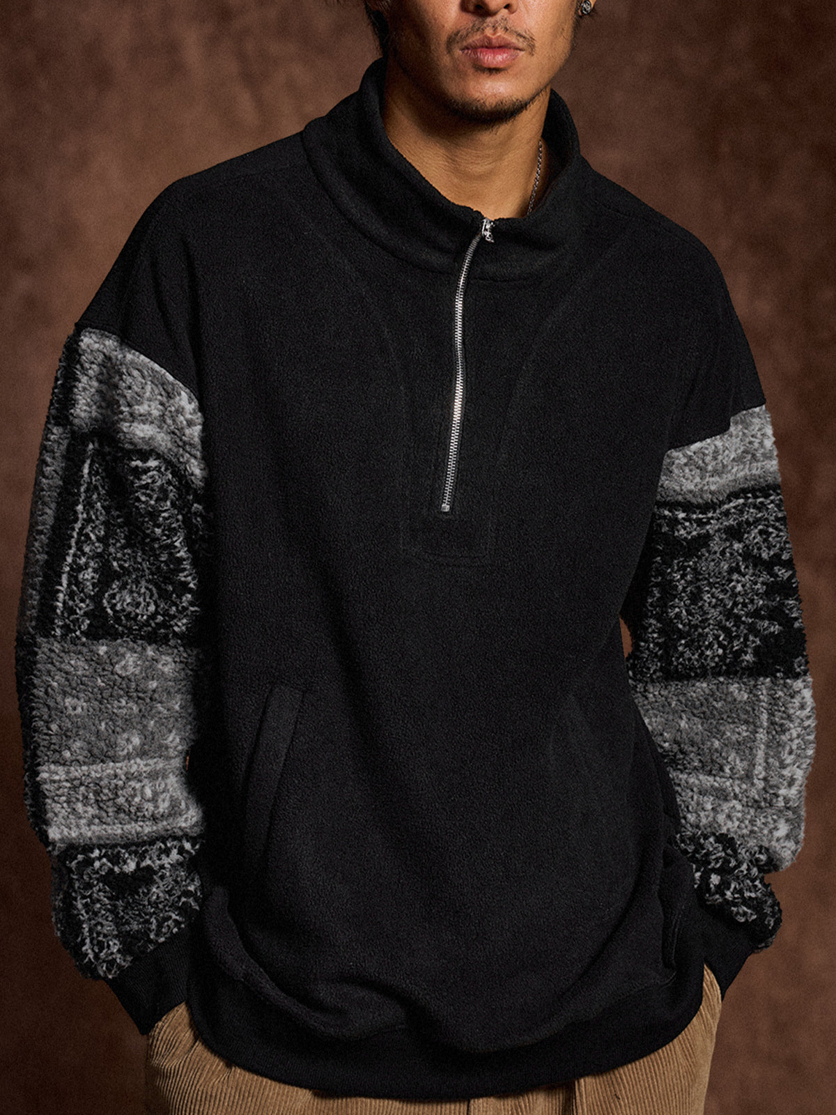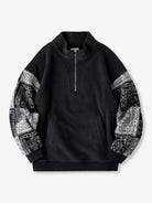 Half-Zip Brushed Fleece Sweatshirt with Paisley Boa Sleeve Panels
