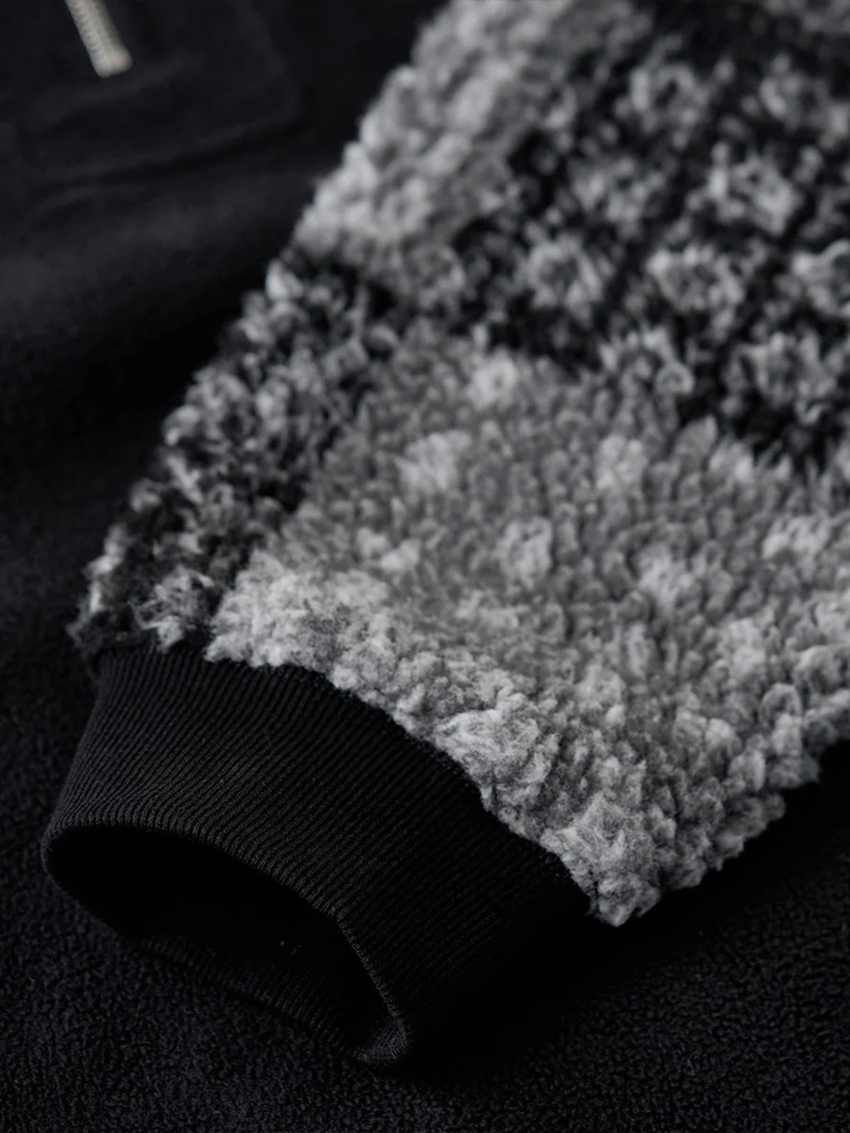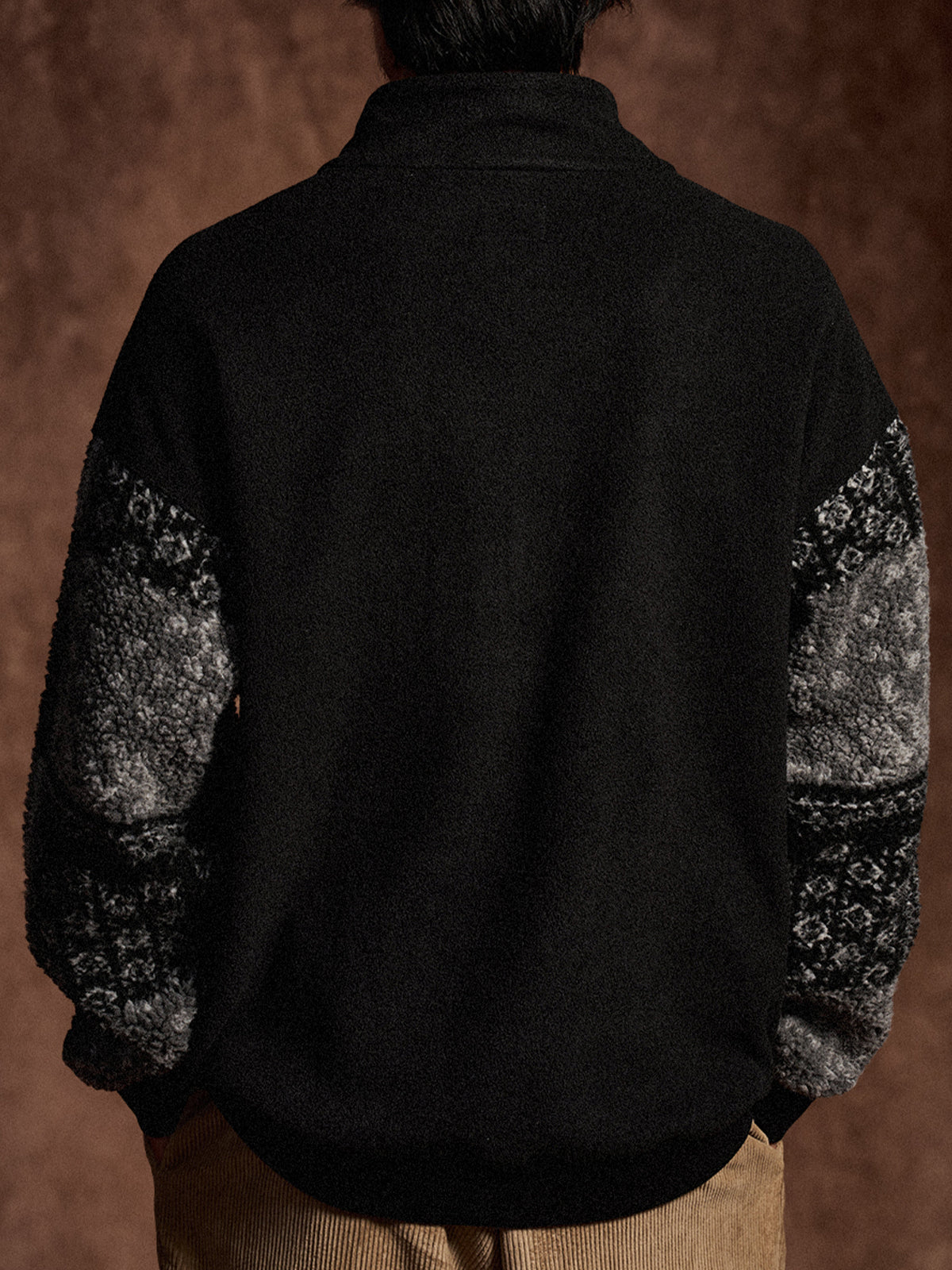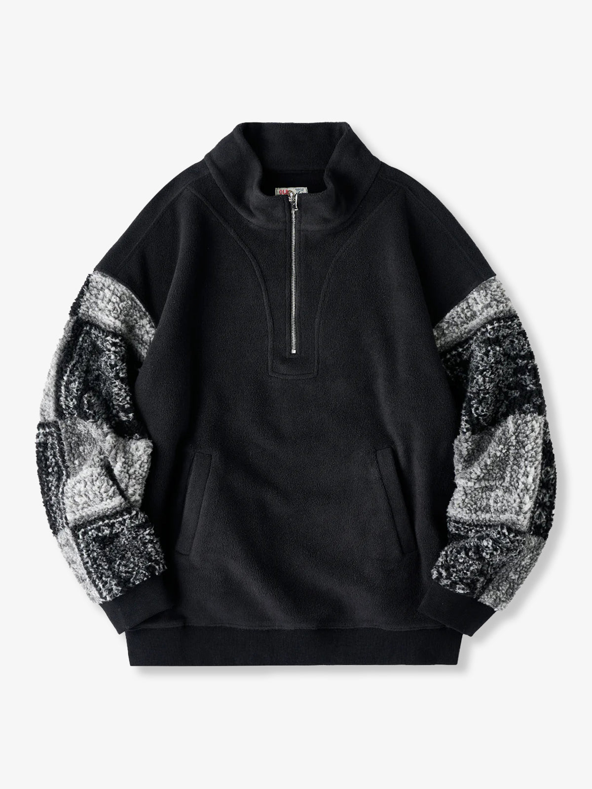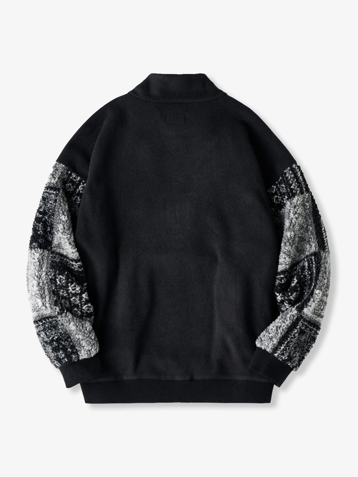 The half-zip design makes layering easy while allowing styling versatility—from casual to sporty moods with just a zip adjustment. The body is crafted from warm yet lightweight fleece, while the sleeves feature a black-and-white paisley pattern in plush boa fabric. This contrast of materials and textures adds a bold accent to an otherwise simple fleece piece. Ribbed cuffs improve fit and block out cold air while ensuring ease of movement.