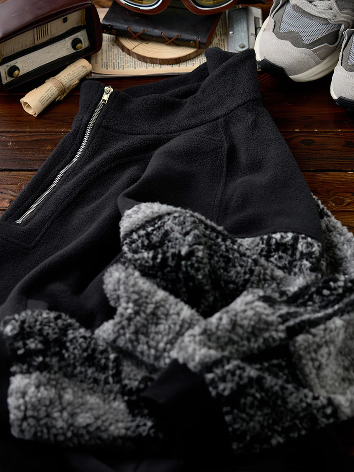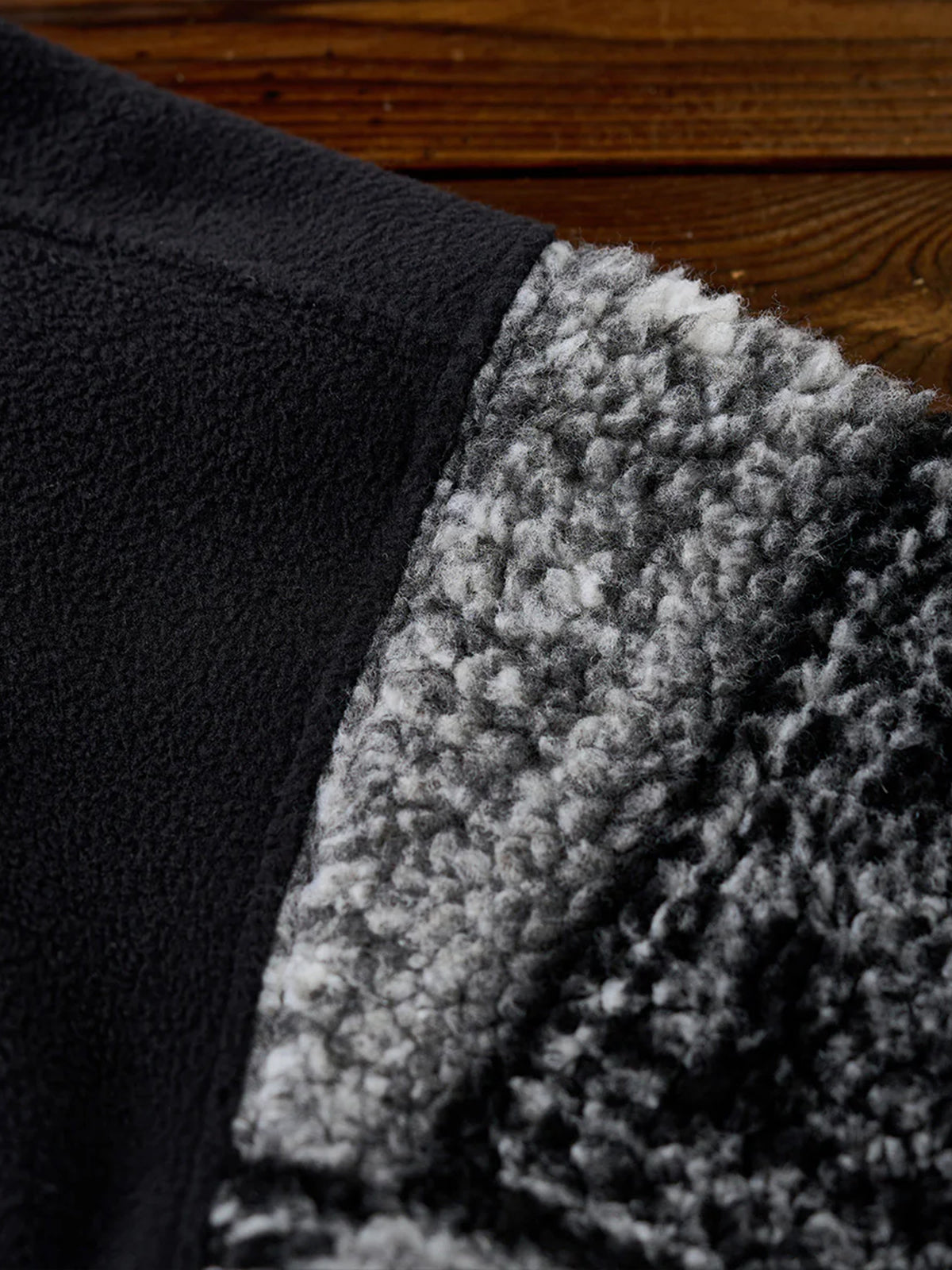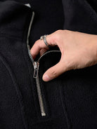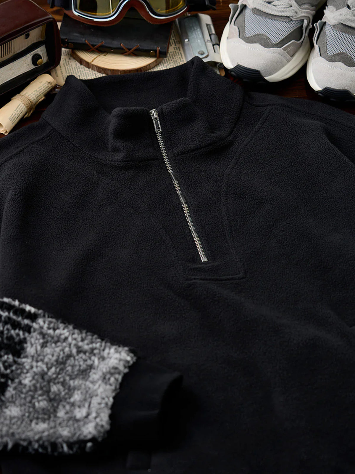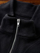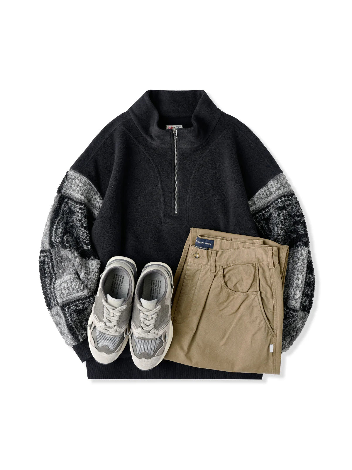 The half-zip design makes layering easy while allowing styling versatility—from casual to sporty moods with just a zip adjustment. The body is crafted from warm yet lightweight fleece, while the sleeves feature a black-and-white paisley pattern in plush boa fabric. This contrast of materials and textures adds a bold accent to an otherwise simple fleece piece. Ribbed cuffs improve fit and block out cold air while ensuring ease of movement.
