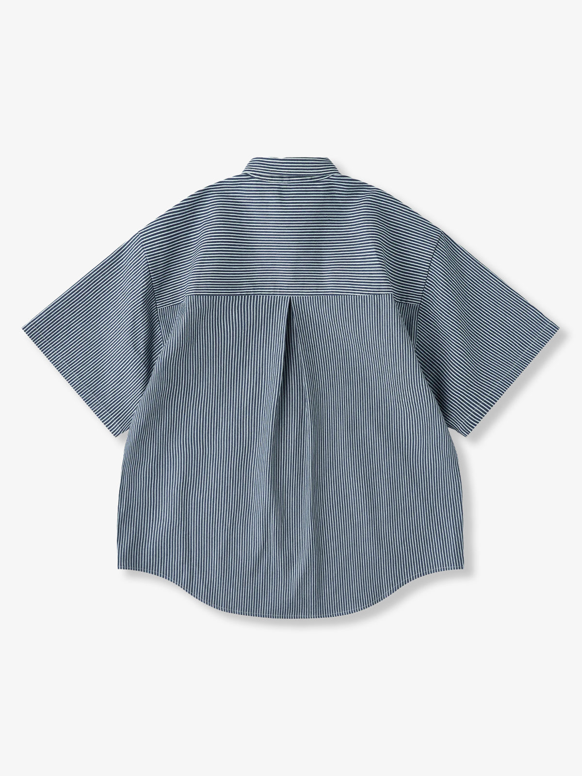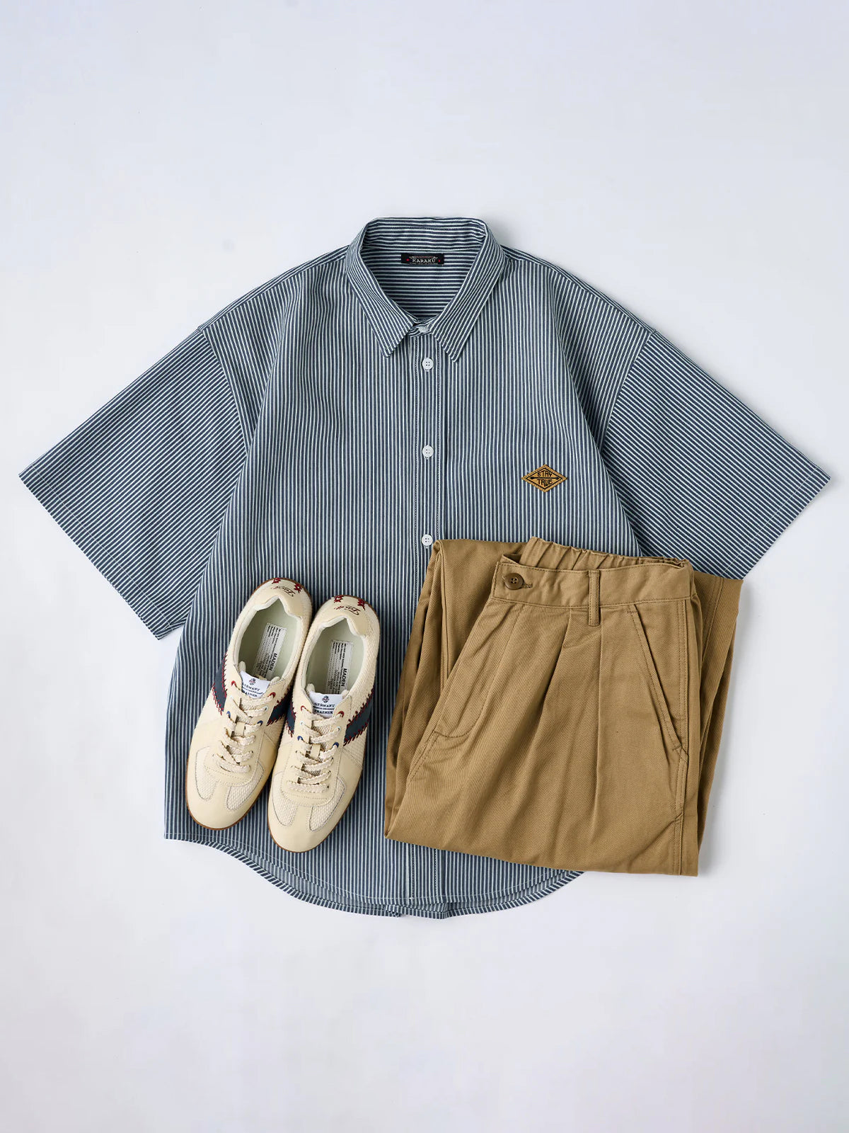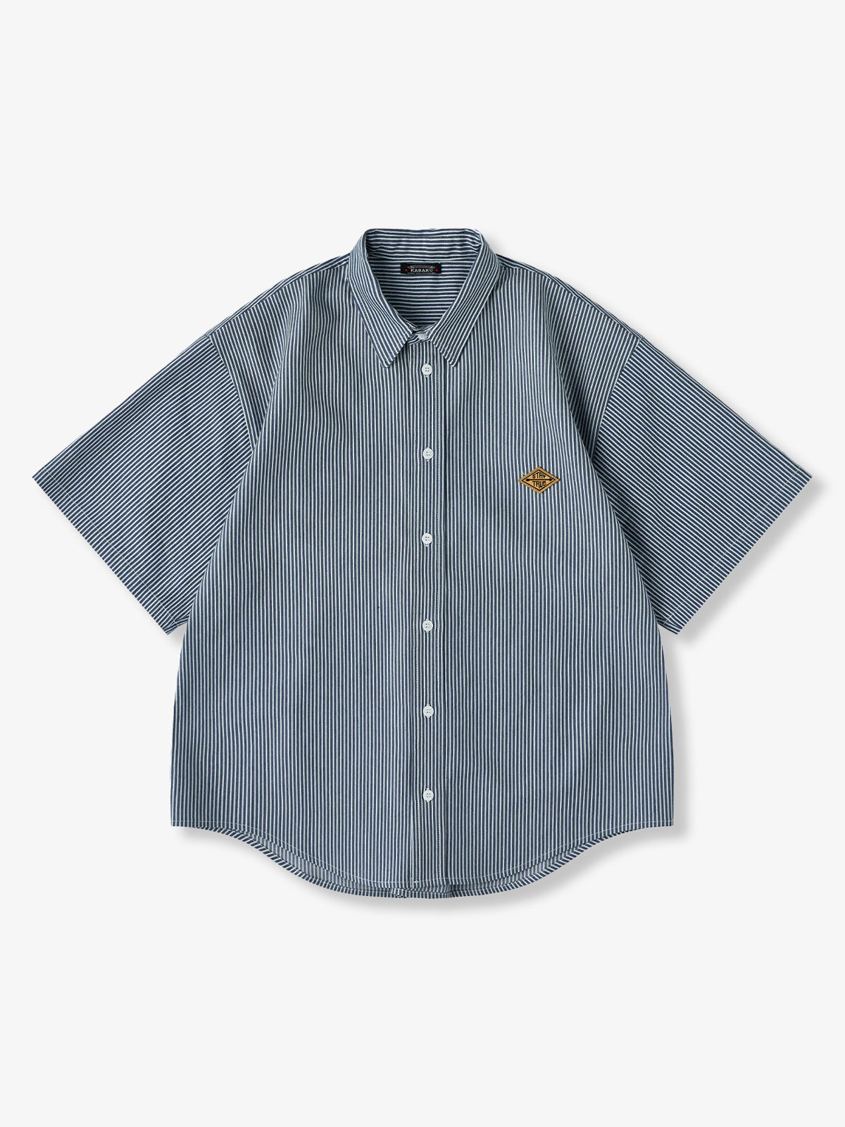 A short-sleeved shirt perfect for summer, combining light cotton material with a refreshing striped pattern. The message "stay true" is embroidered on the chest as a single point, adding a subtle statement to the simple design. The striped pattern on the whole creates a vintage feel, and the old school atmosphere is also one of its charms. The silhouette is a big fit with a moderate amount of room. It gives a trendy balance while giving a wide range of styling options. It is a piece that you can enjoy a fresh style, not only by wearing it alone, but also by wearing it over a T-shirt.