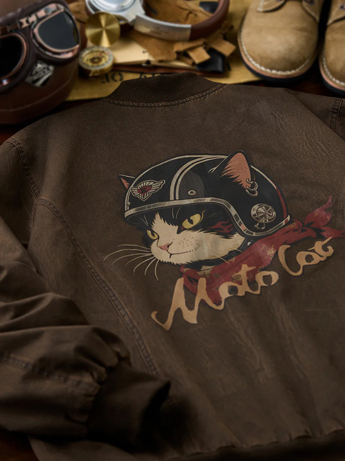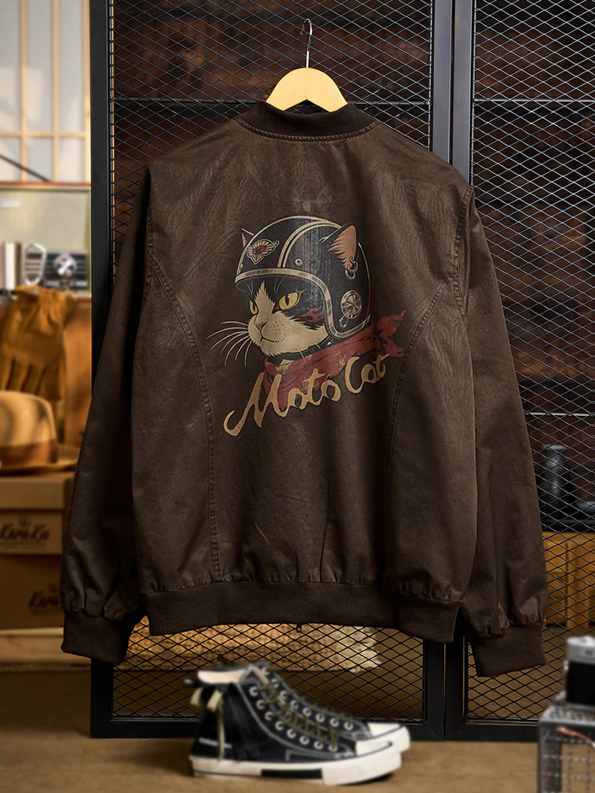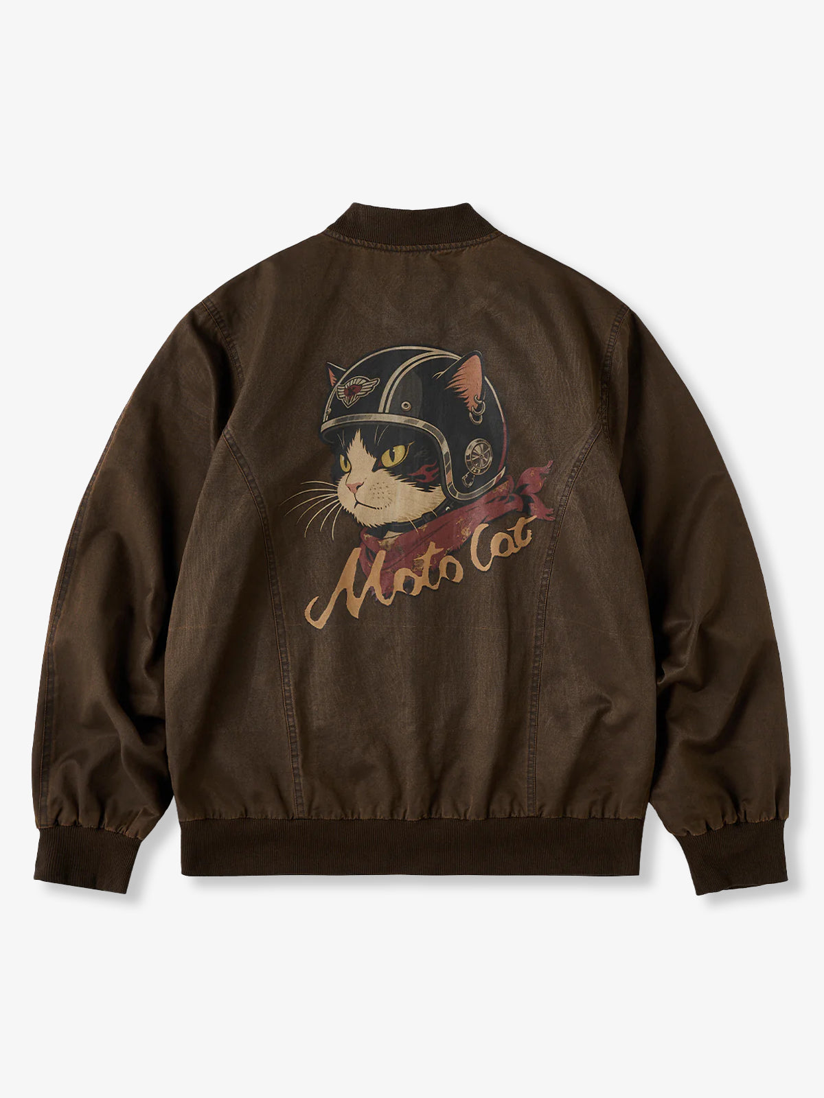 [Pre-Order] “Helmet Cat” Print Washed Double-Zip Stadium Jacket