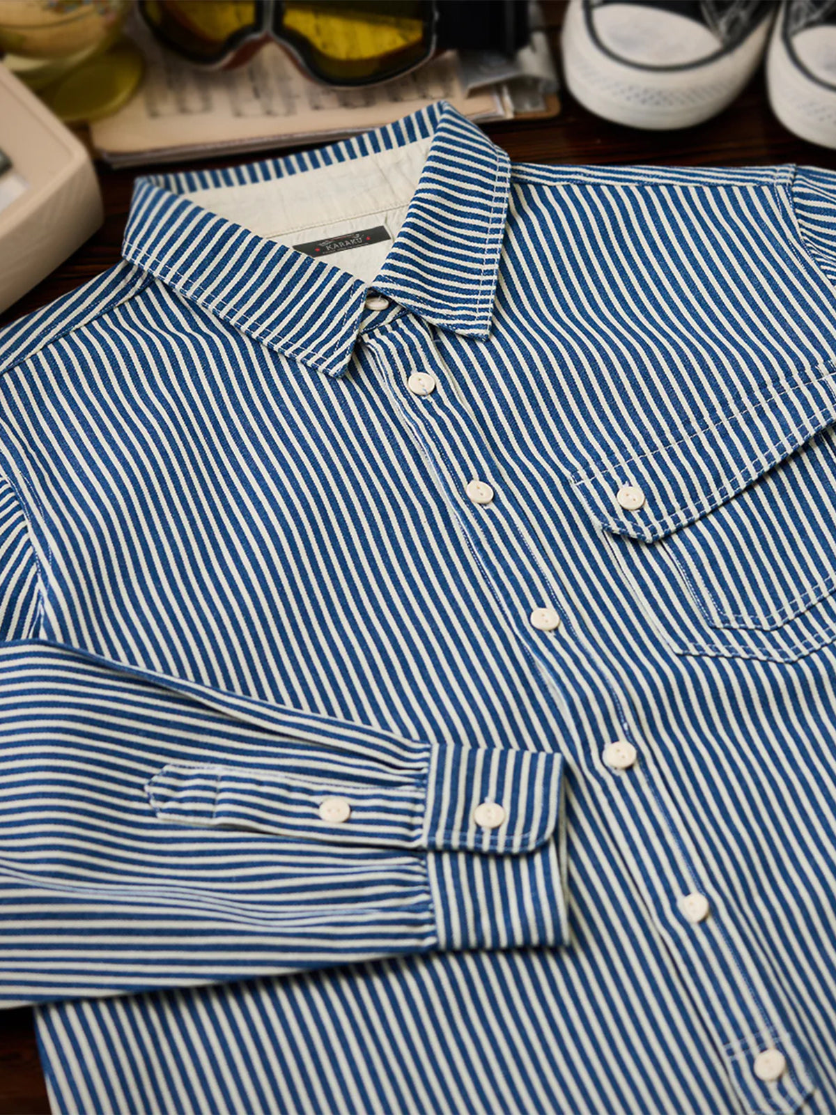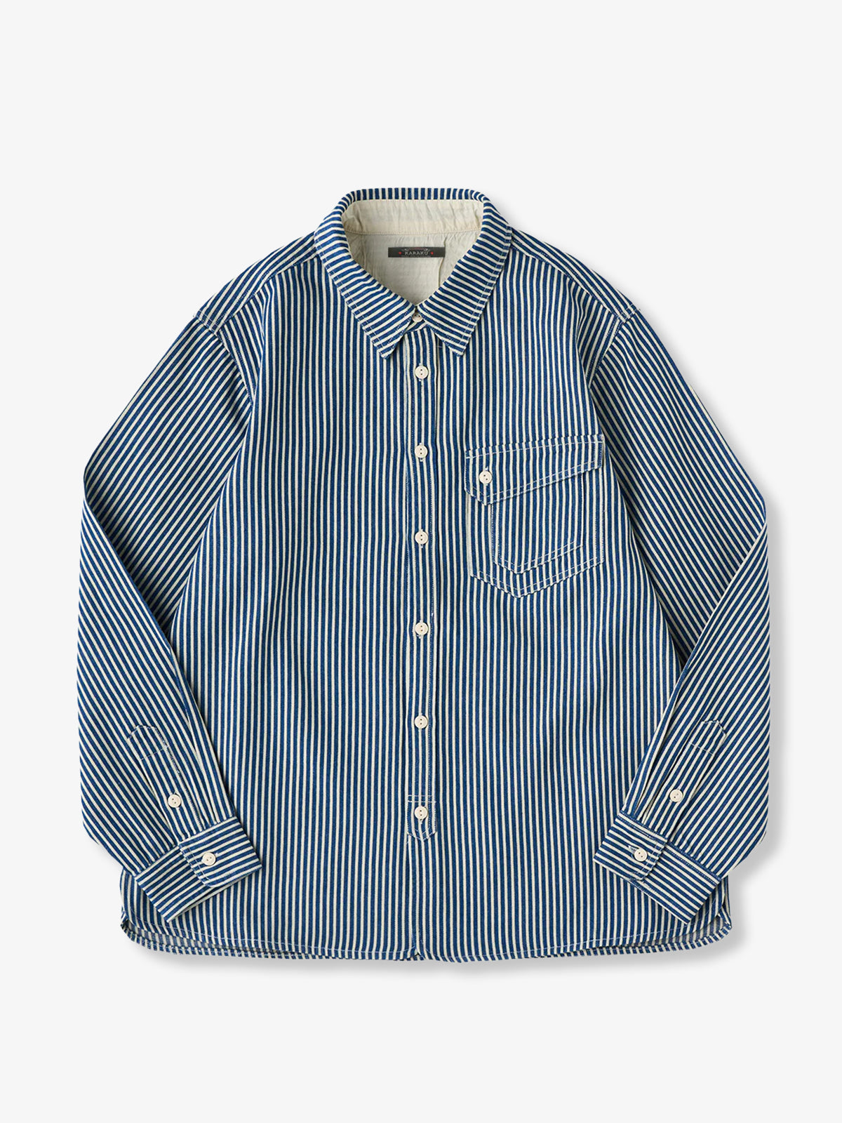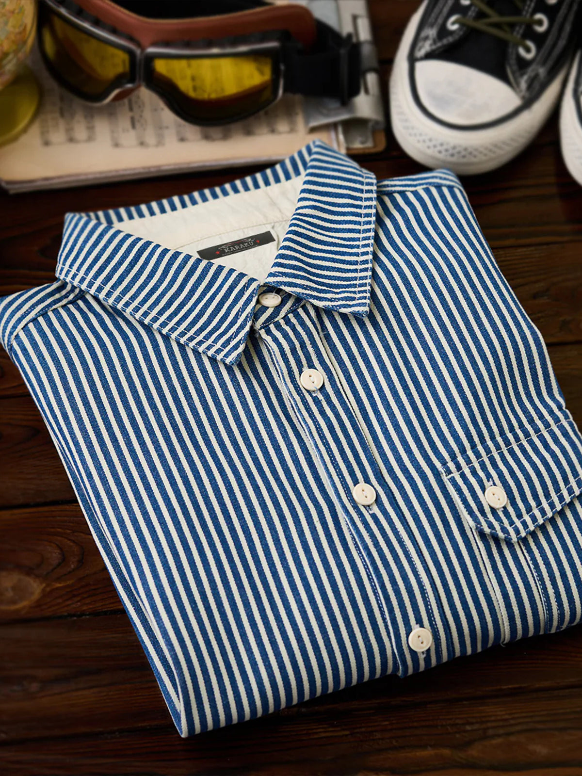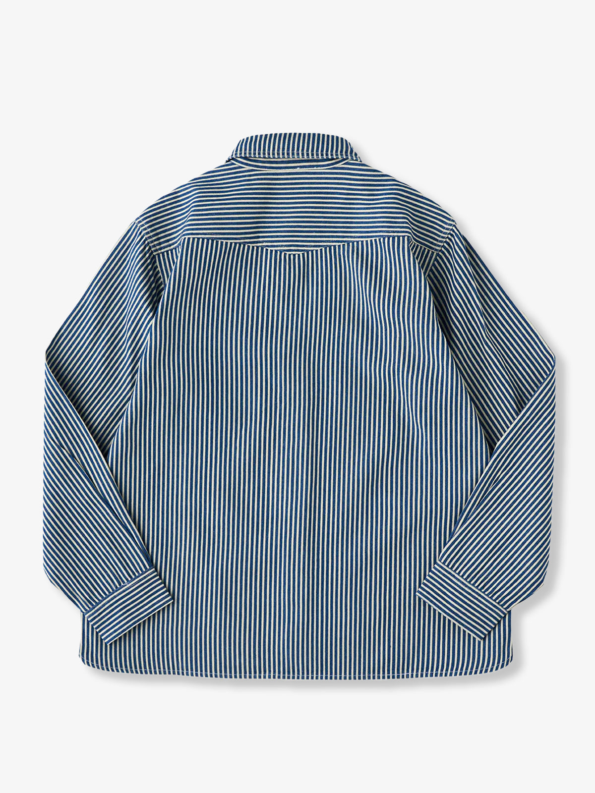 The "Striped Pattern Navy Blue CPO Twill Denim Shirt" is a modern layout of the classic military style, combining functionality and fashion. It has a slightly loose size and a large flap pocket on the chest, which is often symbolically used as a reminder of ships and sailing, and retains the characteristics unique to navy-derived products and firmly follows the details. Simple and exquisite details can be used in a variety of styles, from casual to fashionable.