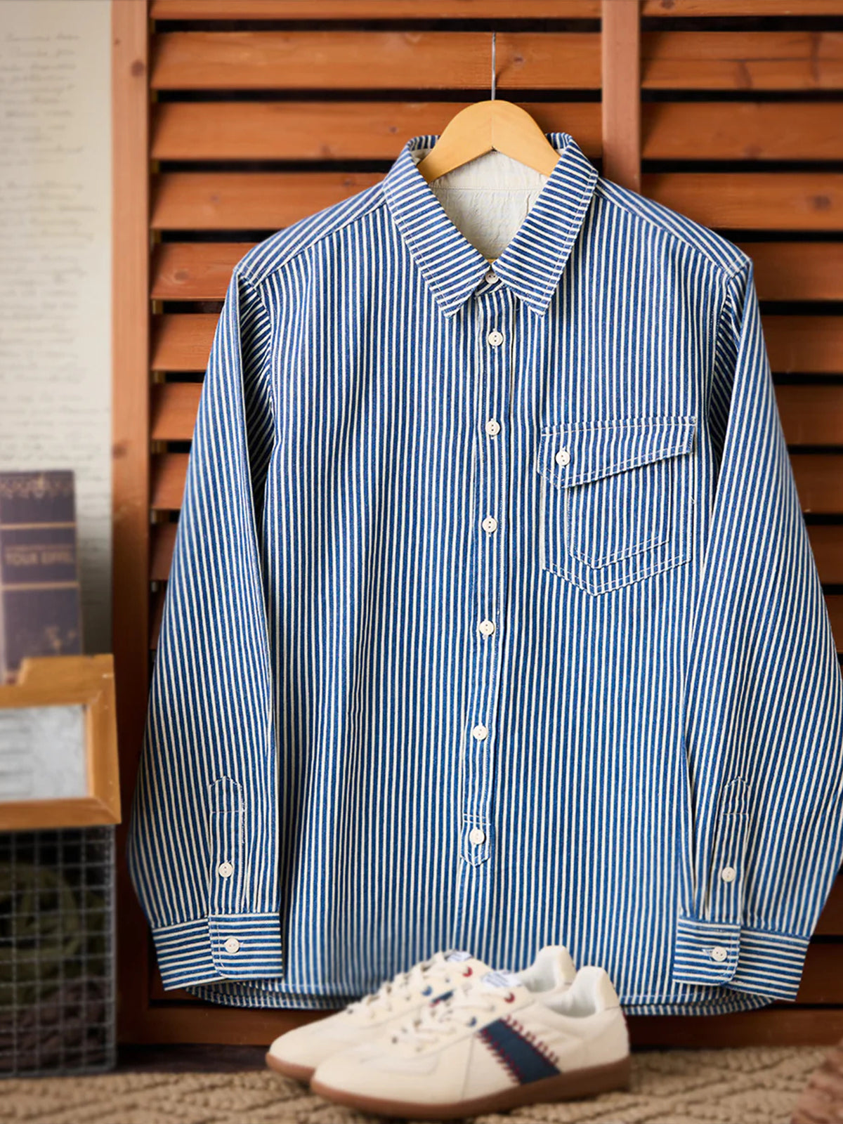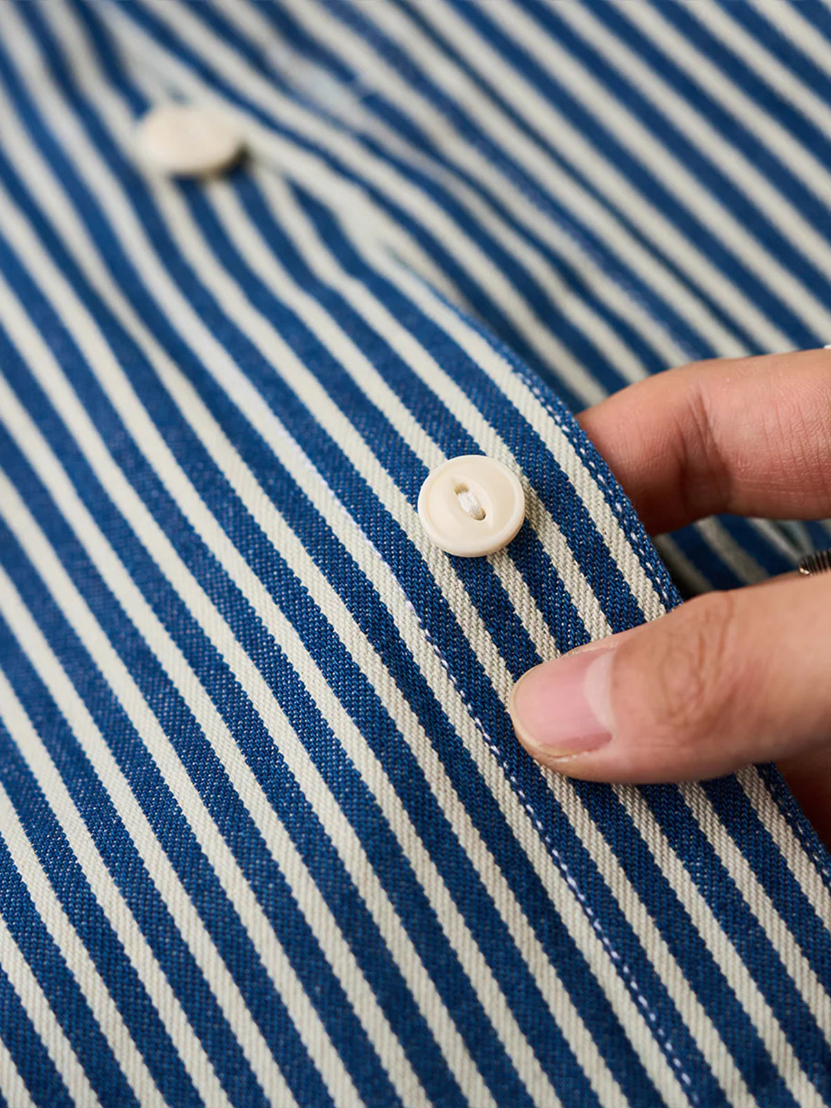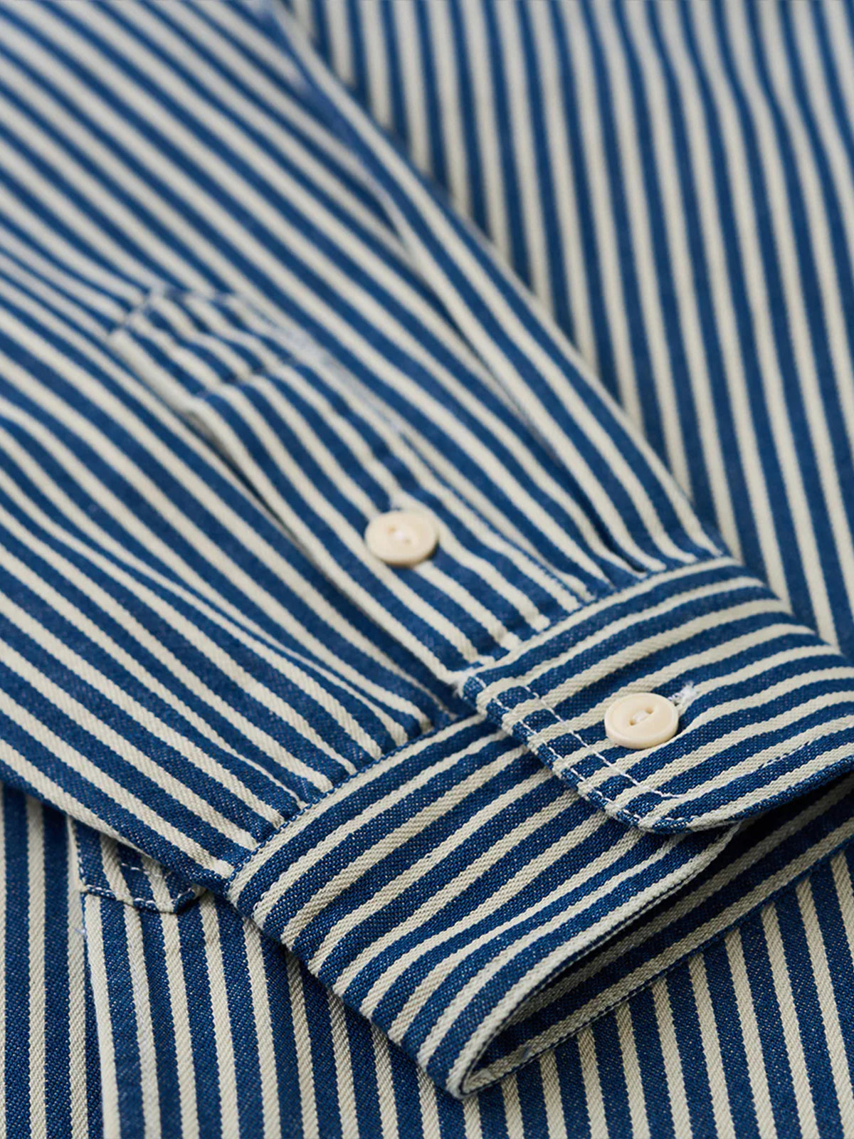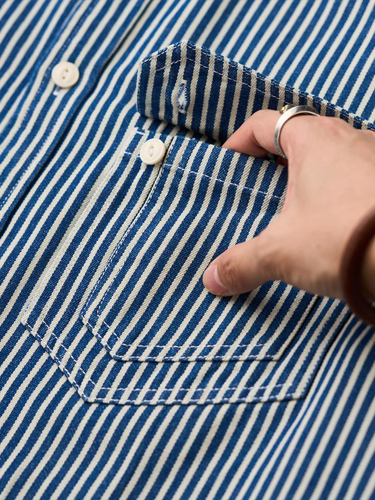 The "Striped Pattern Navy Blue CPO Twill Denim Shirt" is a modern layout of the classic military style, combining functionality and fashion. It has a slightly loose size and a large flap pocket on the chest, which is often symbolically used as a reminder of ships and sailing, and retains the characteristics unique to navy-derived products and firmly follows the details. Simple and exquisite details can be used in a variety of styles, from casual to fashionable.