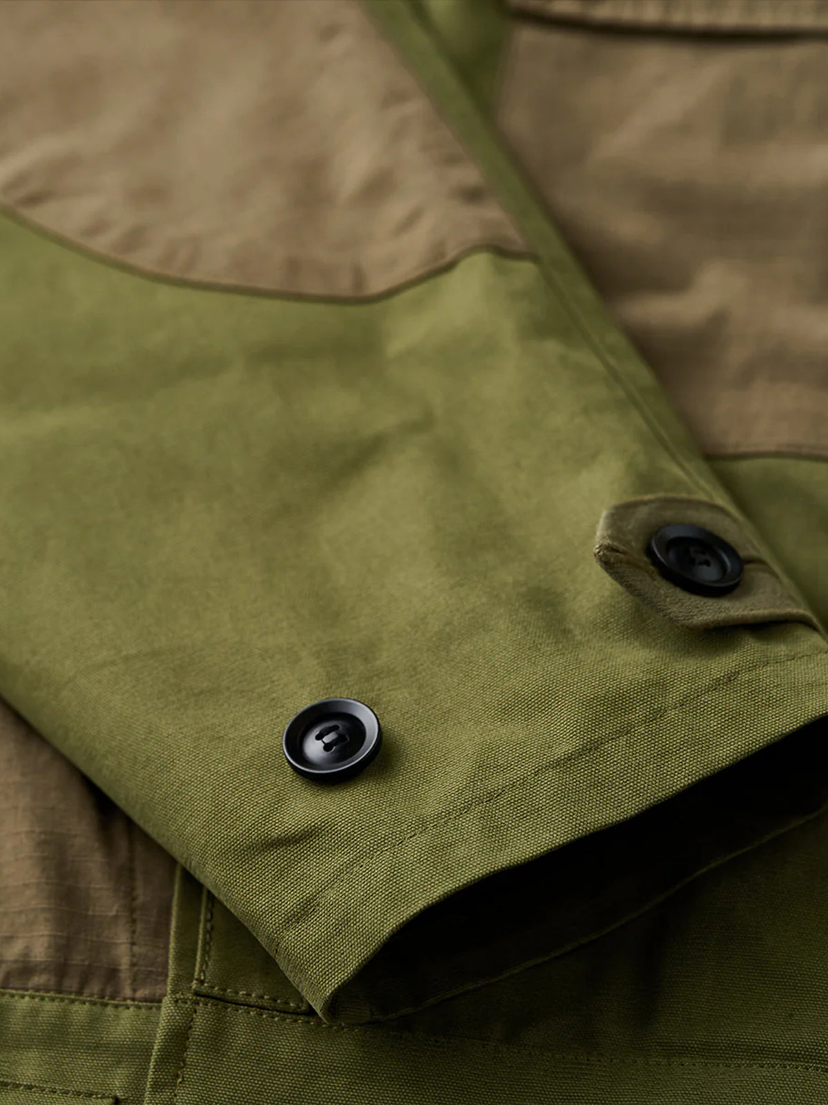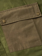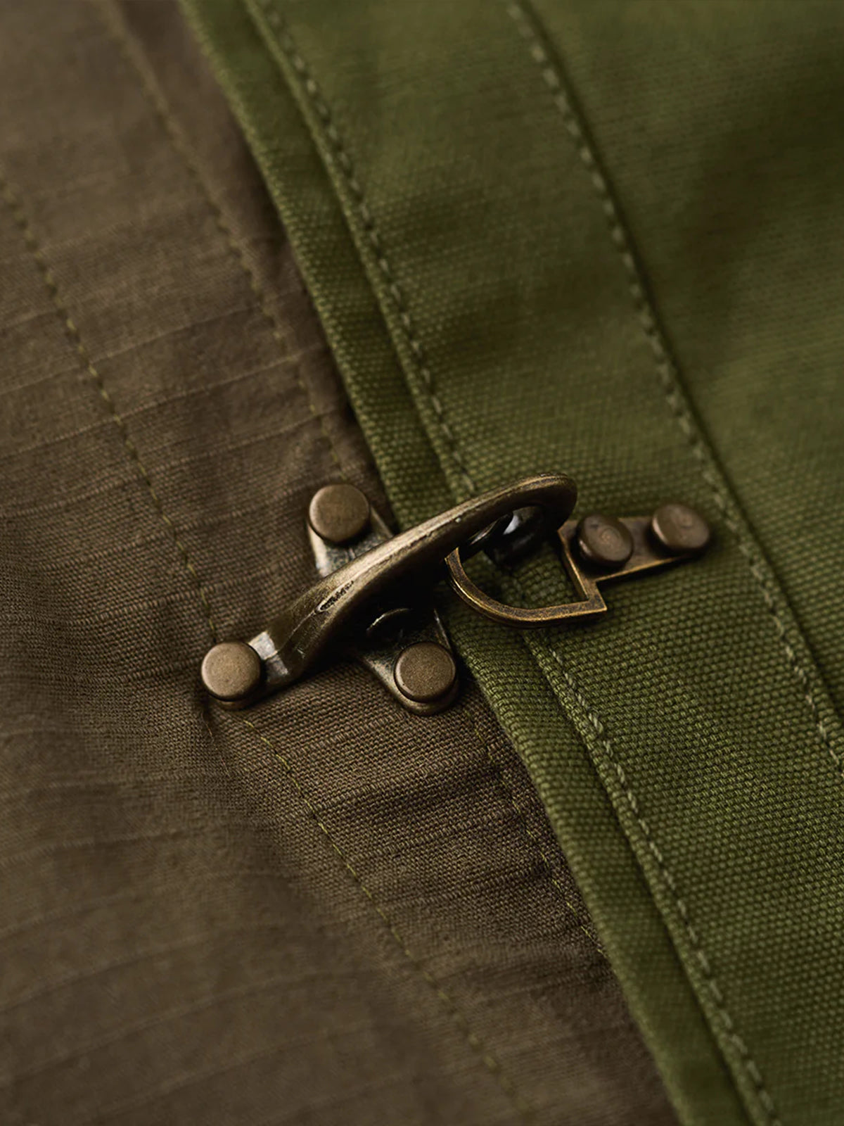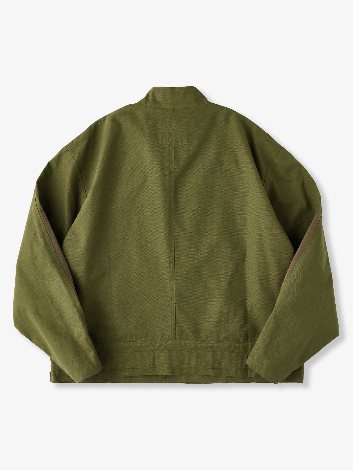 A revival piece based on the 1960s Swedish Army motorcycle jacket. The asymmetric front enhances wind protection while giving the jacket a rugged military presence. Distinctive hook buttons add a utilitarian workwear touch, while the body in military green canvas is contrasted with khaki cotton piqué panels for a unique material combination. The color contrast keeps the vintage military essence yet updates it with a modern feel. Designed in a relaxed, cropped silhouette that works both true to size or oversized for a bold look, this jacket is perfect for those seeking an outerwear piece with weight and character rarely found in modern garments.