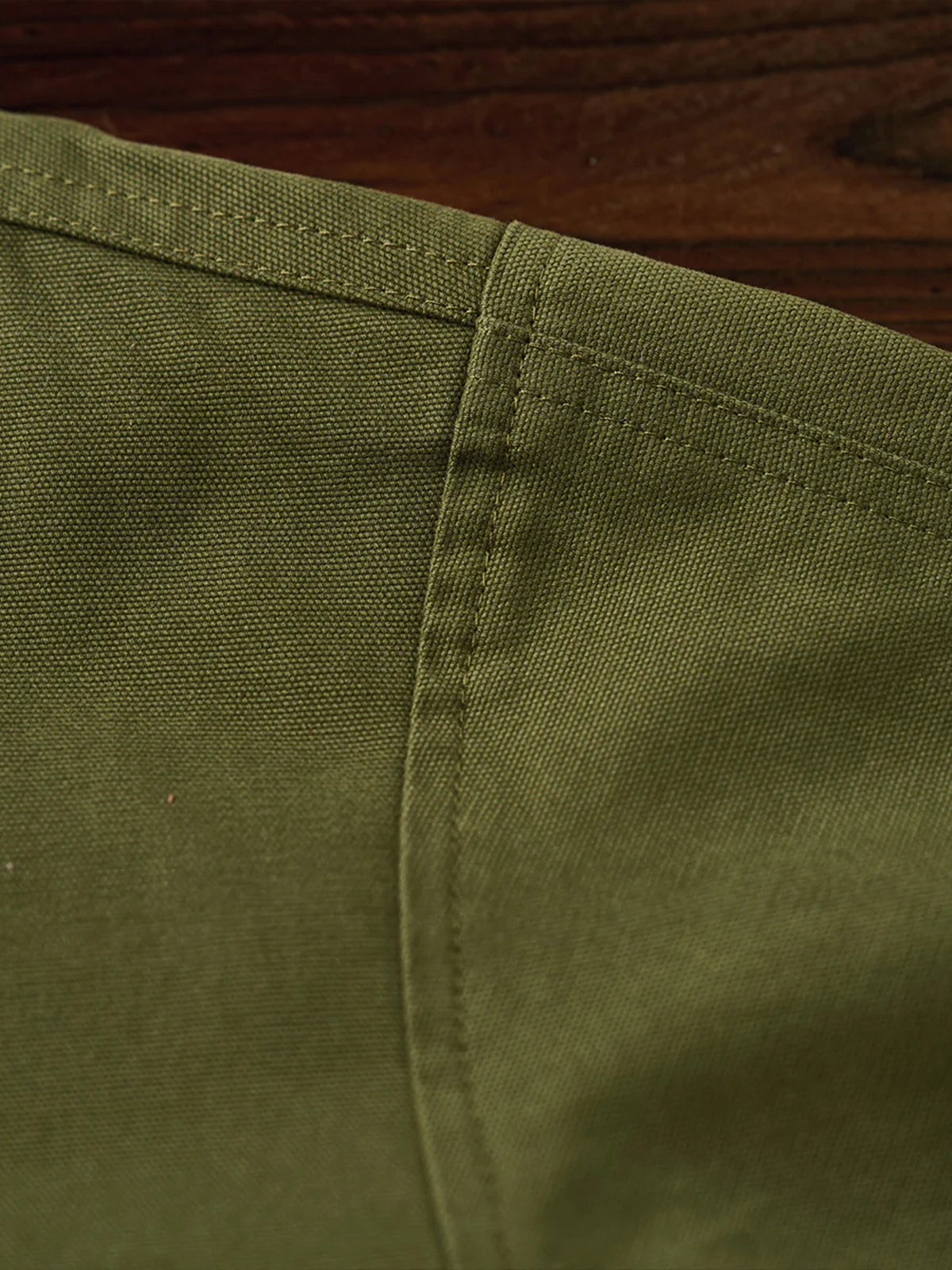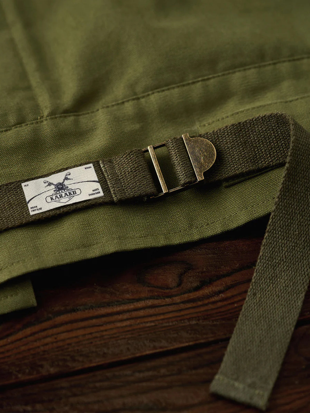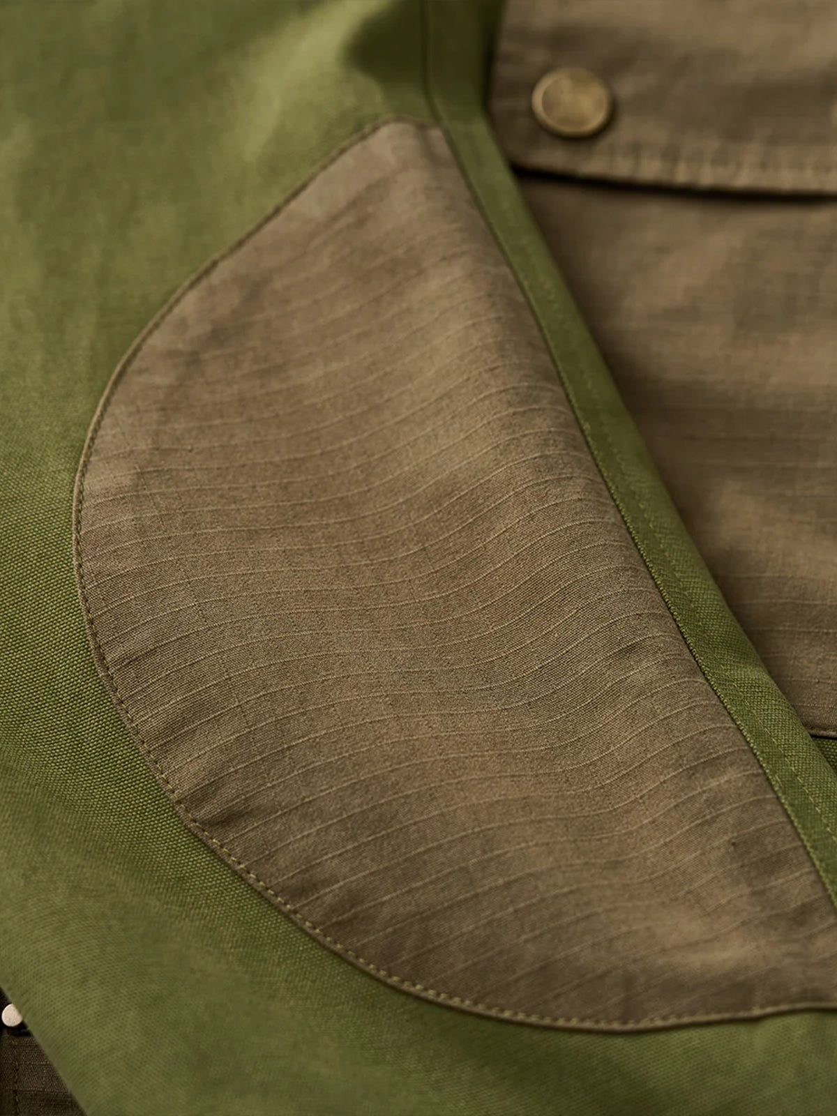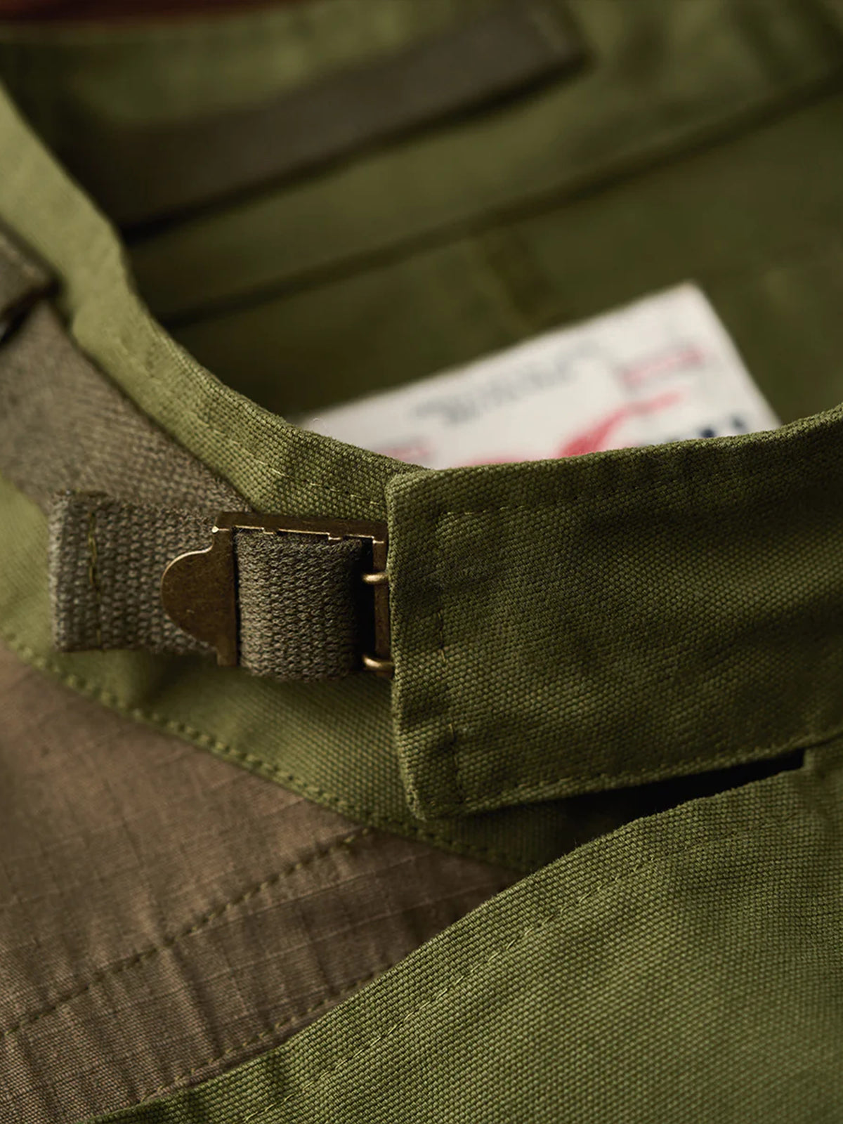 A revival piece based on the 1960s Swedish Army motorcycle jacket. The asymmetric front enhances wind protection while giving the jacket a rugged military presence. Distinctive hook buttons add a utilitarian workwear touch, while the body in military green canvas is contrasted with khaki cotton piqué panels for a unique material combination. The color contrast keeps the vintage military essence yet updates it with a modern feel. Designed in a relaxed, cropped silhouette that works both true to size or oversized for a bold look, this jacket is perfect for those seeking an outerwear piece with weight and character rarely found in modern garments.