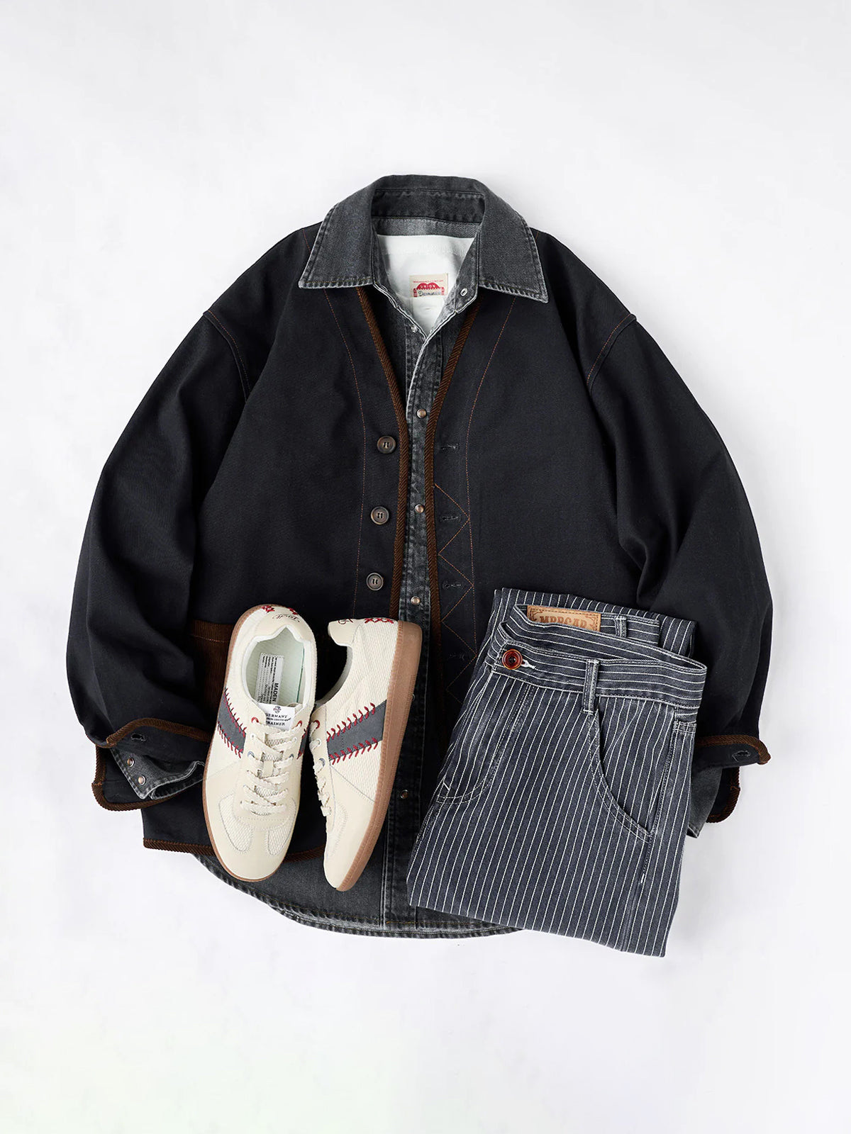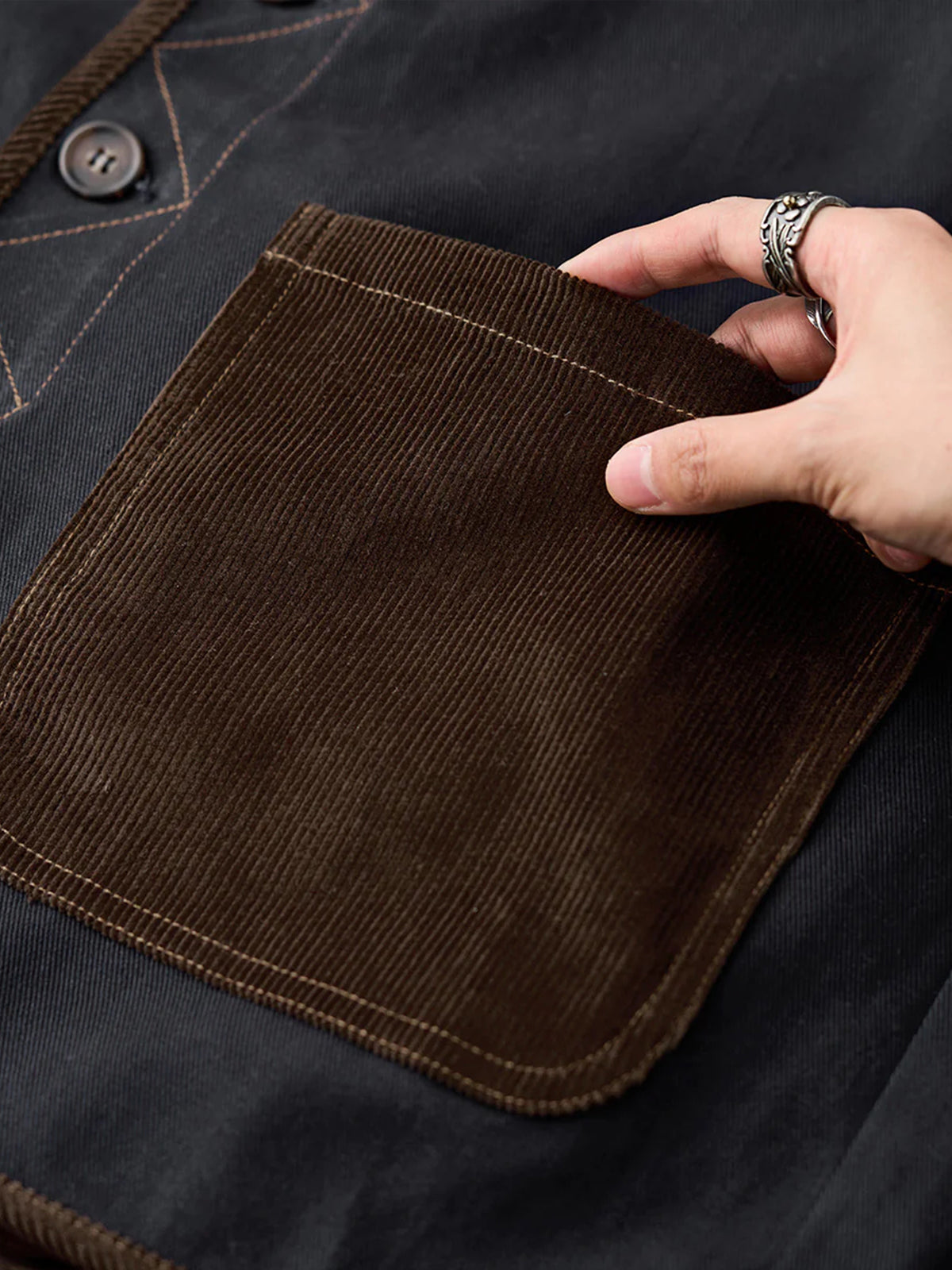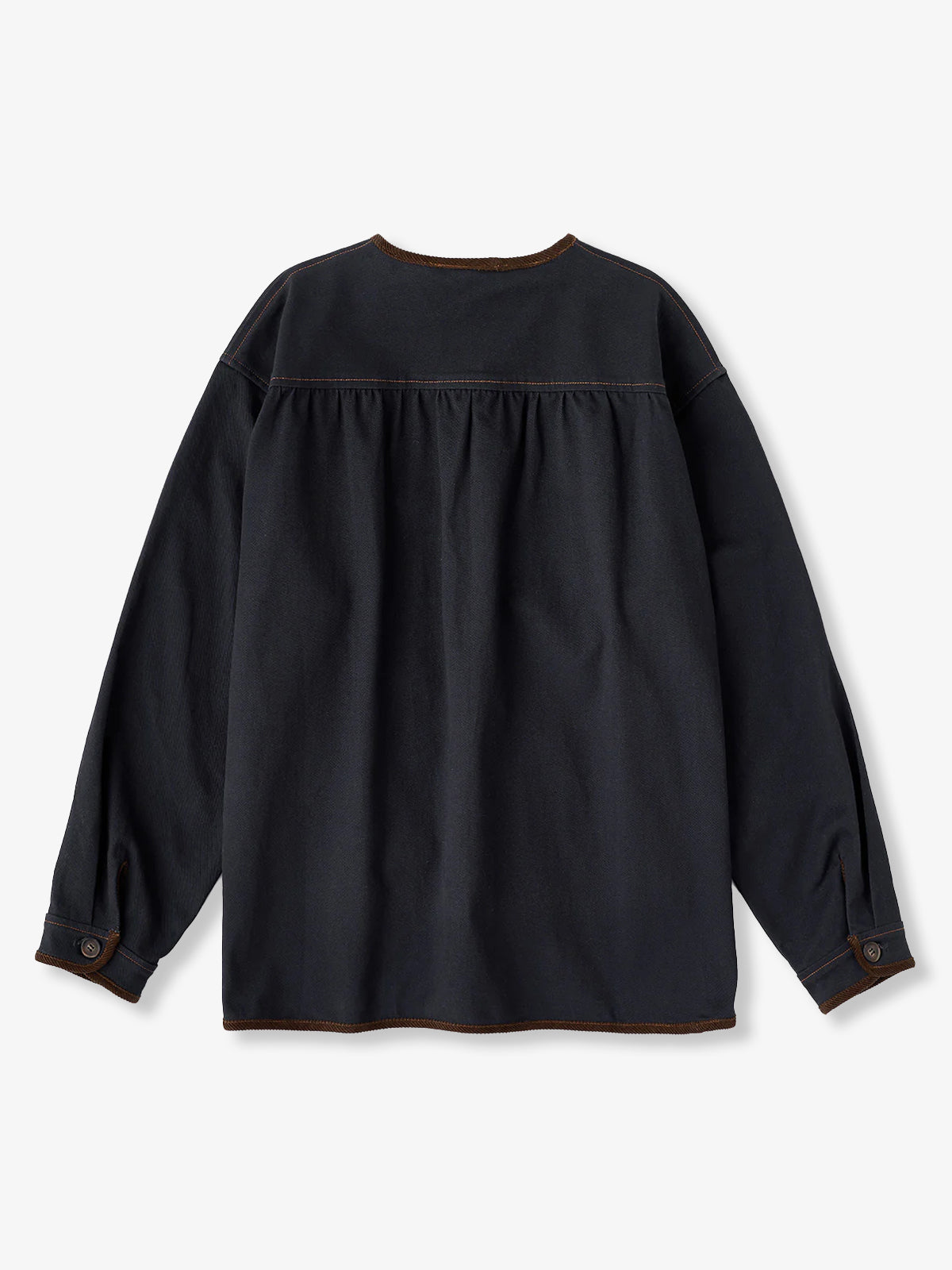 A collarless denim jacket that combines sophisticated design with casual appeal. The front pocket is made of corduroy material, and the switch between different materials is a nice accent. The placket uses zigzag stitching, which combines a sense of craftsmanship and durability. In addition, by adopting color matching buttons, it shines with personality even when casual. The colorless specification is attractive because of its simplicity, allowing you to freely enjoy the coordination of the inner layer and the neck. It is perfect for matching with casual T-shirts and turtlenecks, as well as layering styles with shirts and sweatshirts.