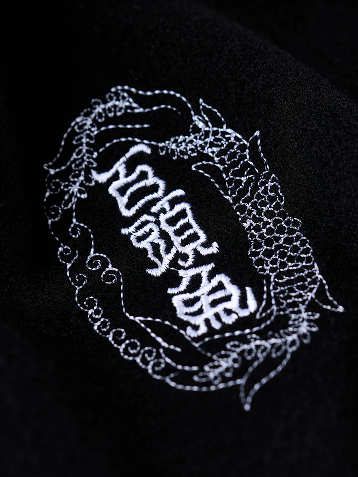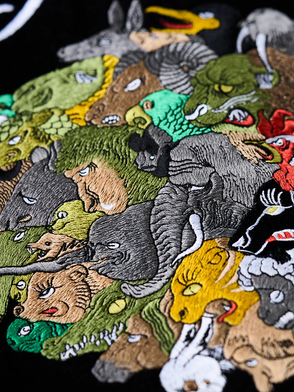 The back showcases a striking embroidery of the “Hundred-Headed Fish,” its body formed by the faces of one hundred different animals. Each face is rendered with distinct personality, symbolizing the “chaos and harmony of life.” The use of sharp, delicate contour lines follows the rhythmic line work typical of ukiyo-e artists.