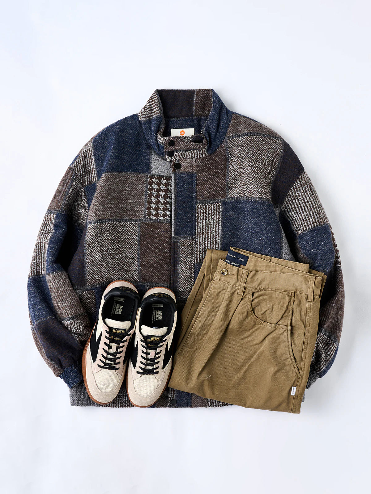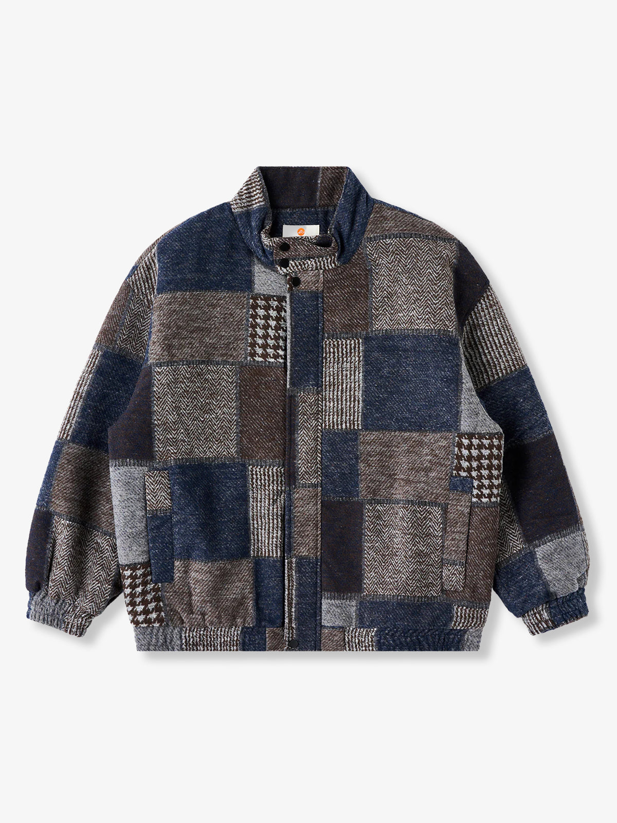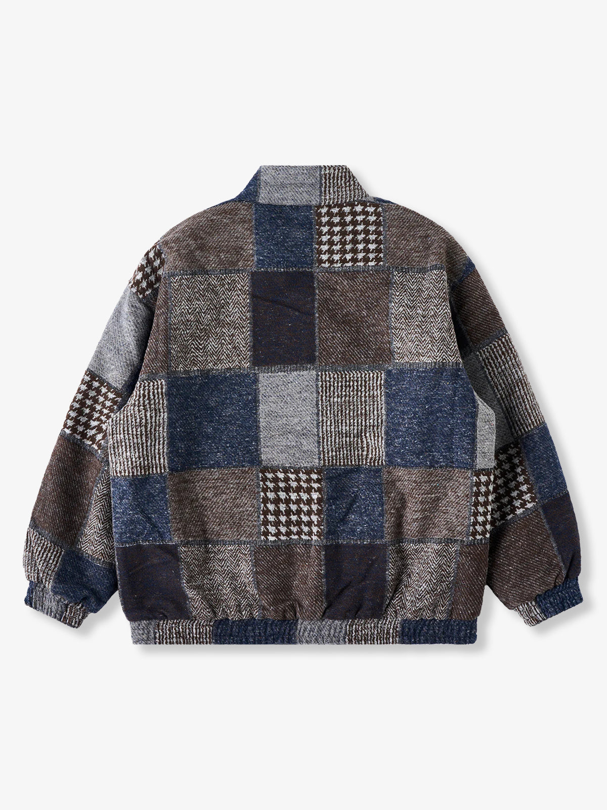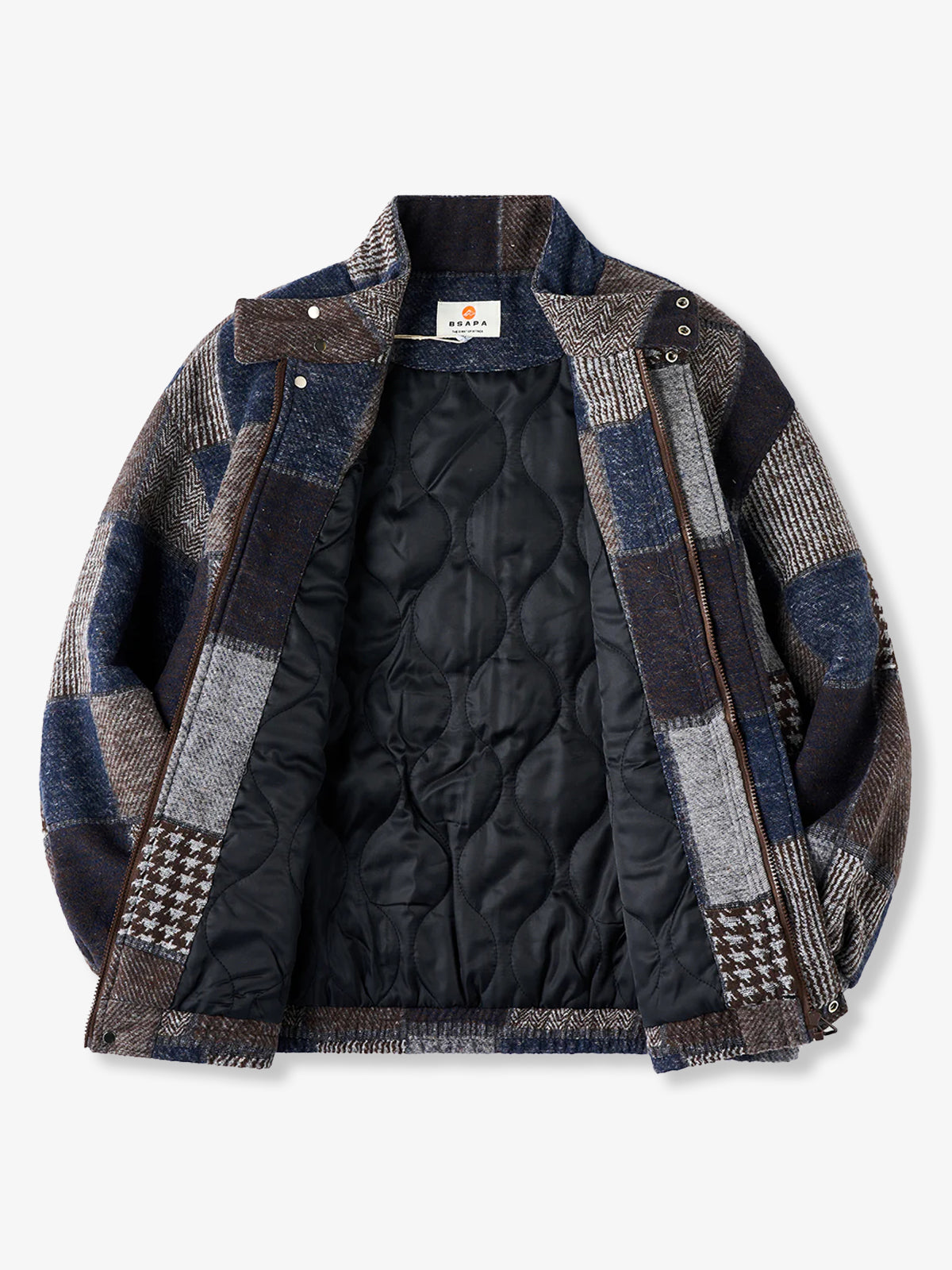 A standout Boro-style stand-collar jacket featuring a patchwork design that combines different woven patterns. The outer fabric skillfully blends multiple vintage-inspired weaves, creating a unique character and depth. The high stand collar provides excellent wind protection while adding a sharp, refined look to your outfit. This Karaku patchwork padded jacket merges vintage aesthetics with modern functionality.