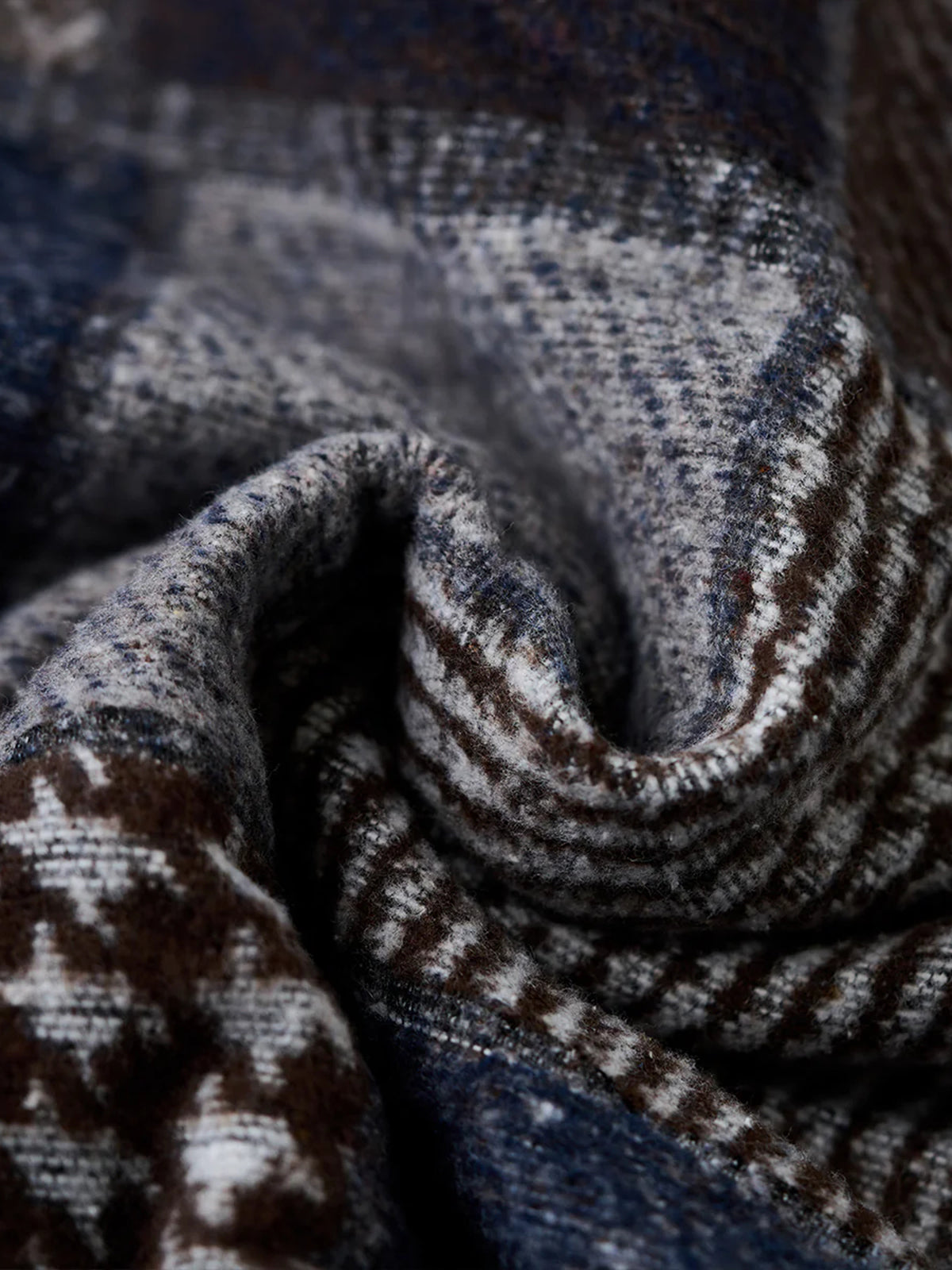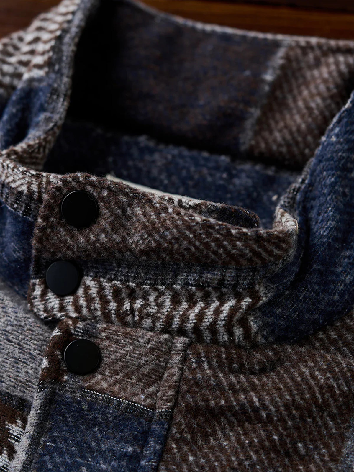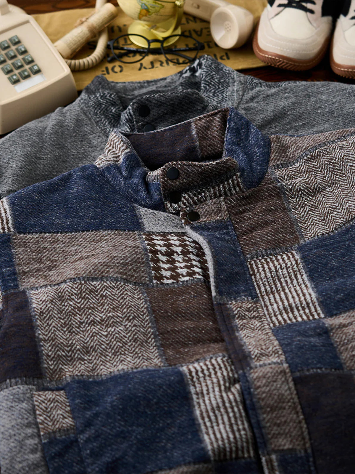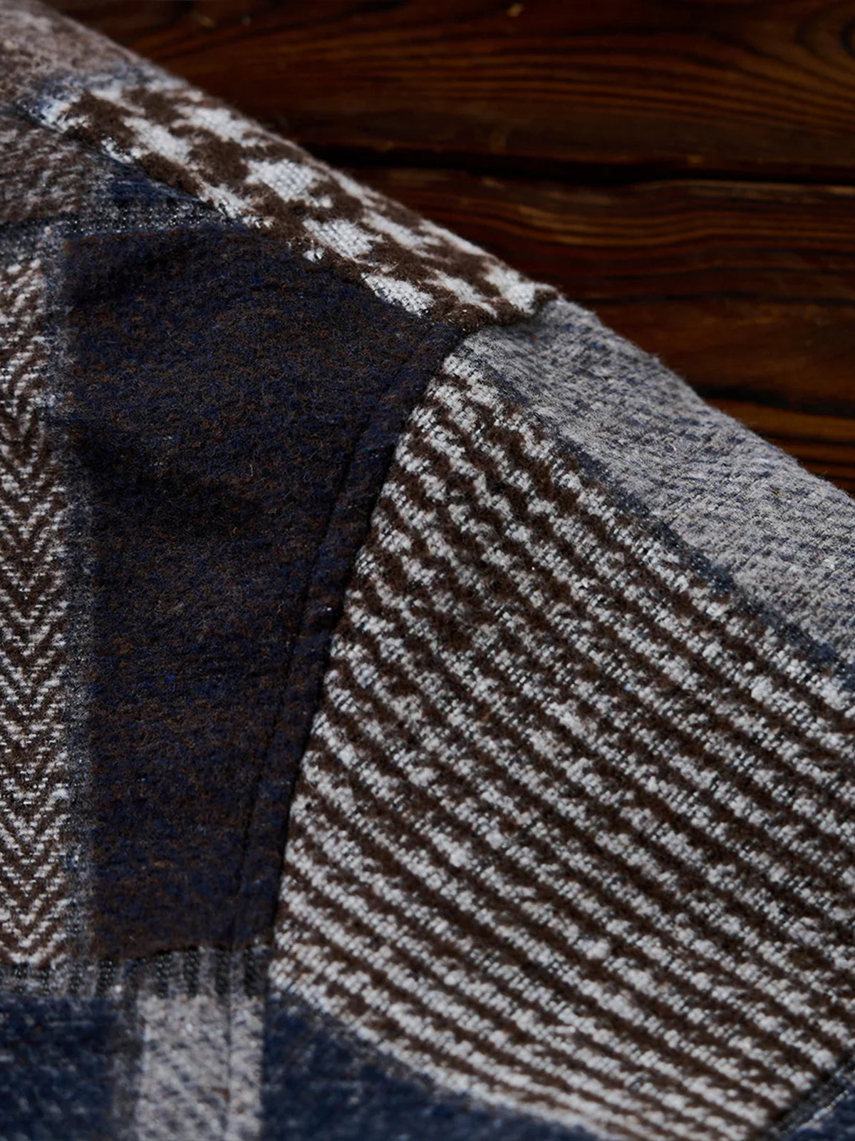 A standout Boro-style stand-collar jacket featuring a patchwork design that combines different woven patterns. The outer fabric skillfully blends multiple vintage-inspired weaves, creating a unique character and depth. The high stand collar provides excellent wind protection while adding a sharp, refined look to your outfit. This Karaku patchwork padded jacket merges vintage aesthetics with modern functionality.