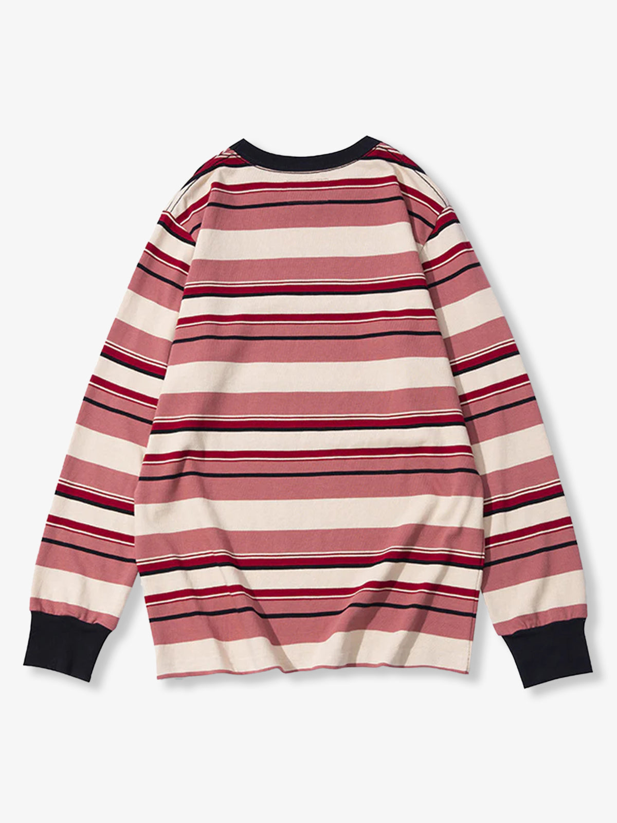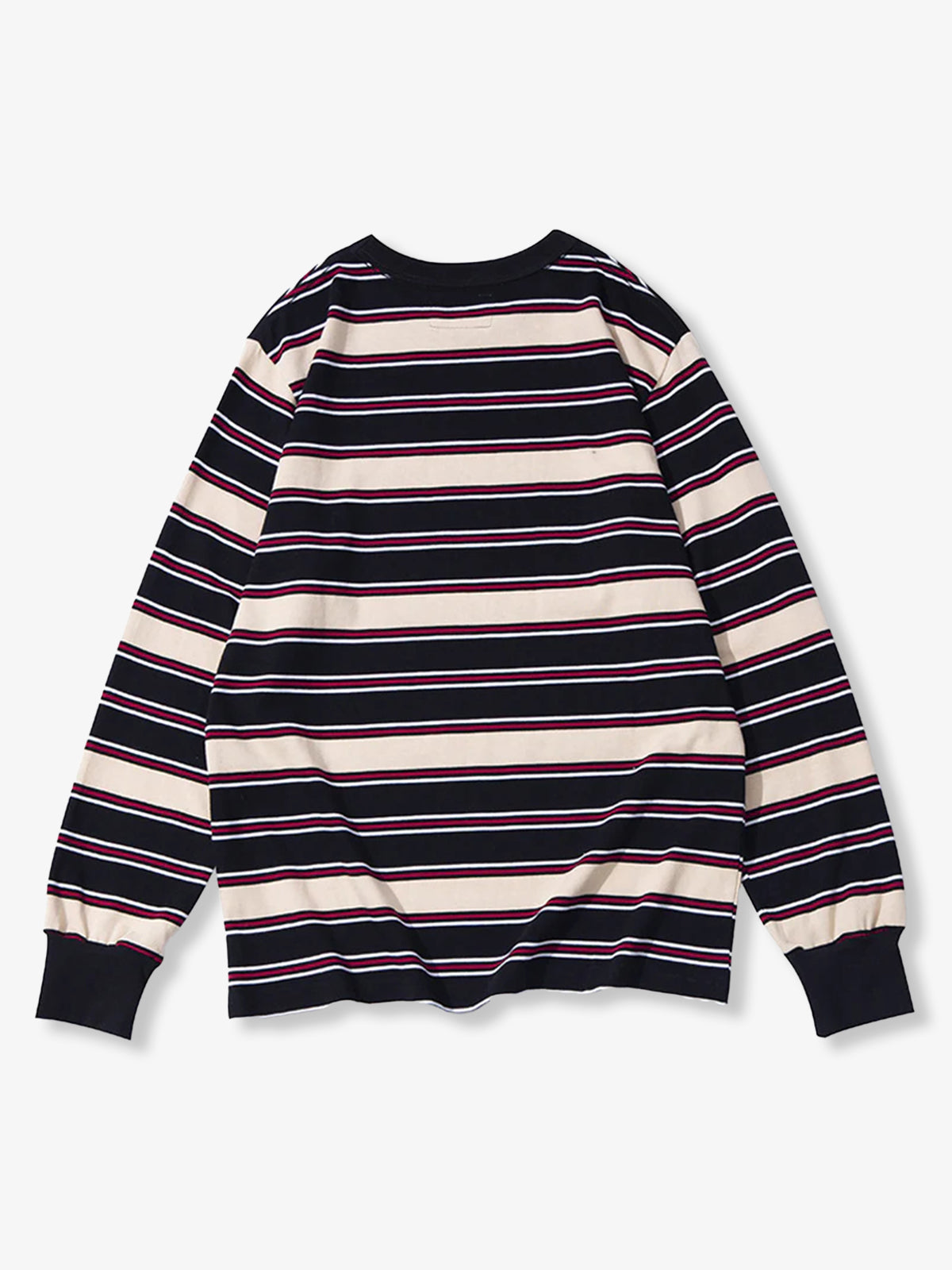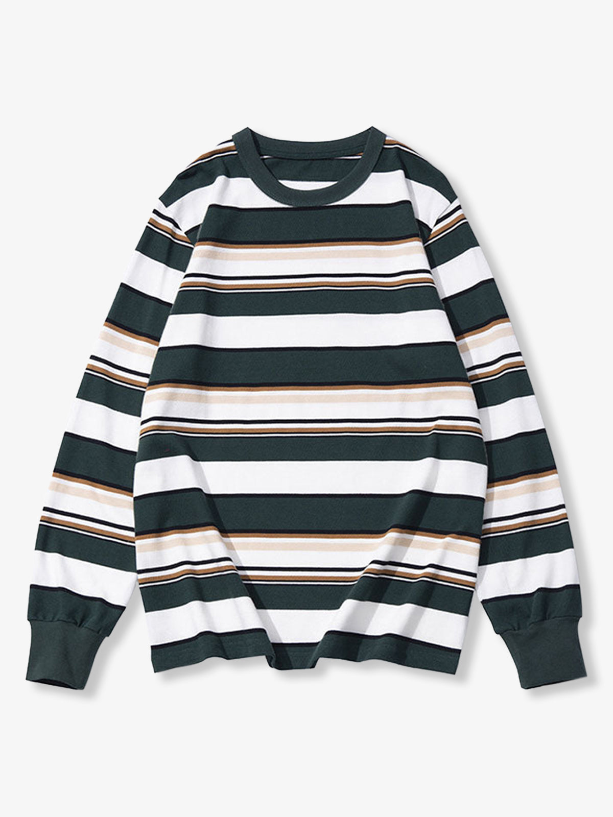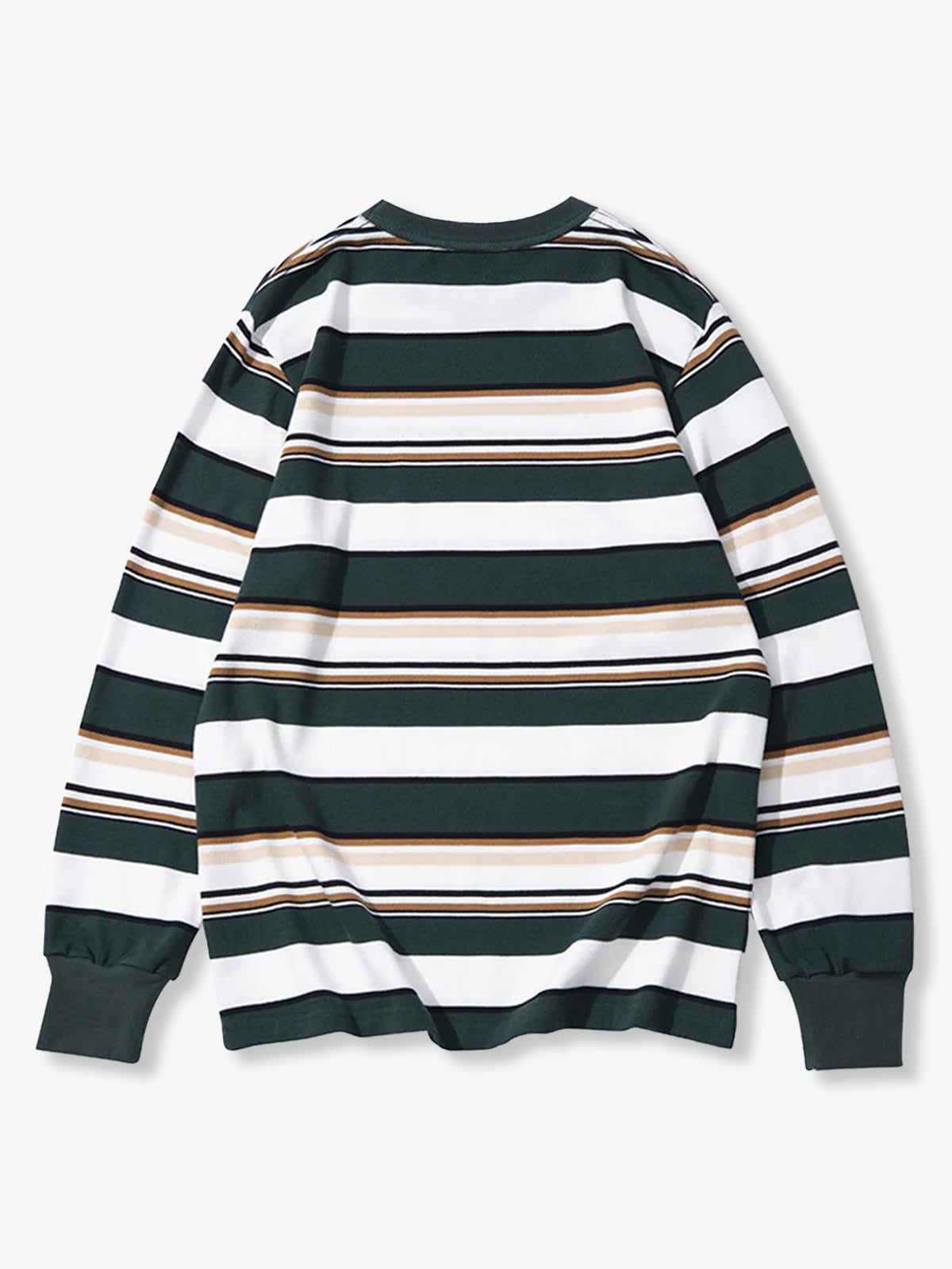 This striped long-sleeve tee features multiple stripe patterns with variations in color and line thickness, creating a dynamic and distinctive look. Designed with a classic crew neck, ribbed cuffs, and hem for a secure fit, it delivers comfort and casual style perfect for transitional seasons and layering. Available in a range of color variations to suit different personal styles.