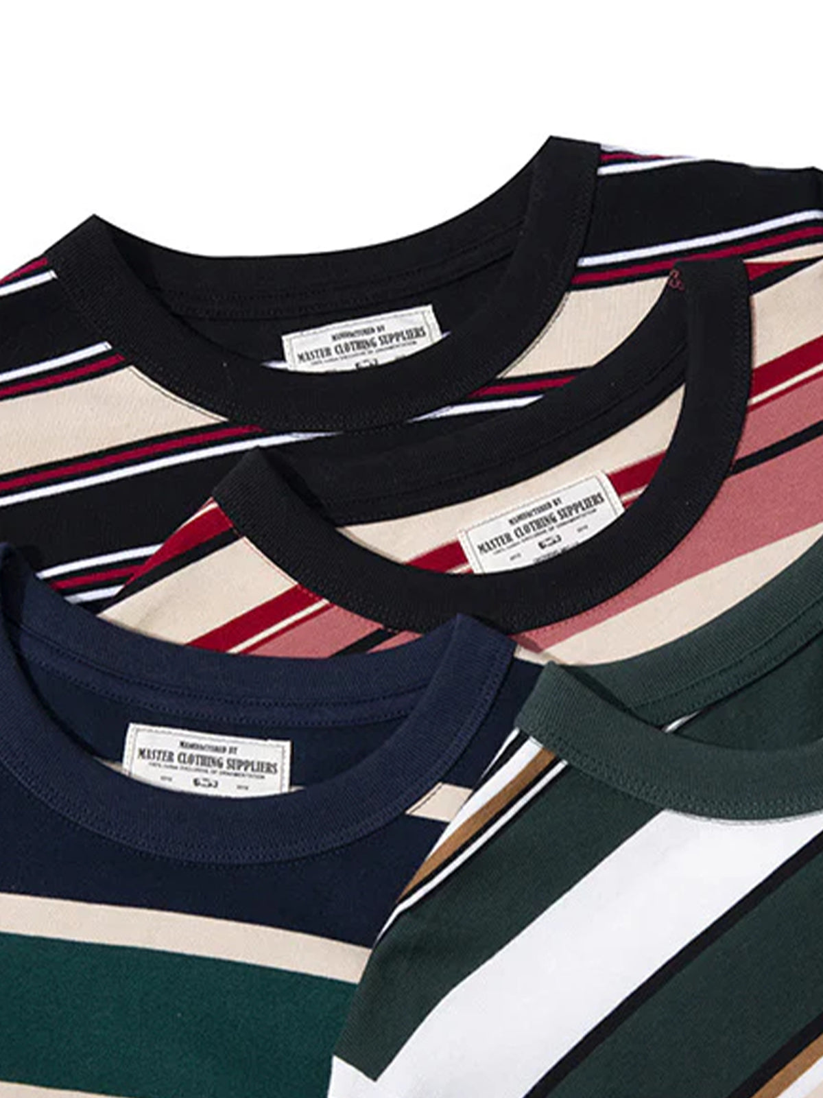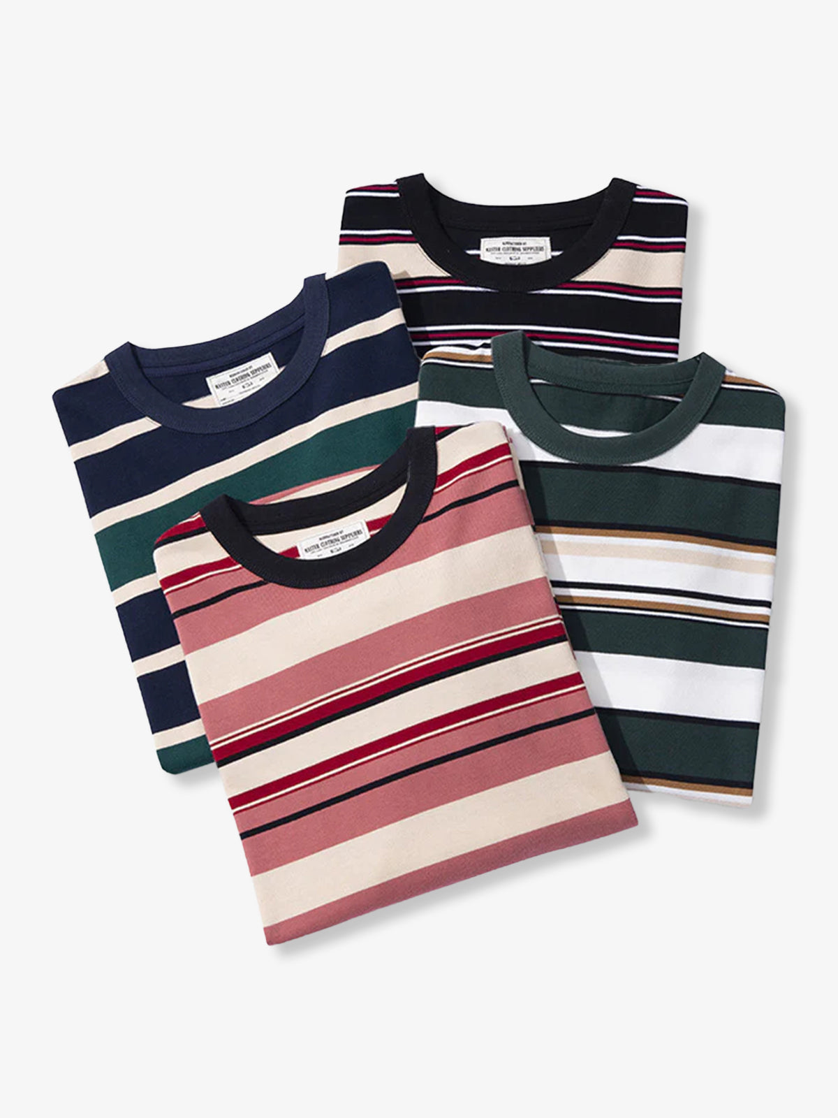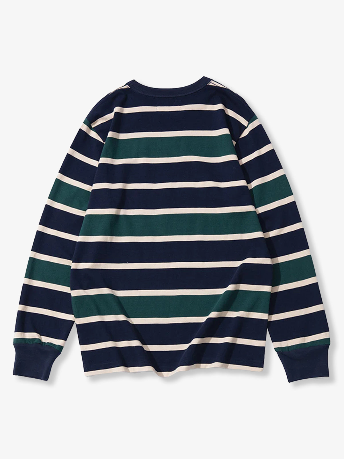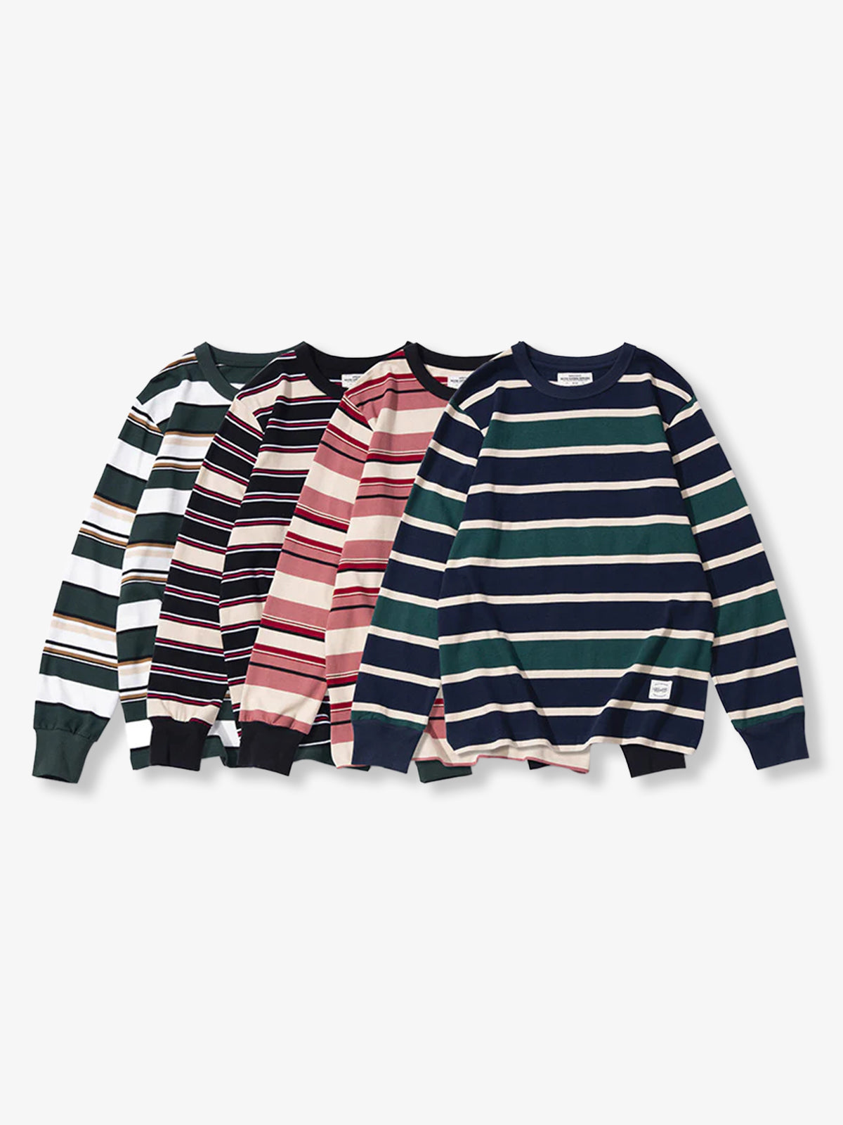 This striped long-sleeve tee features multiple stripe patterns with variations in color and line thickness, creating a dynamic and distinctive look. Designed with a classic crew neck, ribbed cuffs, and hem for a secure fit, it delivers comfort and casual style perfect for transitional seasons and layering. Available in a range of color variations to suit different personal styles.