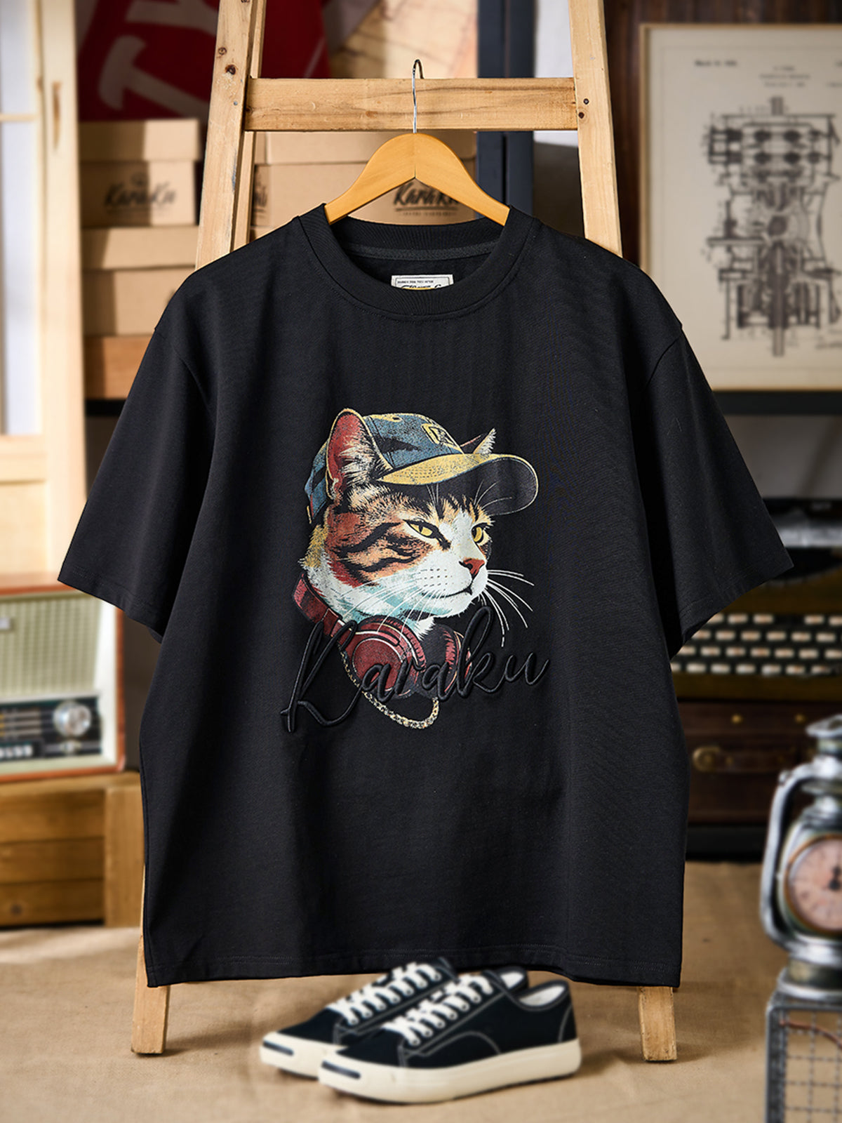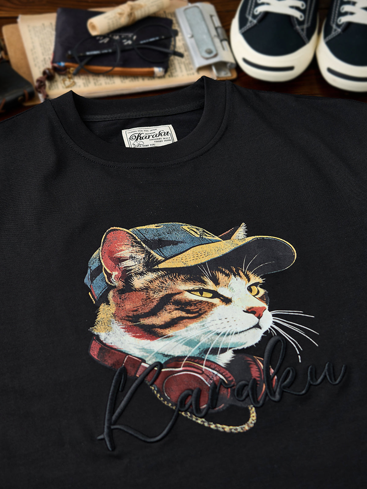 “Cat Rapper” Crack Print & KaraKu Embroidered Cotton Tee