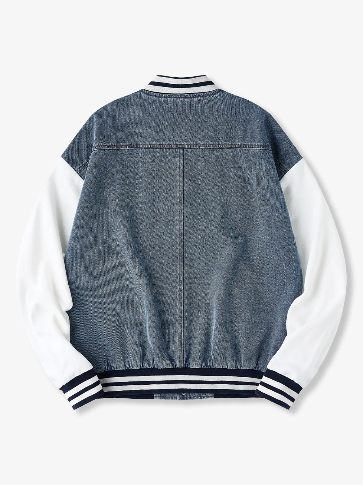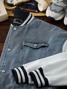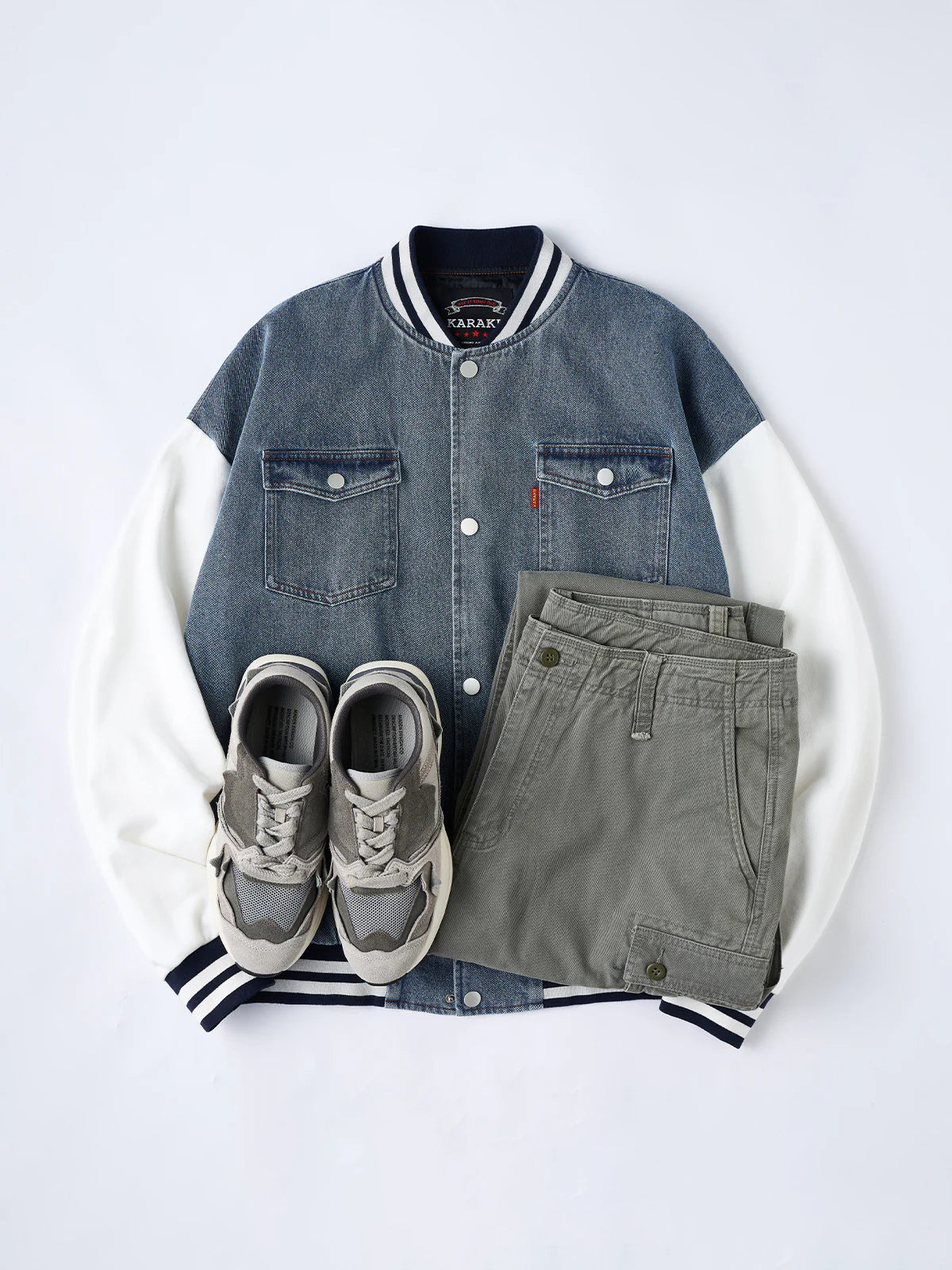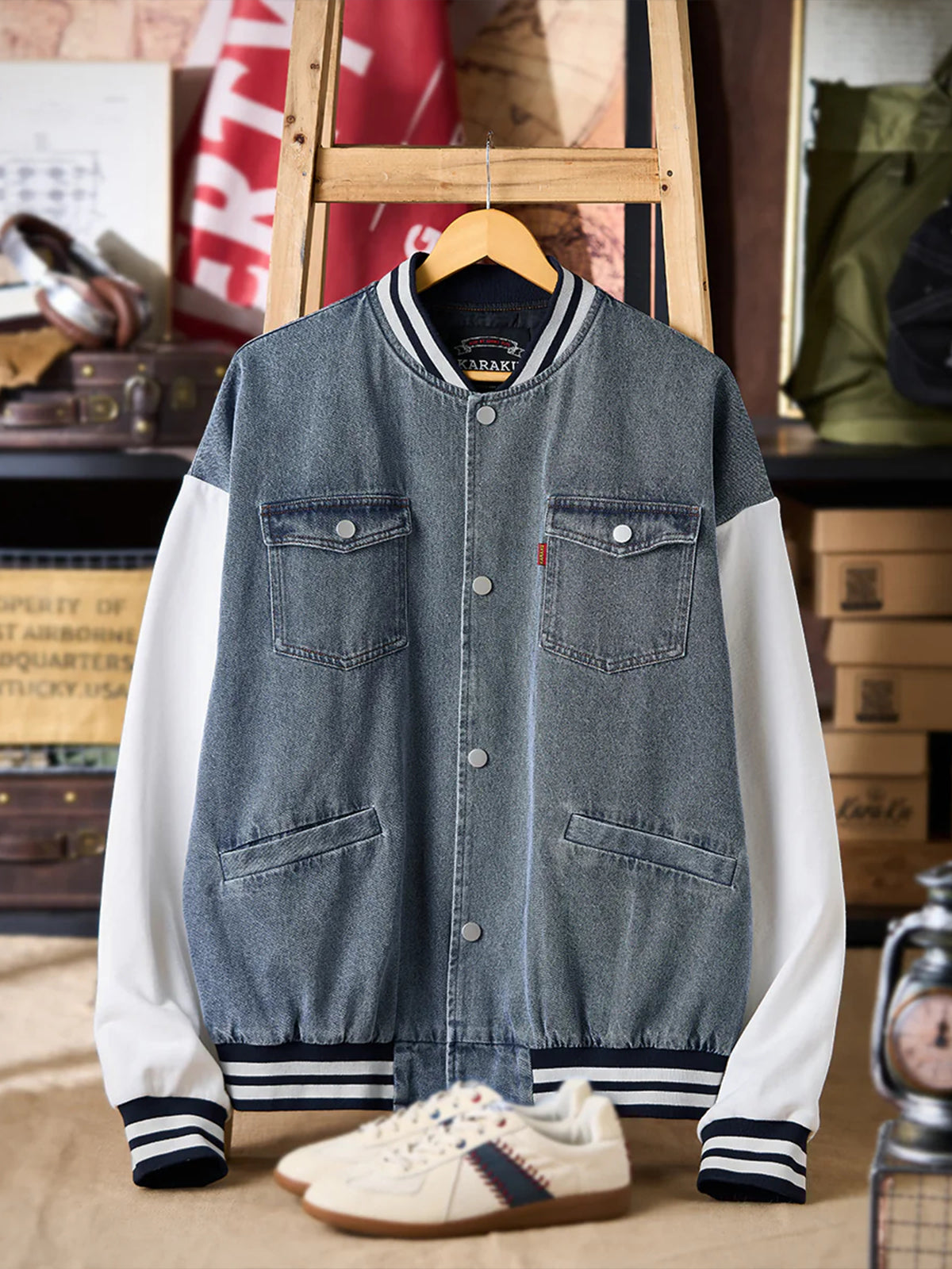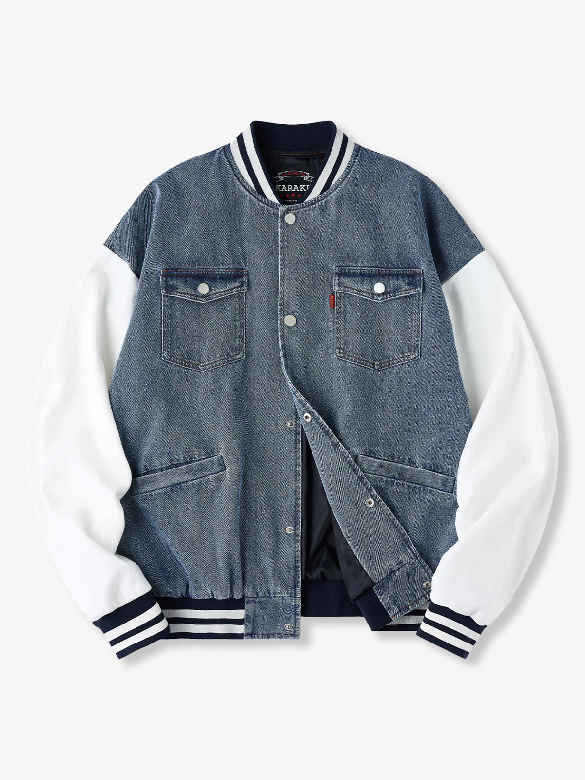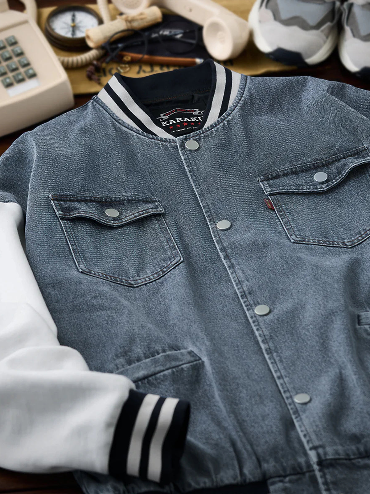 [Pre-Order] Denim Baseball Jacket with Contrasting Sleeve Material & Multiple Pockets