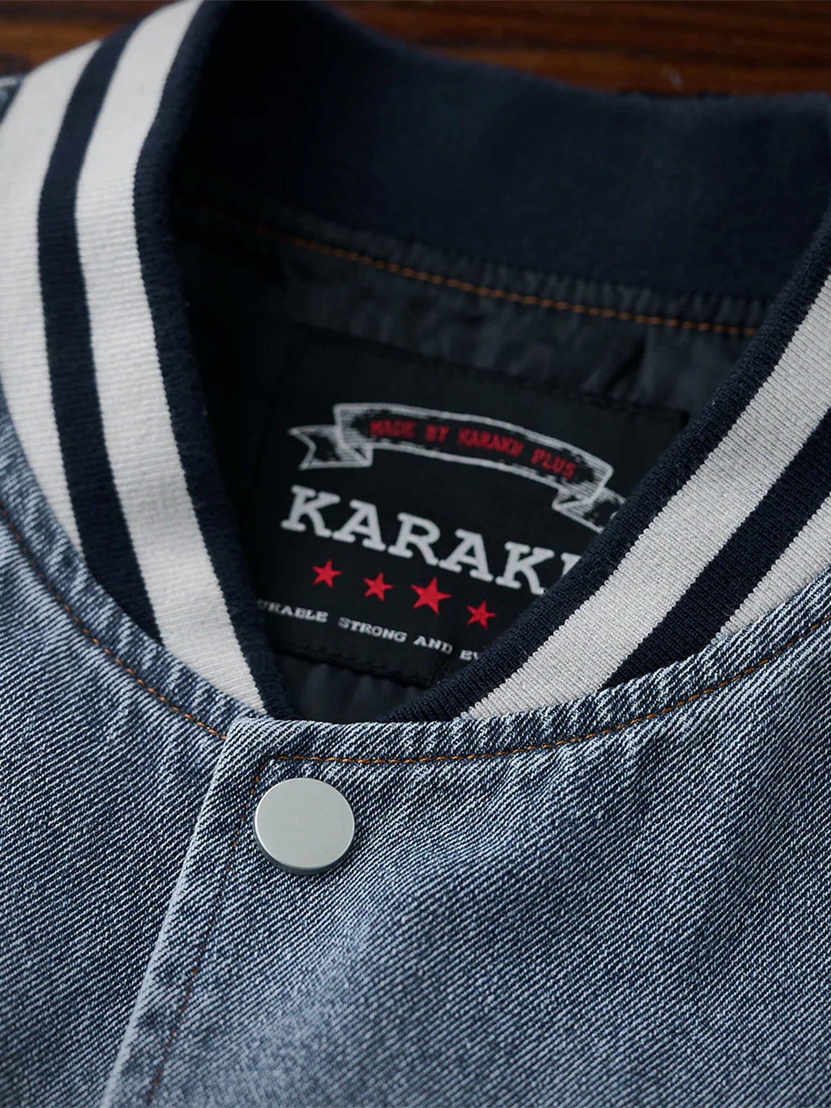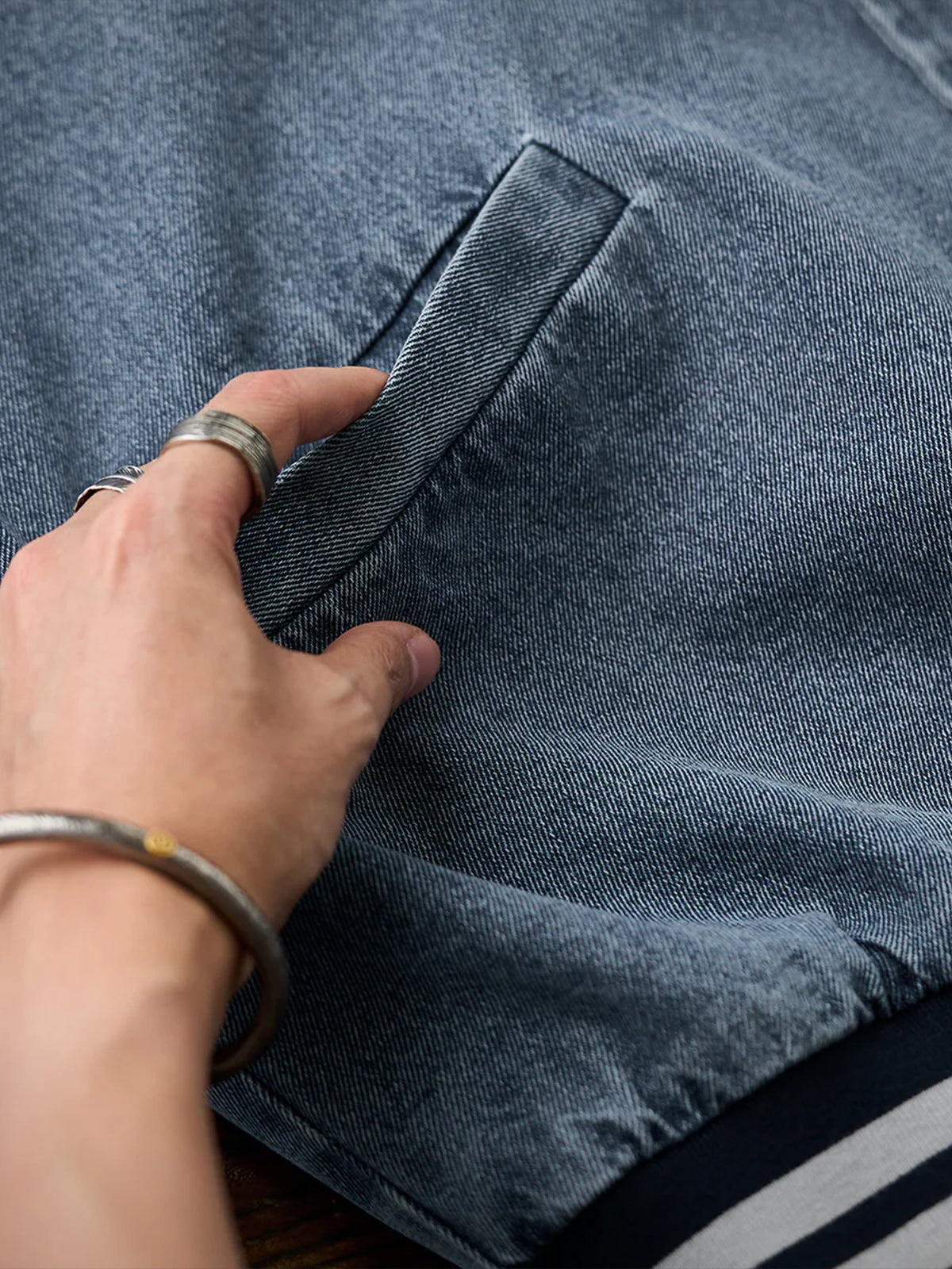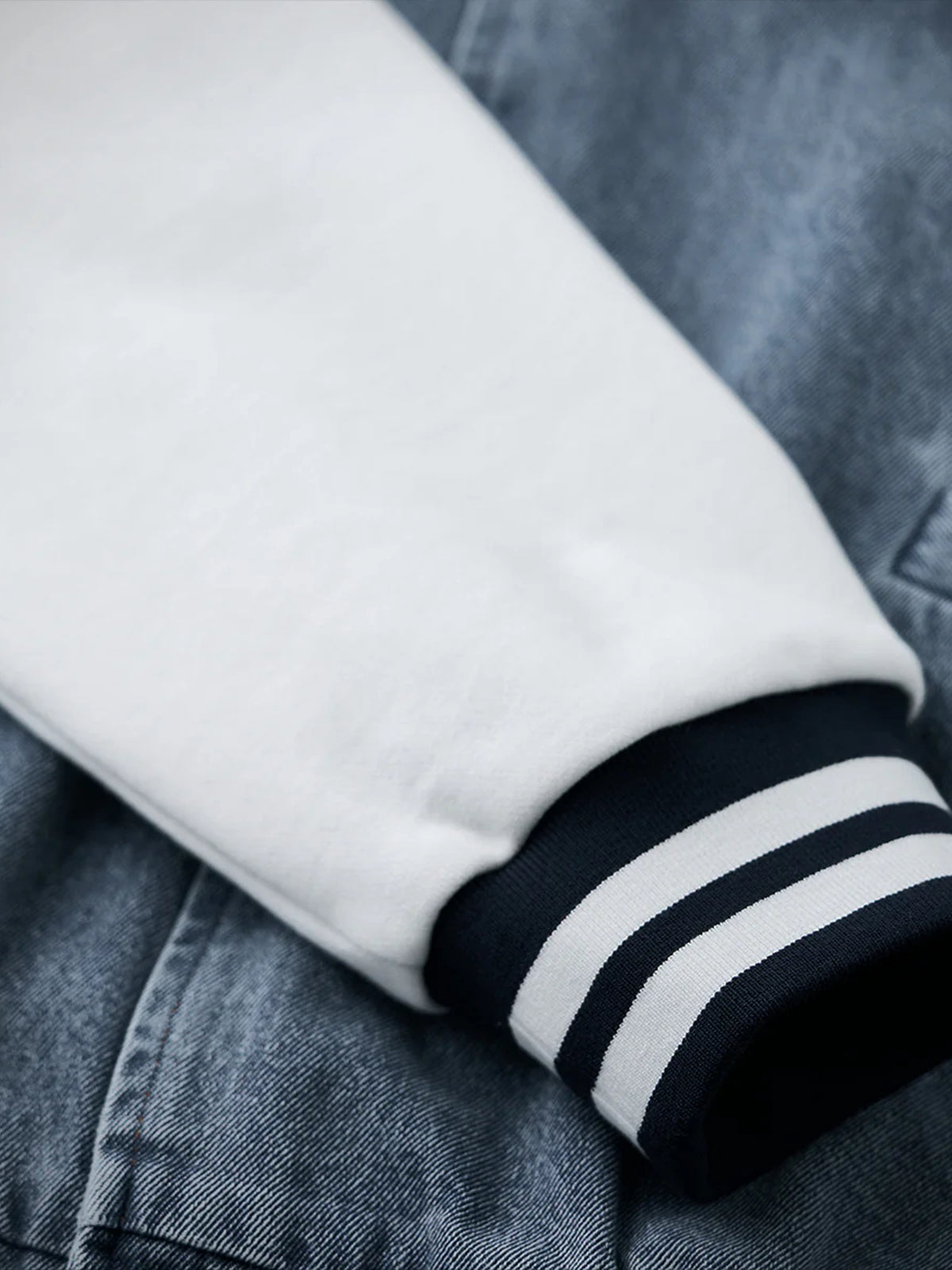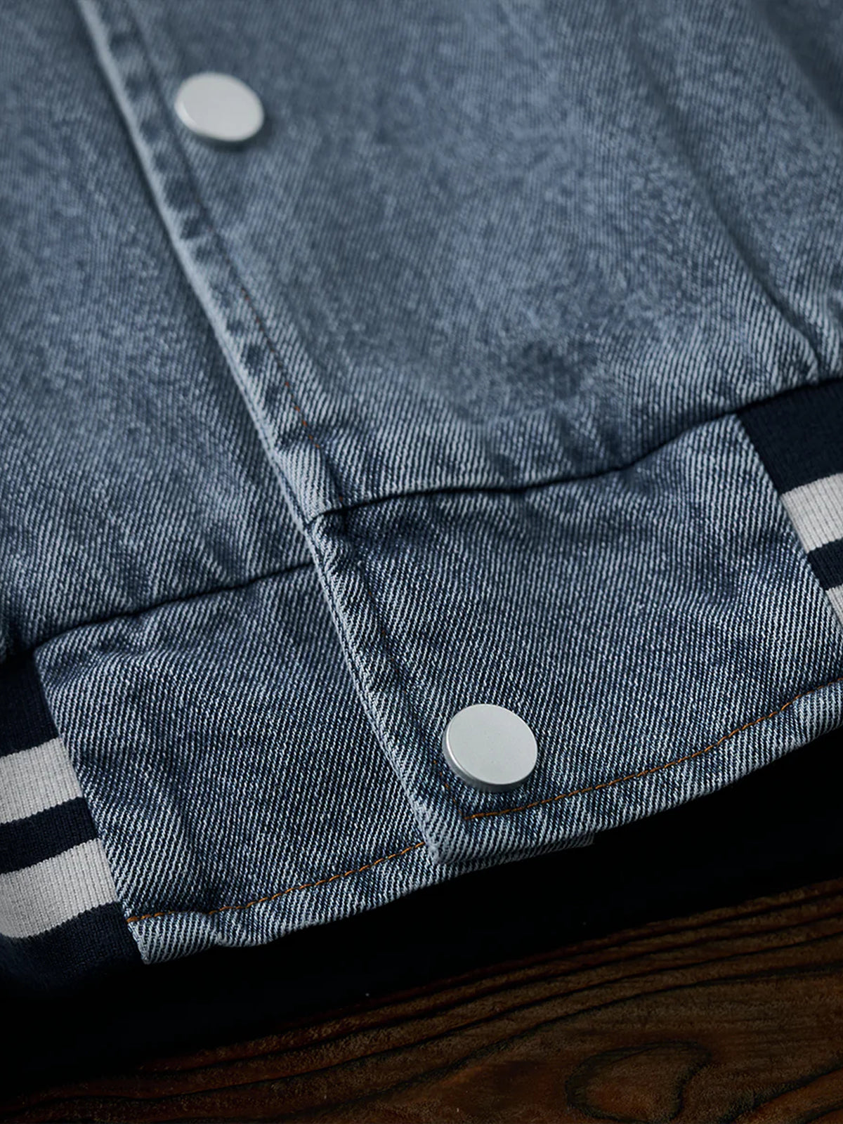 [Pre-Order] Denim Baseball Jacket with Contrasting Sleeve Material & Multiple Pockets