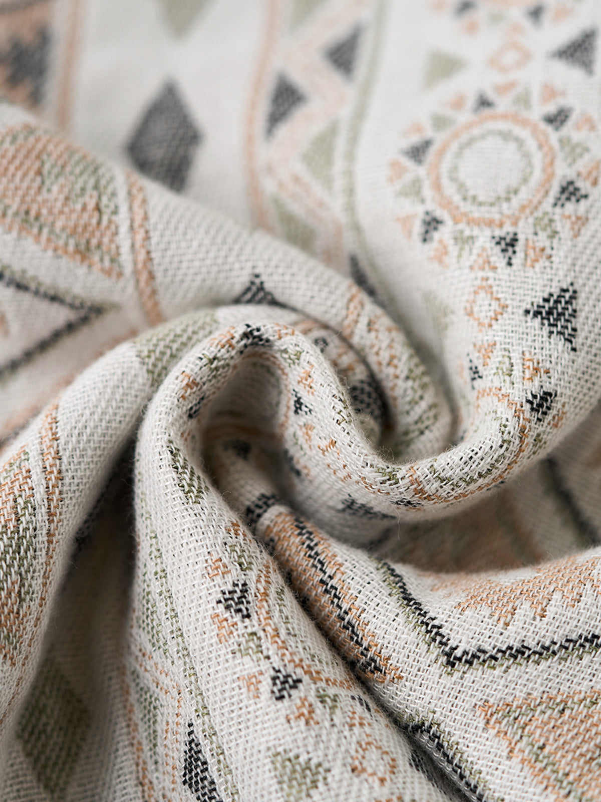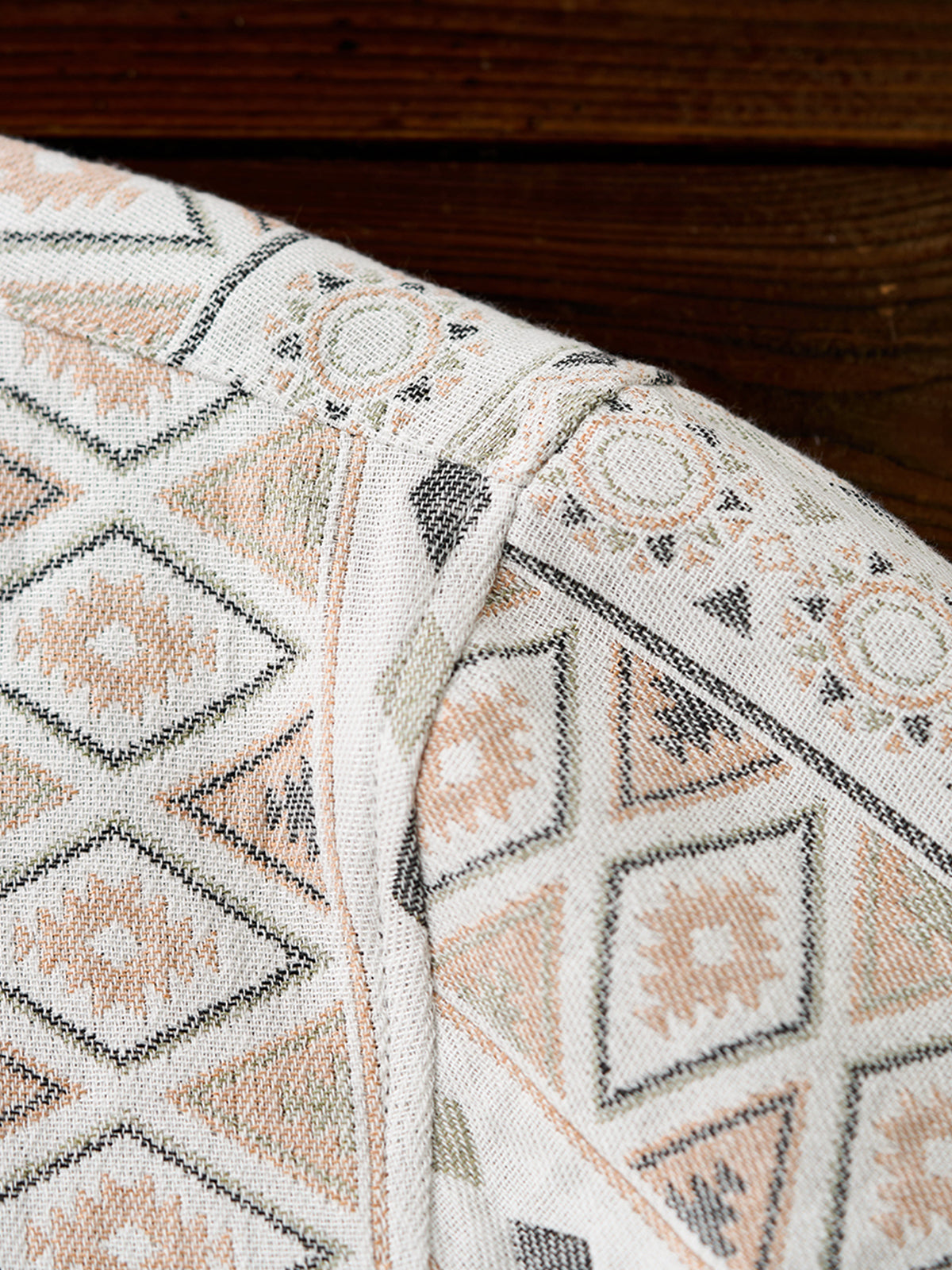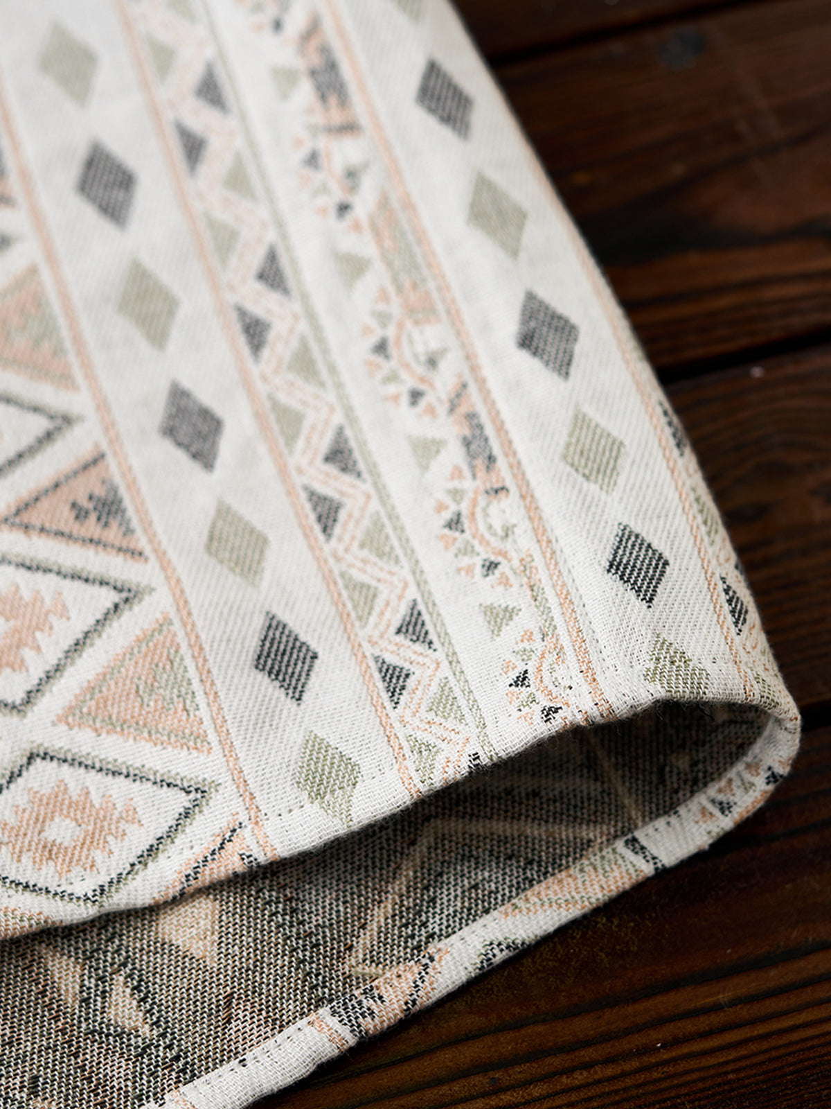 A jacquard weaving technique is used to create the ethnic pattern by intricately weaving the threads. The textured surface formed by the weave adds depth to the fabric, giving it a refined and premium feel. The subdued tone keeps the ethnic pattern from appearing too bold, resulting in a clean and balanced impression.