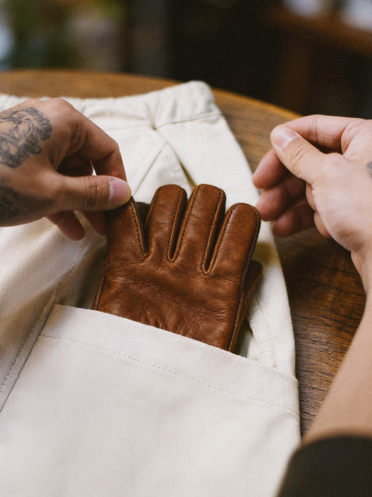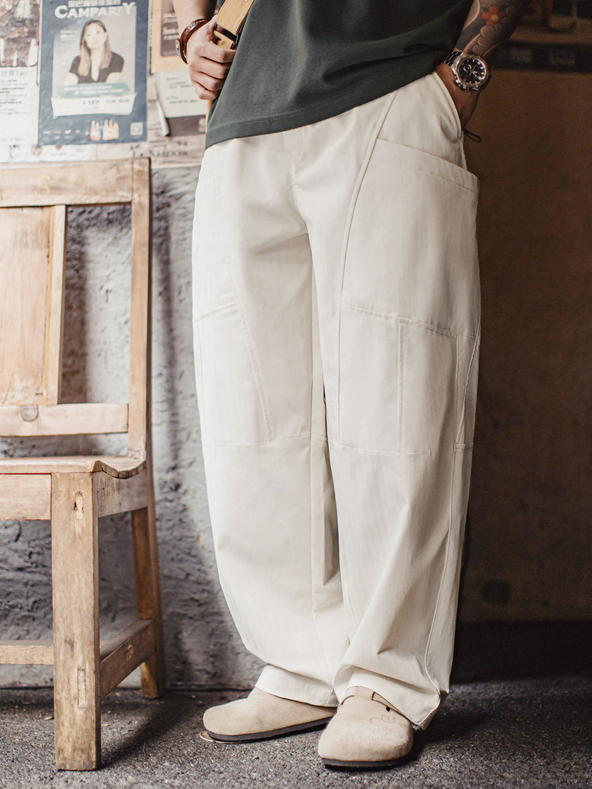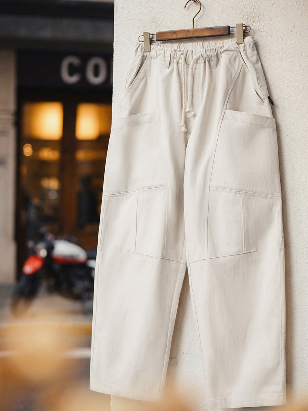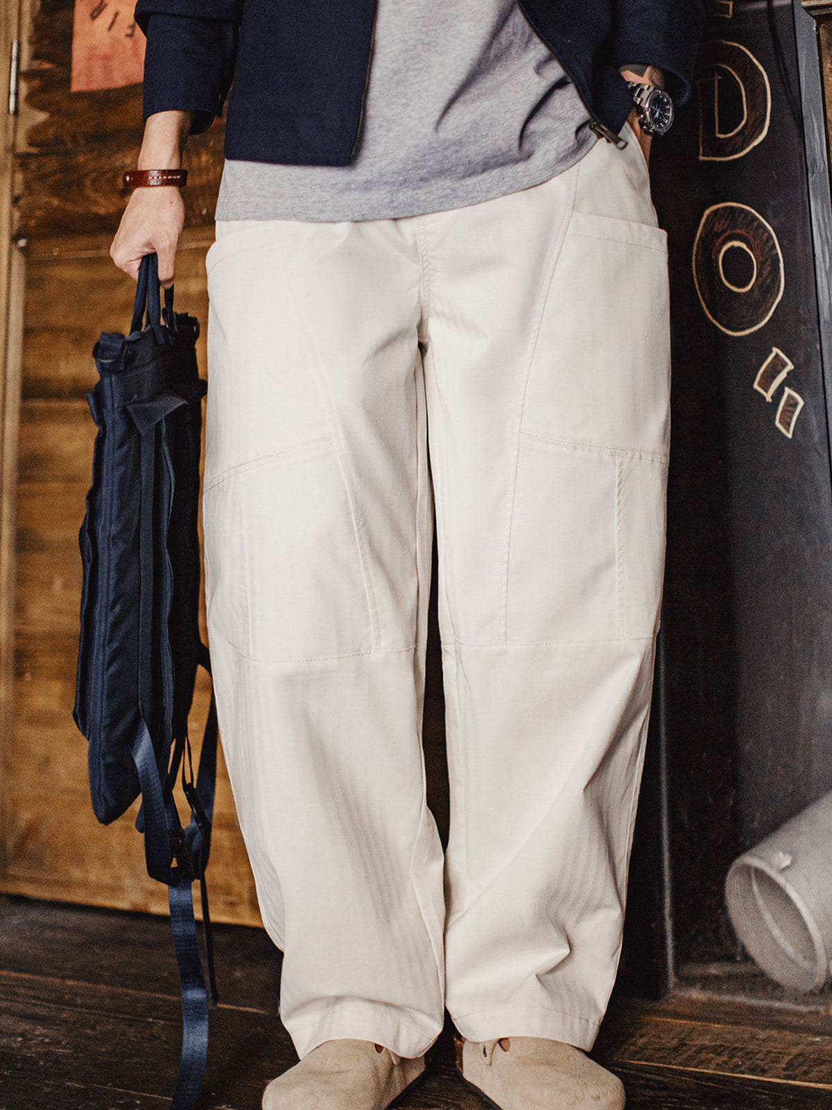 This custom vintage off-white shade is a favorite among style leaders featured in MAN OF THE WEEK. Its versatile color makes it easy to style across various fashion looks. Subtle herringbone texture adds depth and dimension, giving the white fabric a rich, expressive visual character. The pants feature a slightly flared upper section with a gentle taper toward the hem. Each seam and panel is purposefully designed to refine the leg line, balance volume, and support the overall structure, creating a polished yet relaxed appearance.