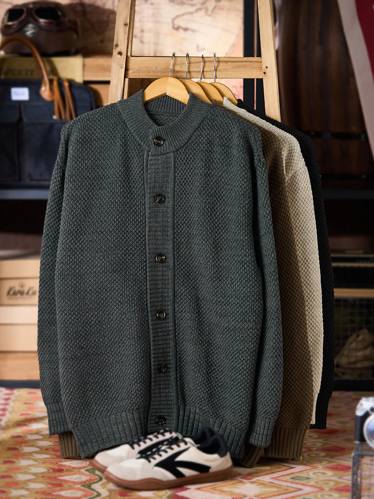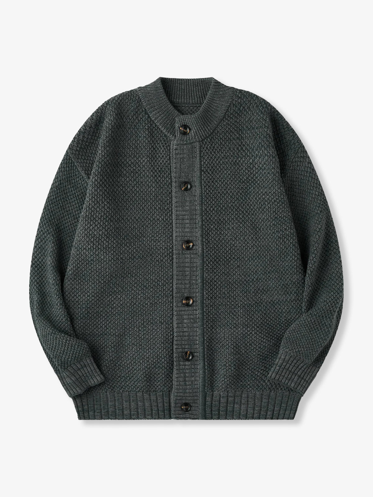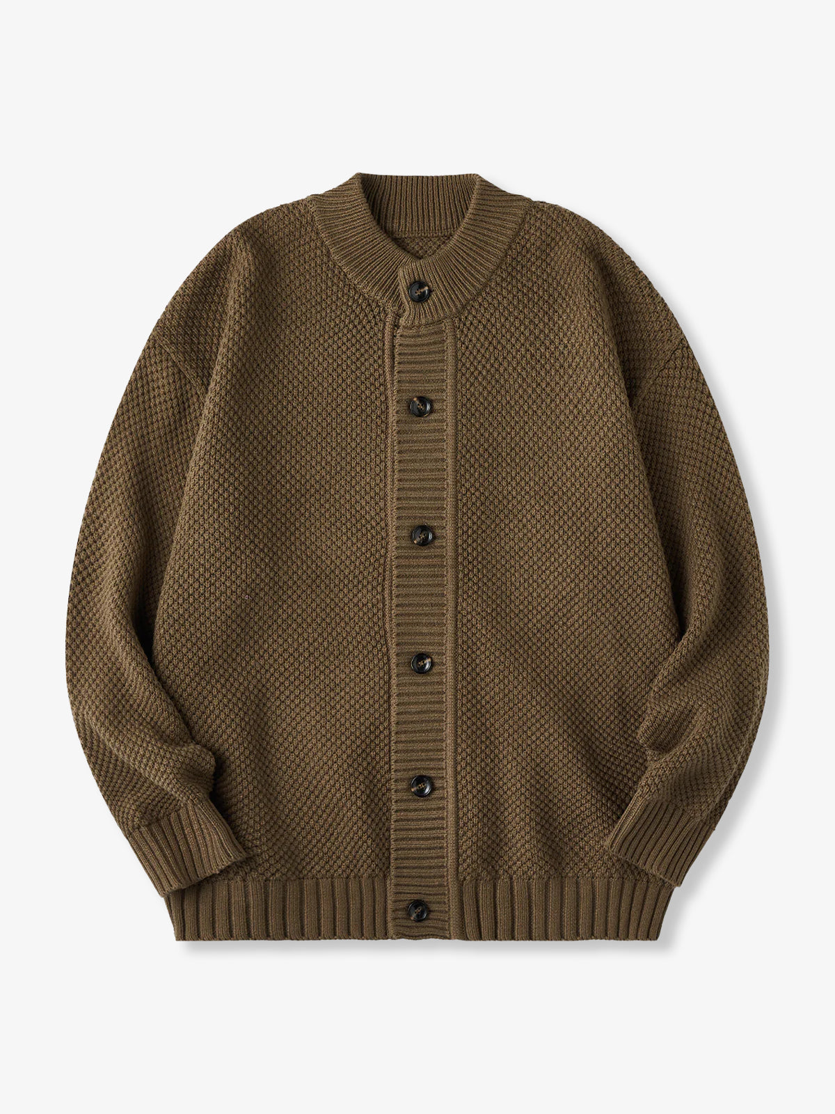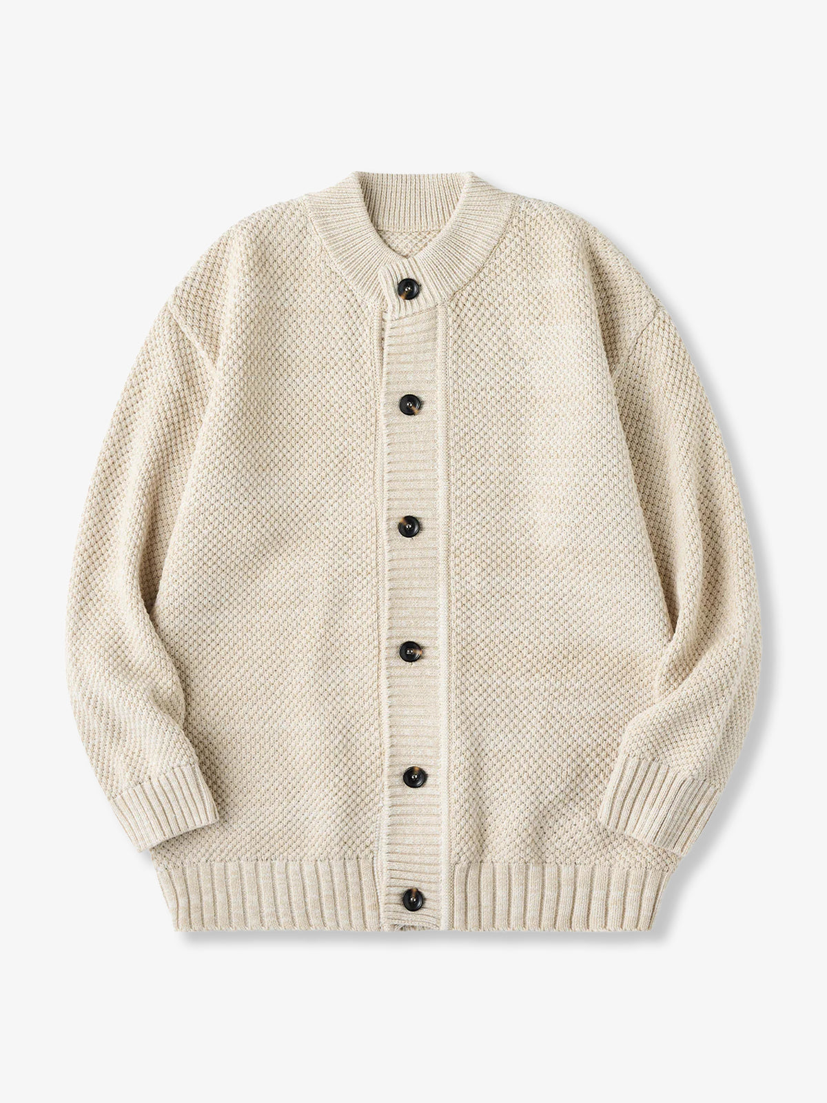 A relaxed-fit cardigan featuring a classic button-front closure for a clean, understated look. The cuffs, hem, and collar are ribbed, providing stretch and a comfortable, snug fit. The entire piece showcases a fine pineapple pile knit texture, adding depth, durability, and warmth while maintaining a luxurious feel. Its relaxed silhouette allows for easy layering, making it ideal for colder seasons.