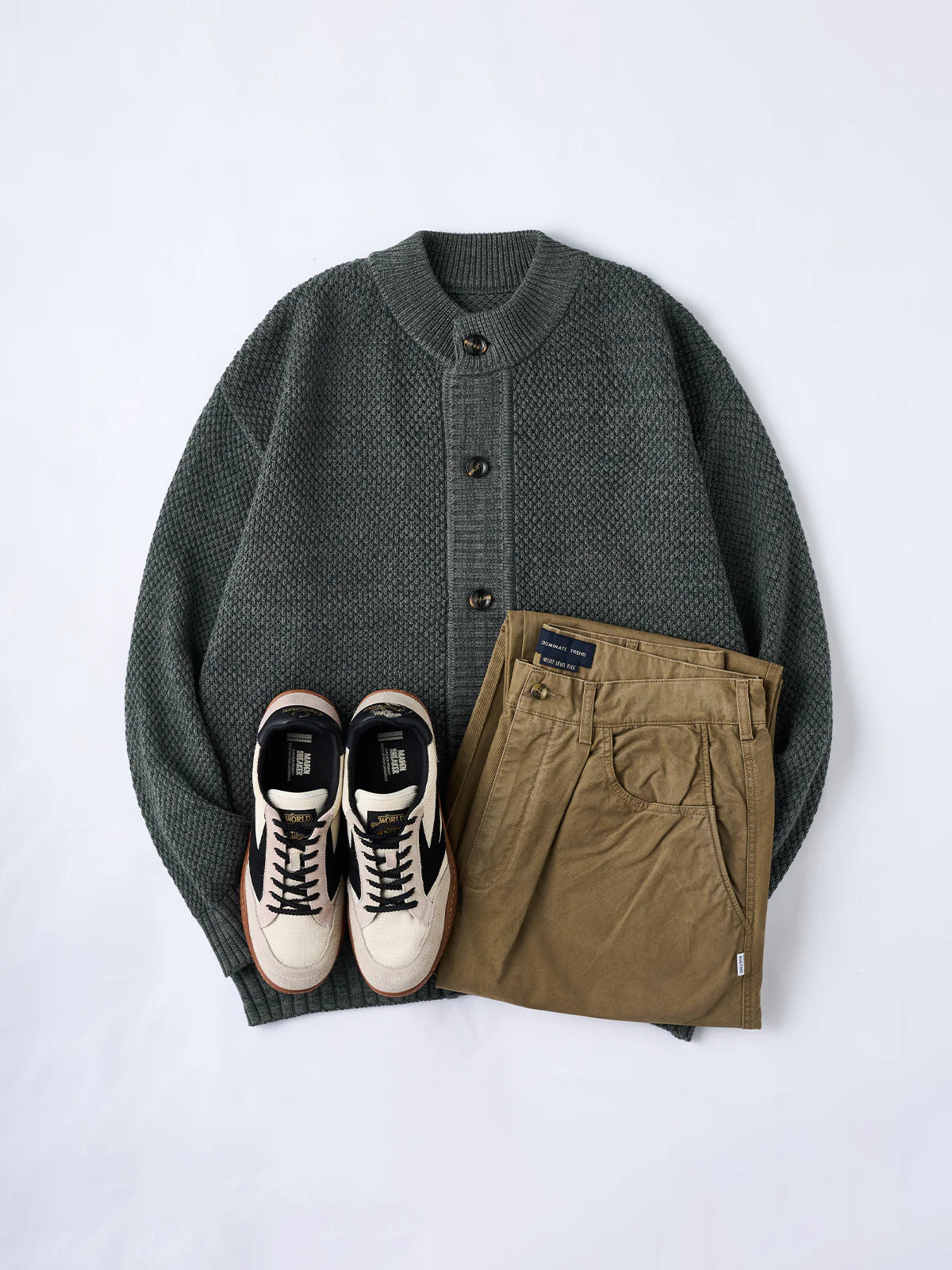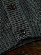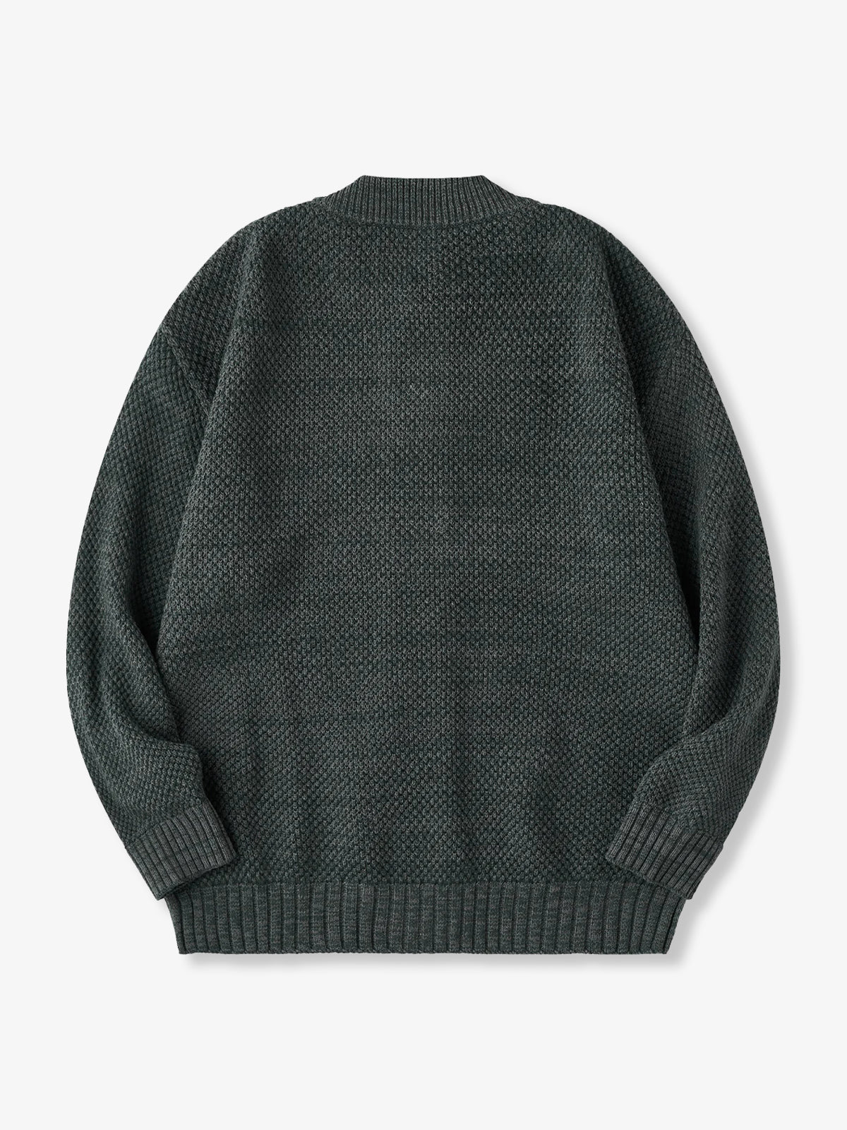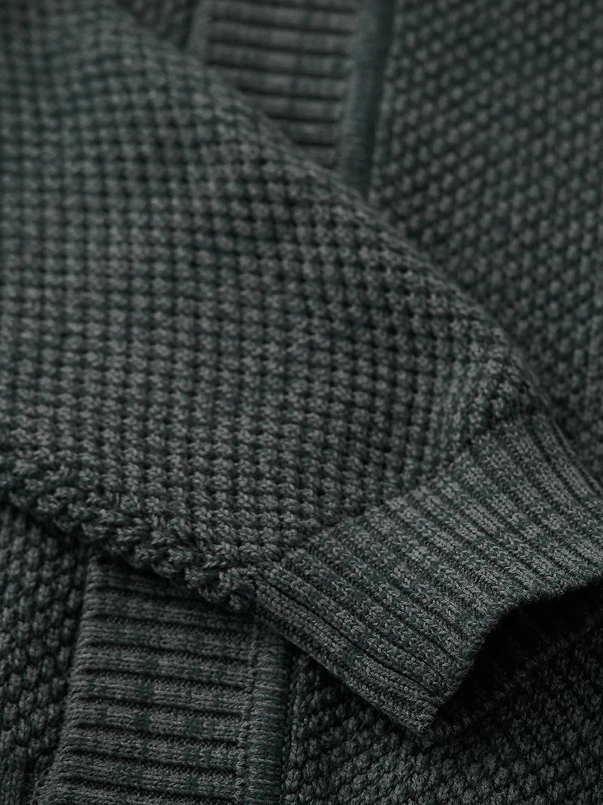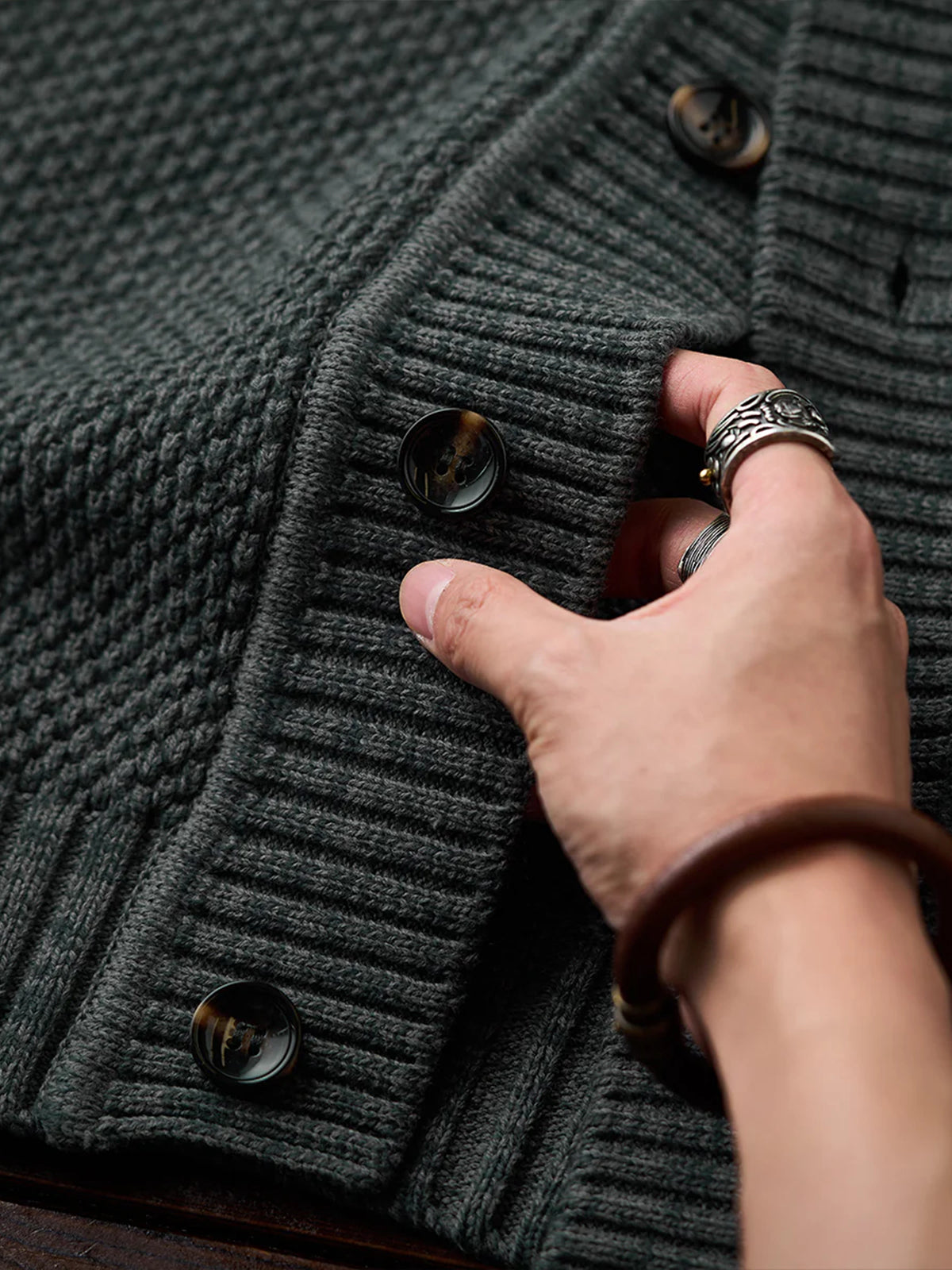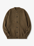 A relaxed-fit cardigan featuring a classic button-front closure for a clean, understated look. The cuffs, hem, and collar are ribbed, providing stretch and a comfortable, snug fit. The entire piece showcases a fine pineapple pile knit texture, adding depth, durability, and warmth while maintaining a luxurious feel. Its relaxed silhouette allows for easy layering, making it ideal for colder seasons.