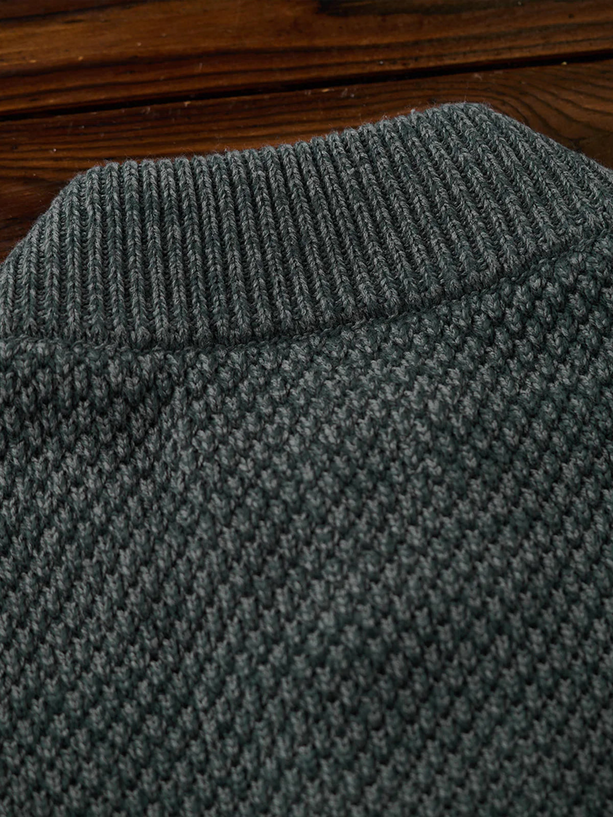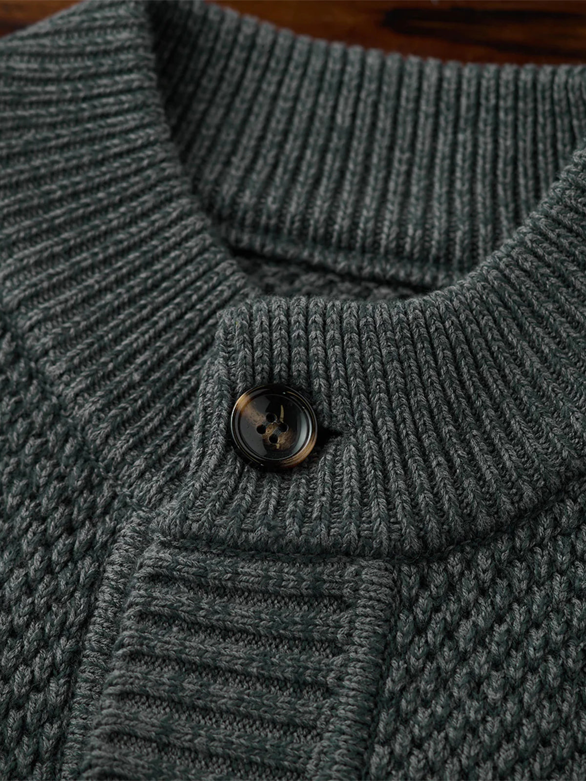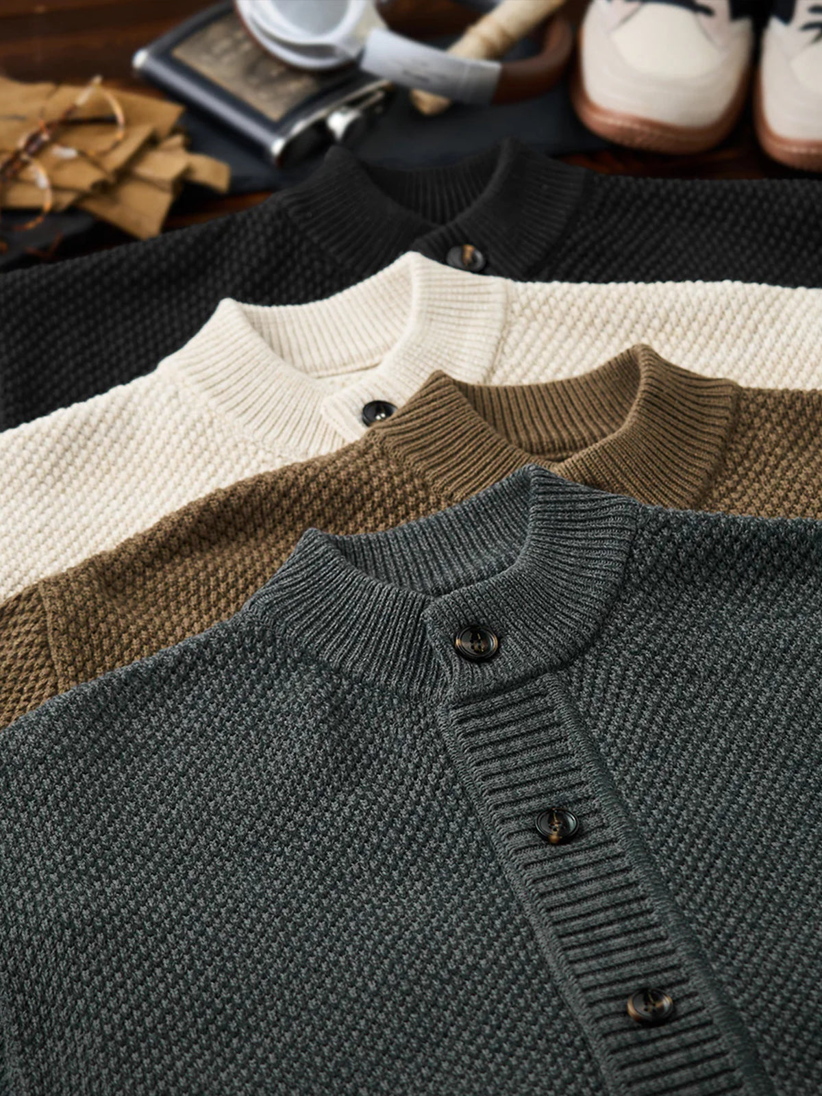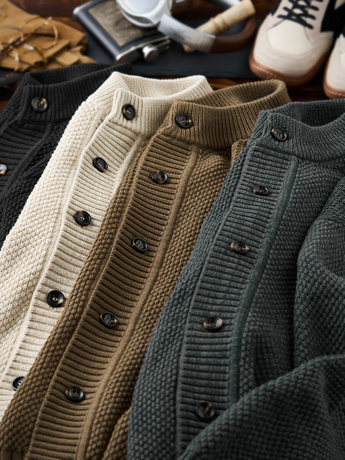 A relaxed-fit cardigan featuring a classic button-front closure for a clean, understated look. The cuffs, hem, and collar are ribbed, providing stretch and a comfortable, snug fit. The entire piece showcases a fine pineapple pile knit texture, adding depth, durability, and warmth while maintaining a luxurious feel. Its relaxed silhouette allows for easy layering, making it ideal for colder seasons.