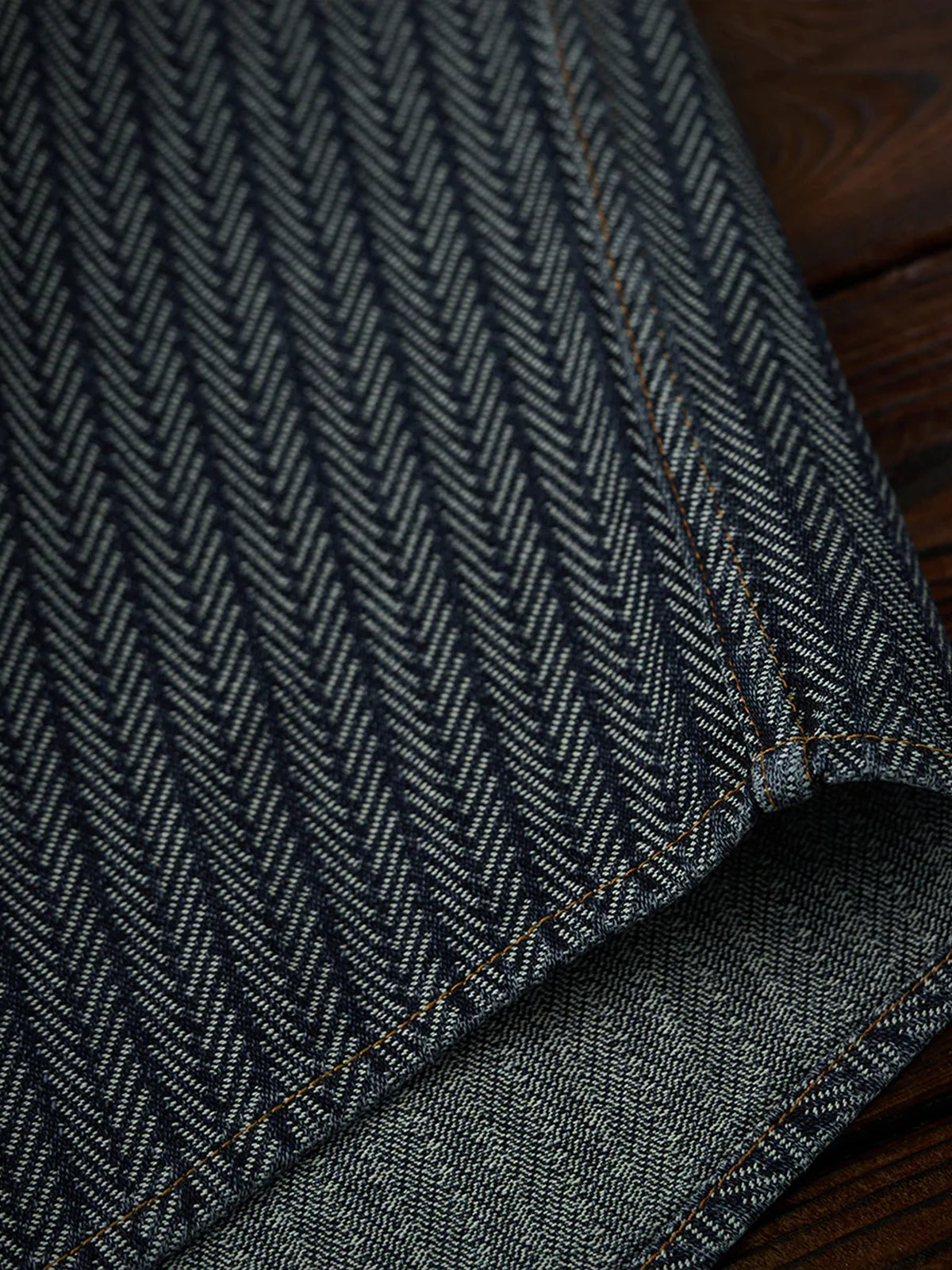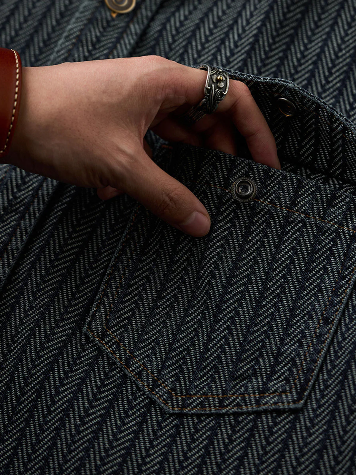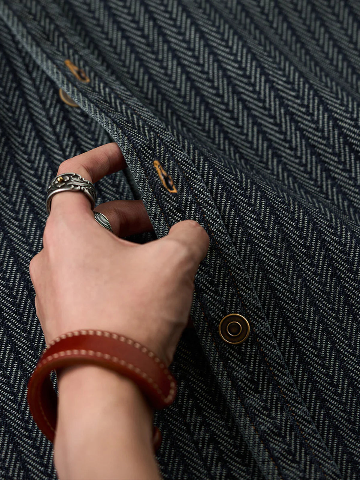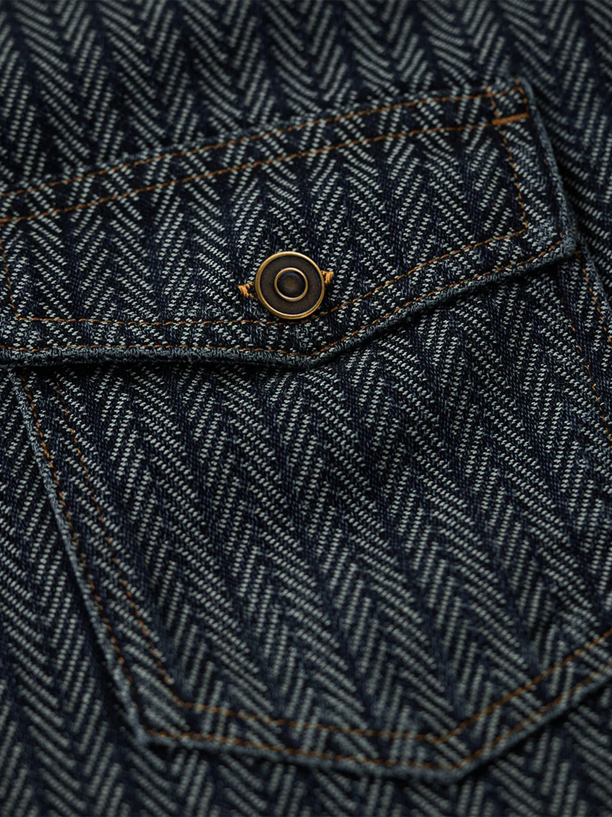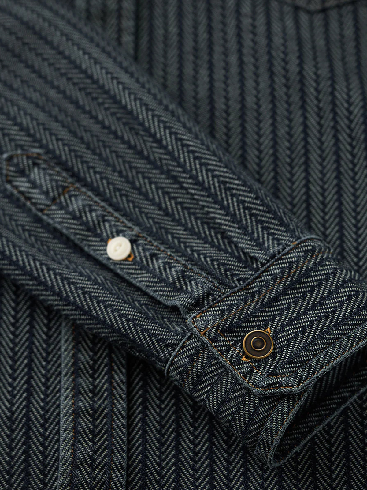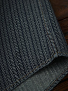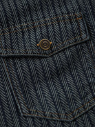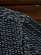 A denim work shirt crafted from herringbone jacquard fabric, built on the classic workshirt silhouette for a richly textured, sophisticated look. The subtly raised weave adds dimension while maintaining a casual yet refined aesthetic. The collar is accented with corduroy, providing a visual contrast and a soft touch at the neckline. Designed with a relaxed yet balanced fit, it avoids looking bulky while preserving the essential workshirt details, including front pockets and precise stitchwork. Wear it as a shirt or layer it as a light jacket for versatile seasonal styling.