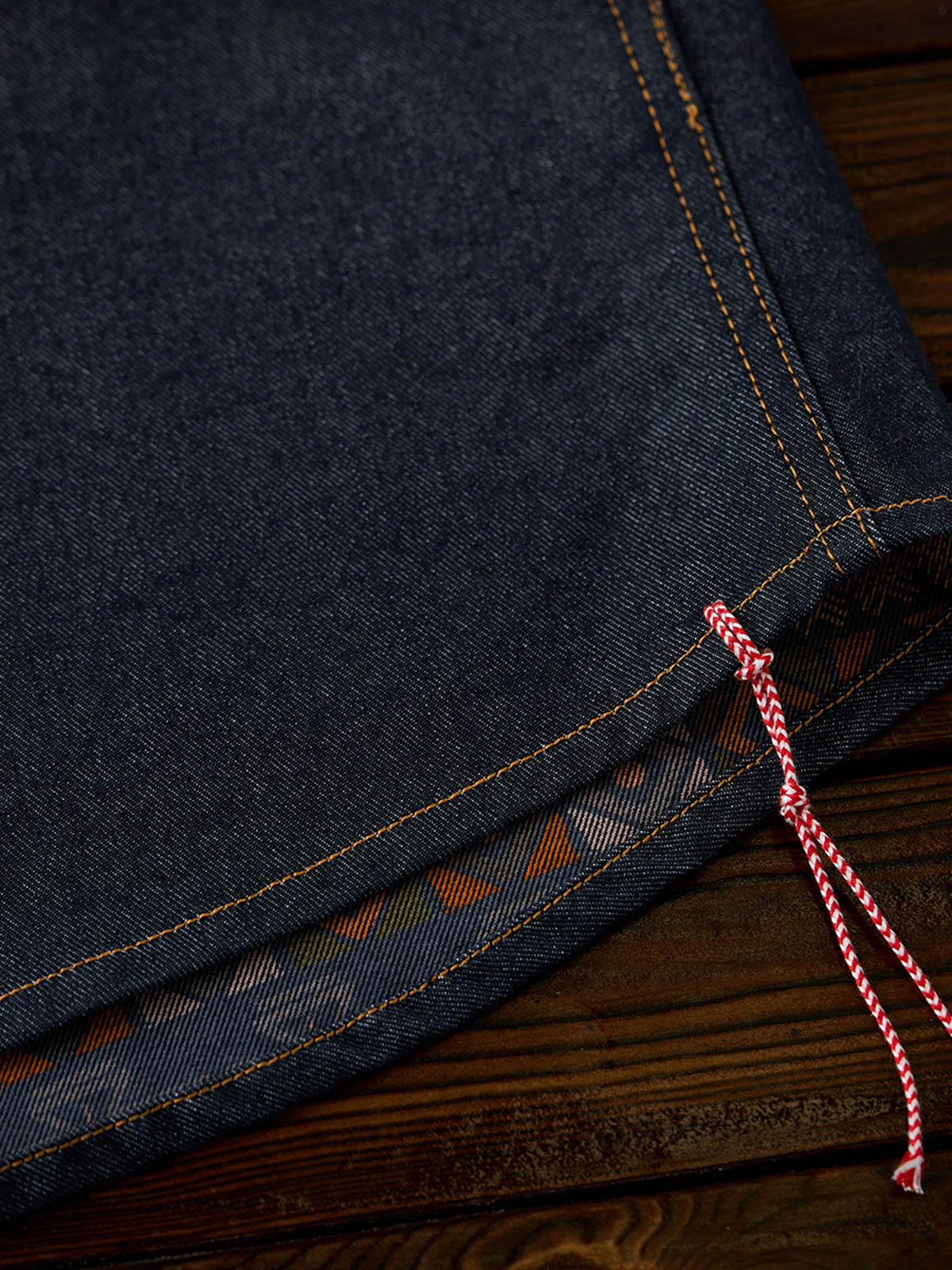 Crafted from deep indigo denim, this shirt is rooted in classic workwear styling. The interior features an ethnic-inspired pattern with delicately arranged geometric motifs, reminiscent of traditional handwoven textiles. When the sleeves are rolled up or the hem is slightly revealed, the inner pattern becomes a subtle yet eye-catching accent, elevating the simplicity of the denim exterior.