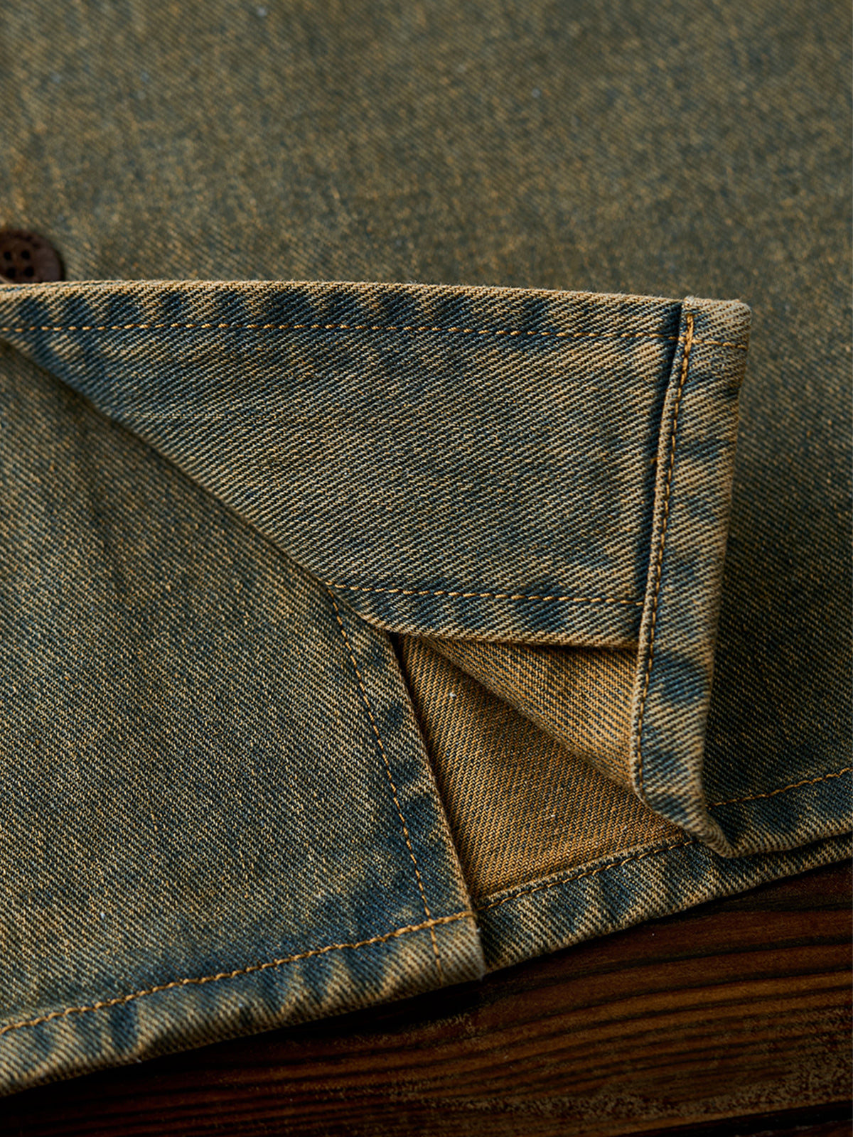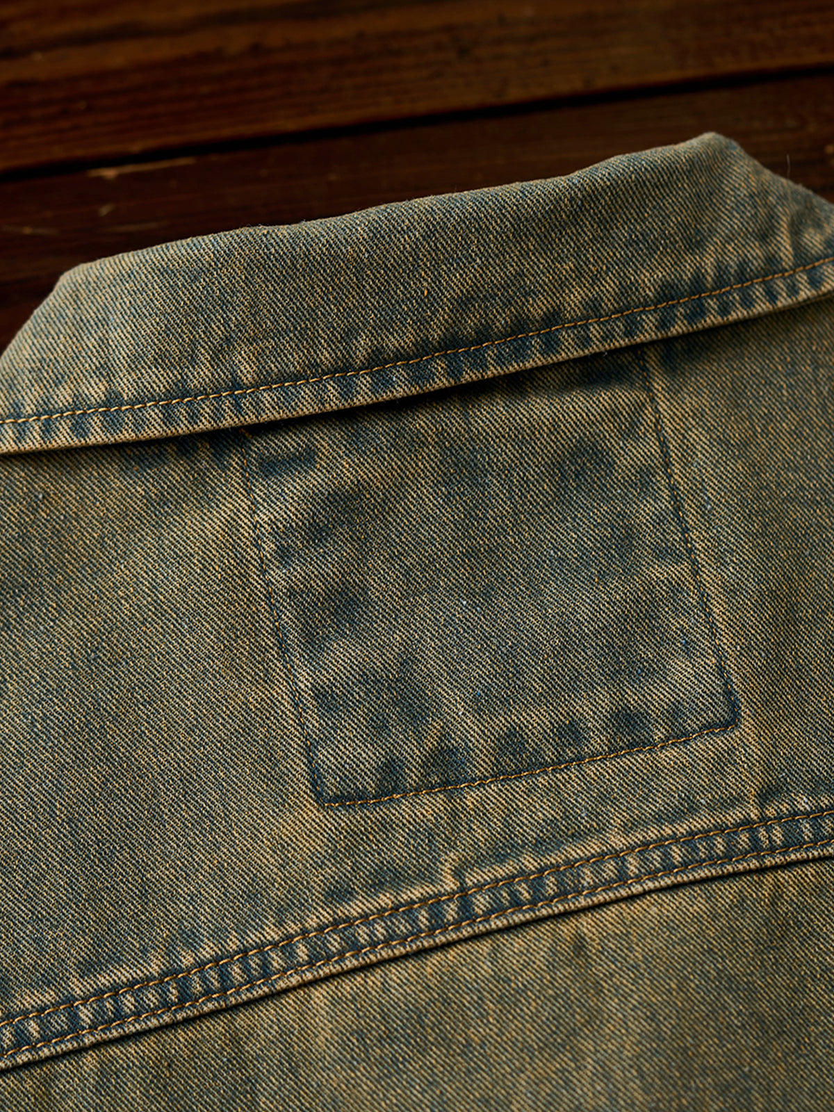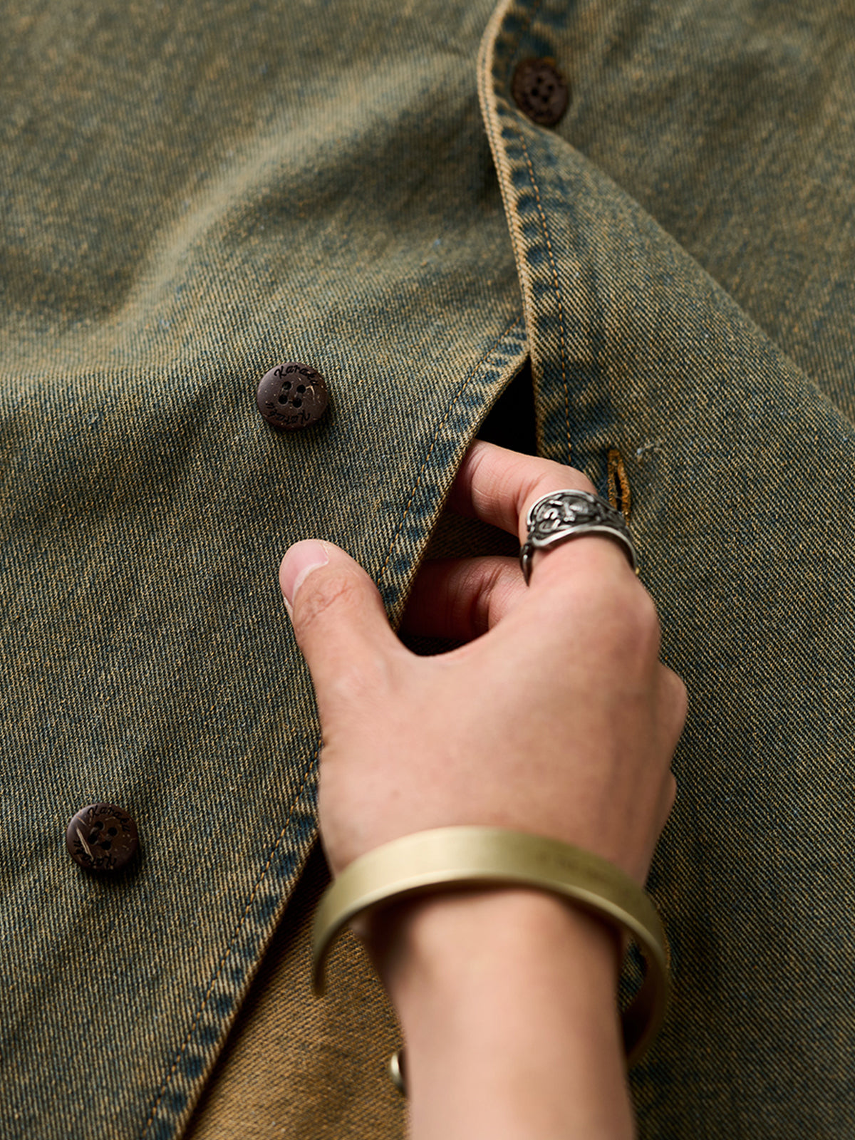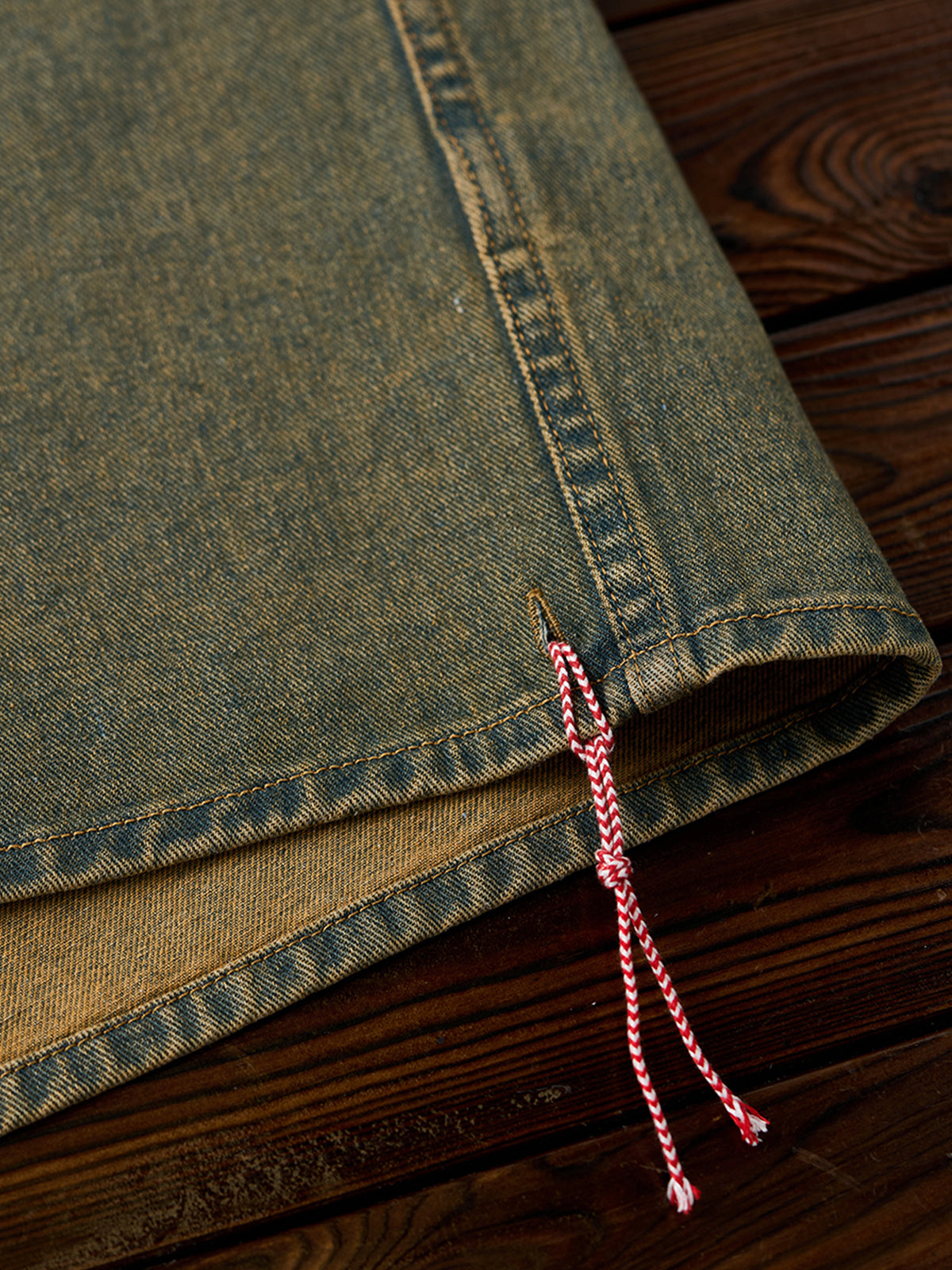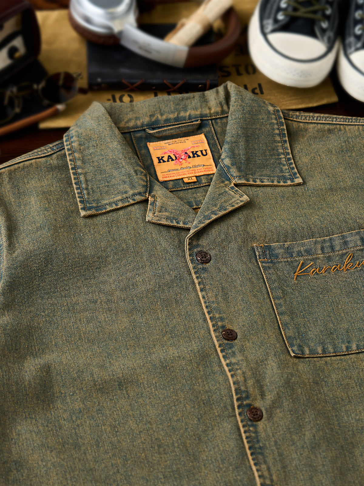 [Pre-Order] Washed Denim Open-Collar Shirt with “Karaku” Embroidery & Red Cord Detail