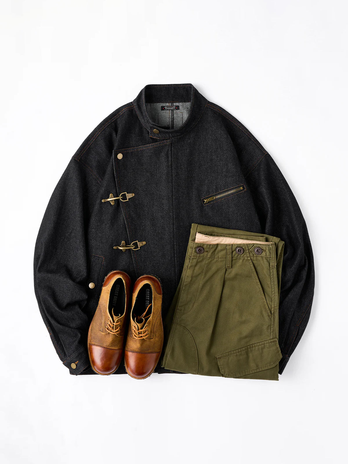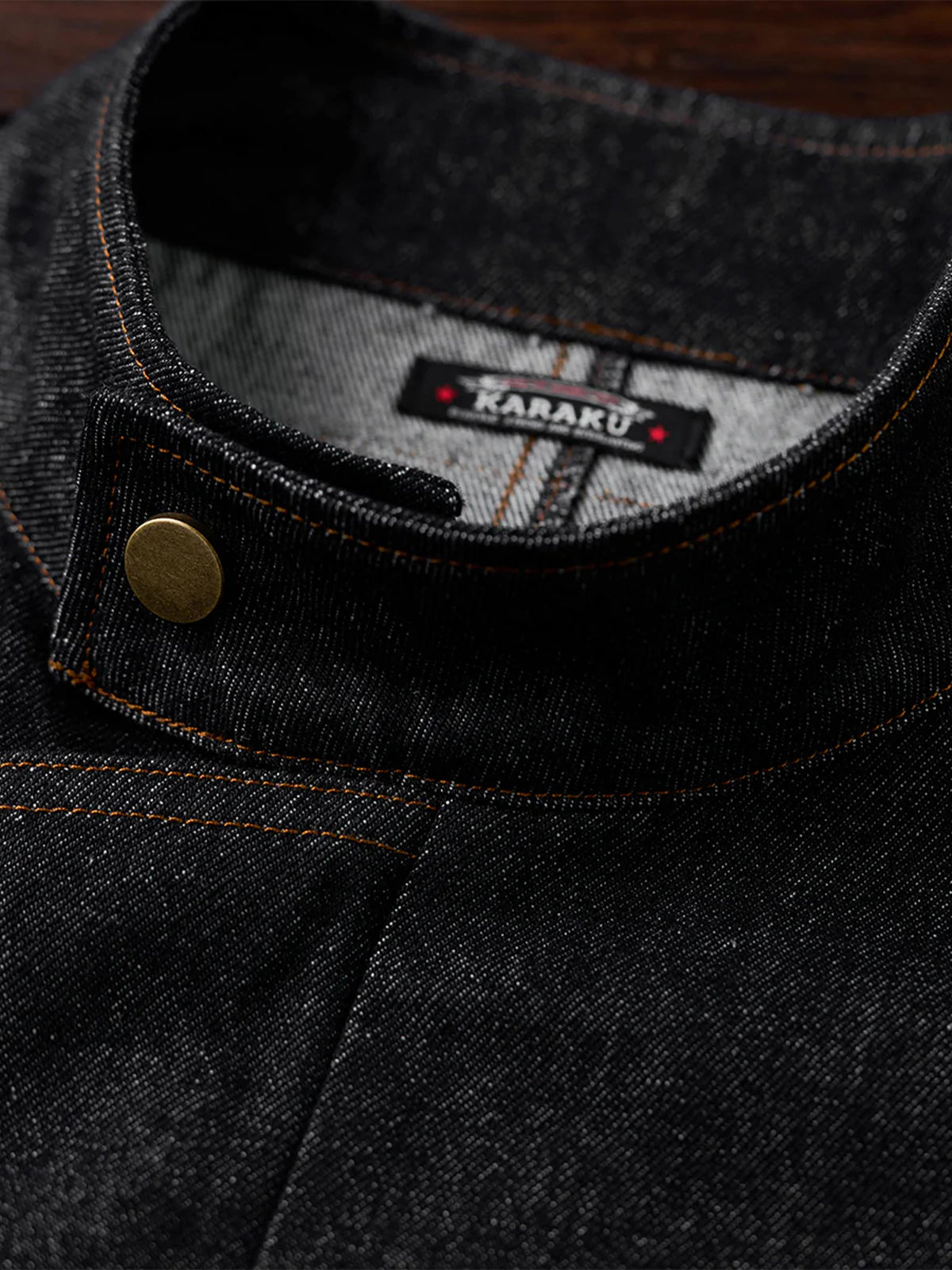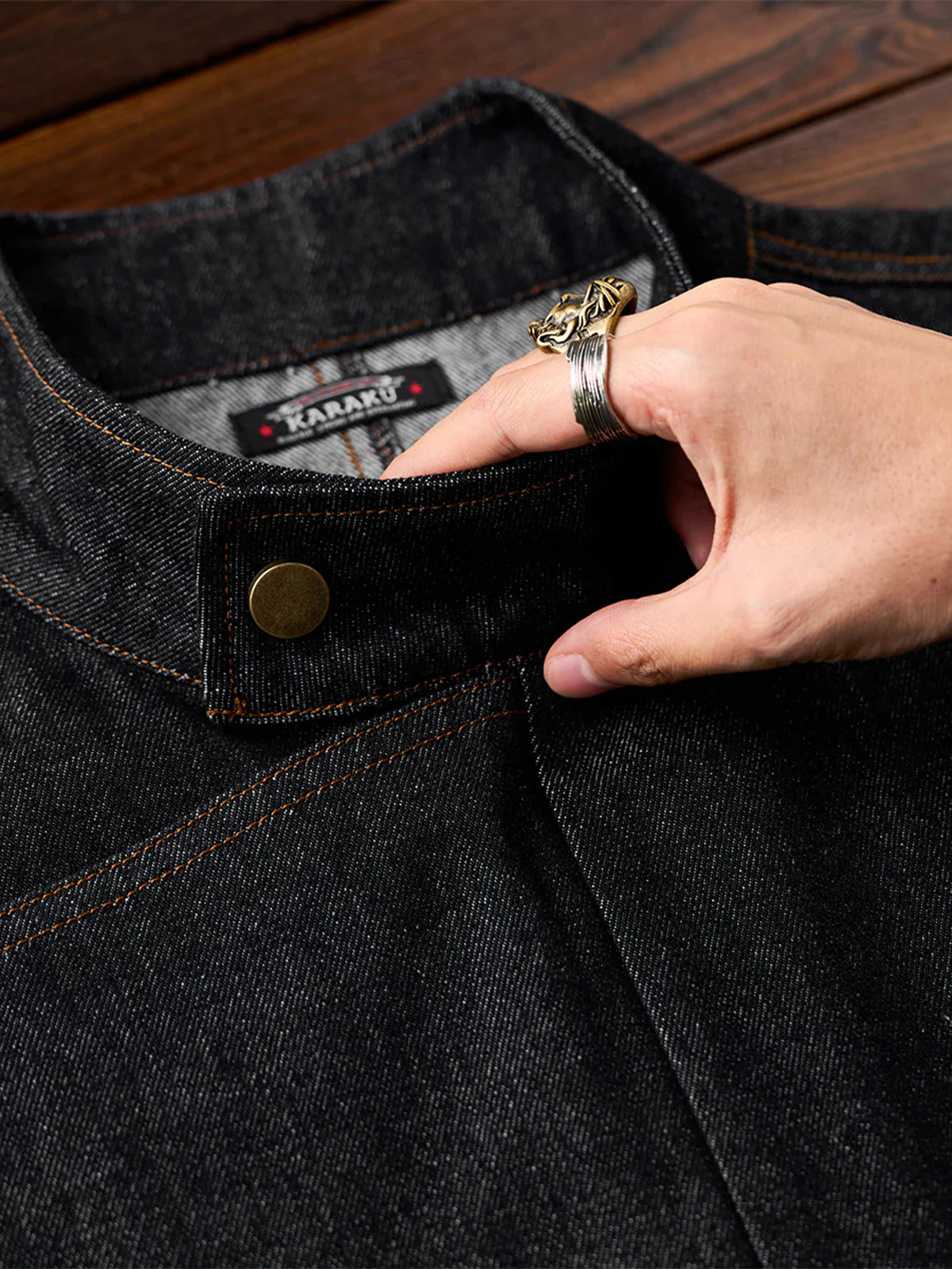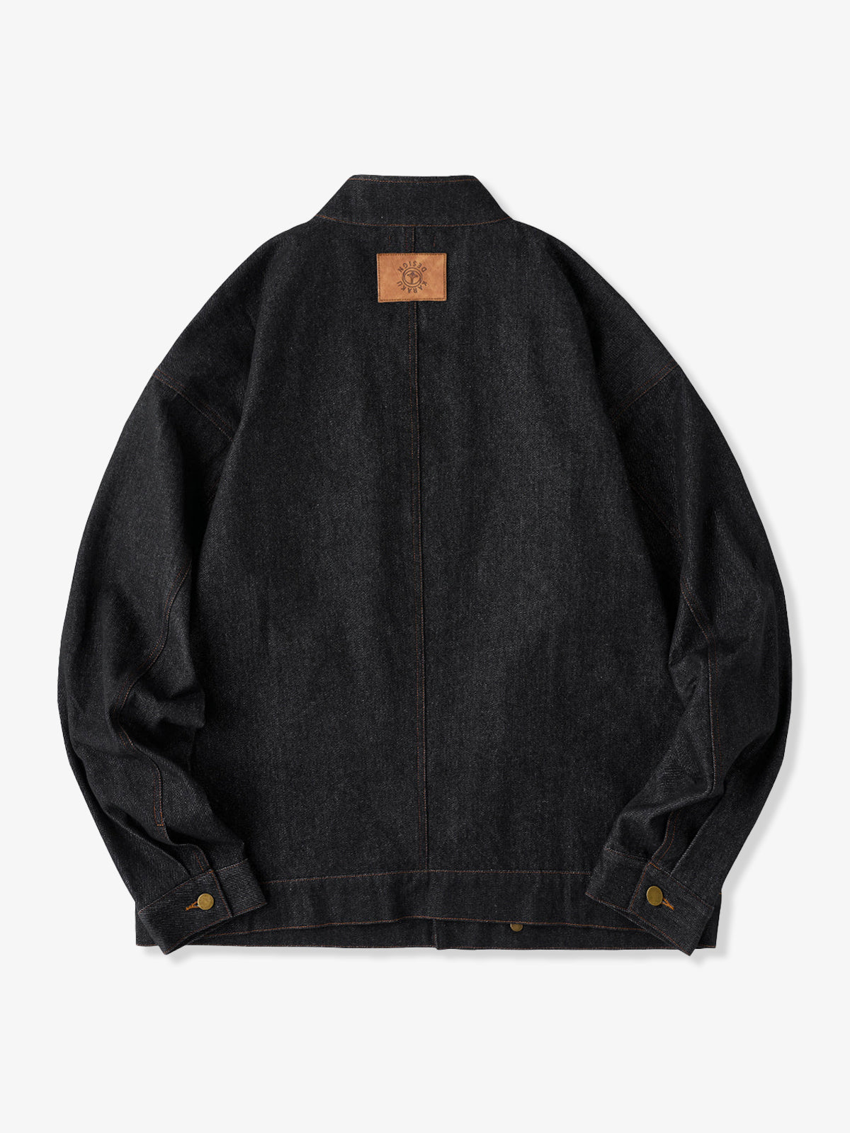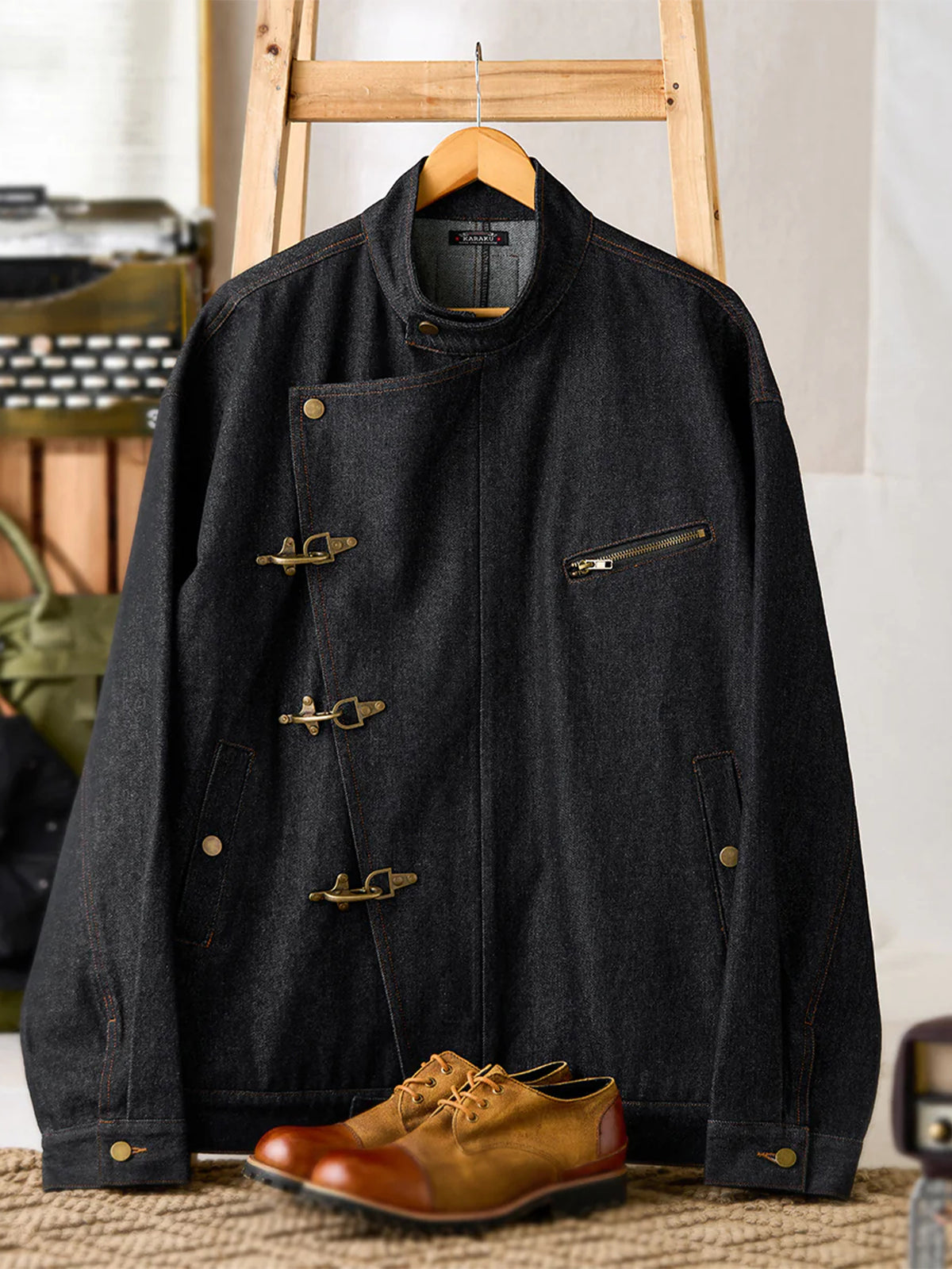[Pre-Order] Stand-Collar Denim Jacket with Asymmetrical Front Placket and Hook Buttons