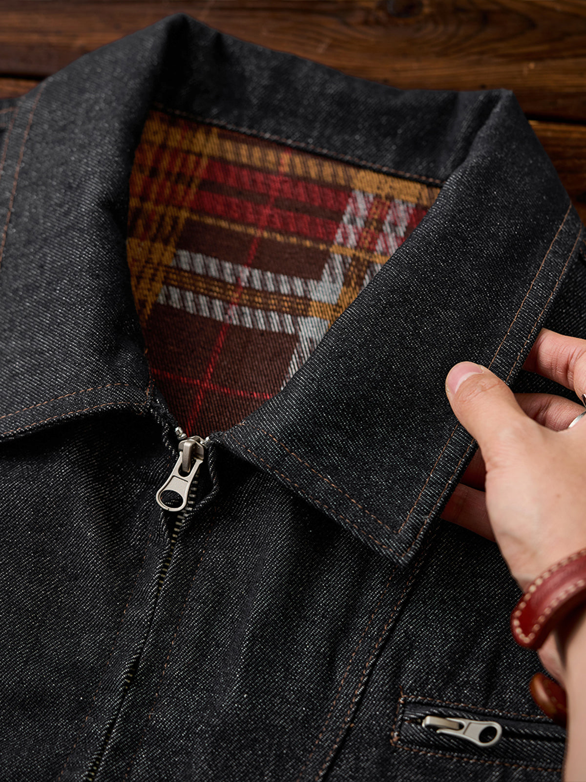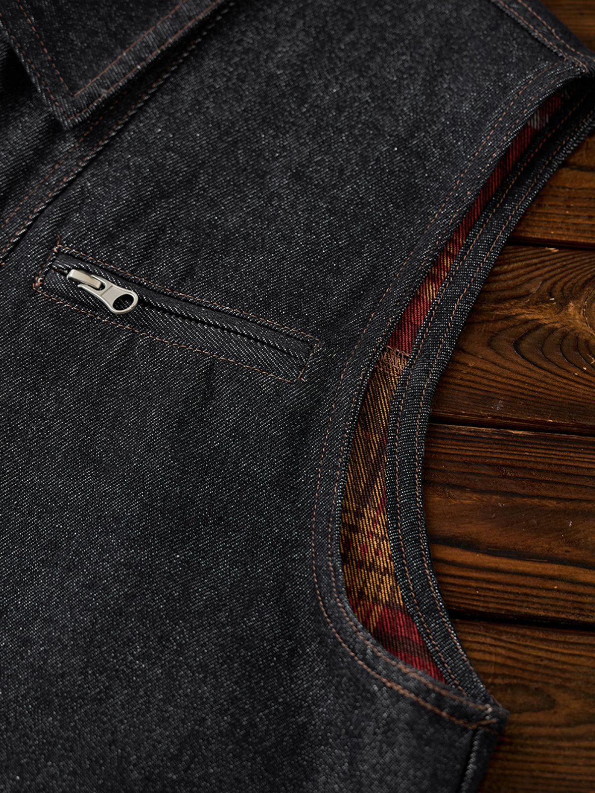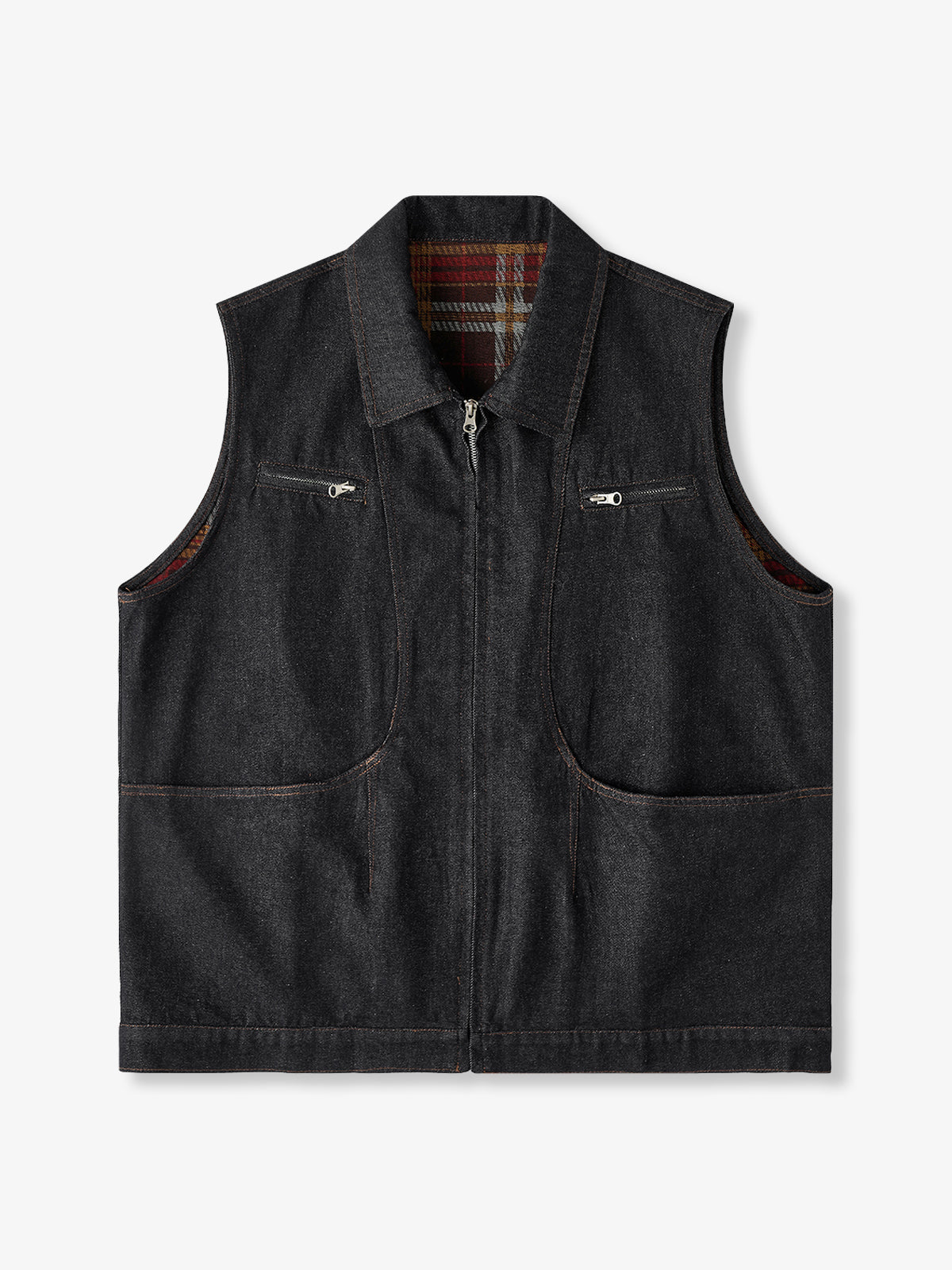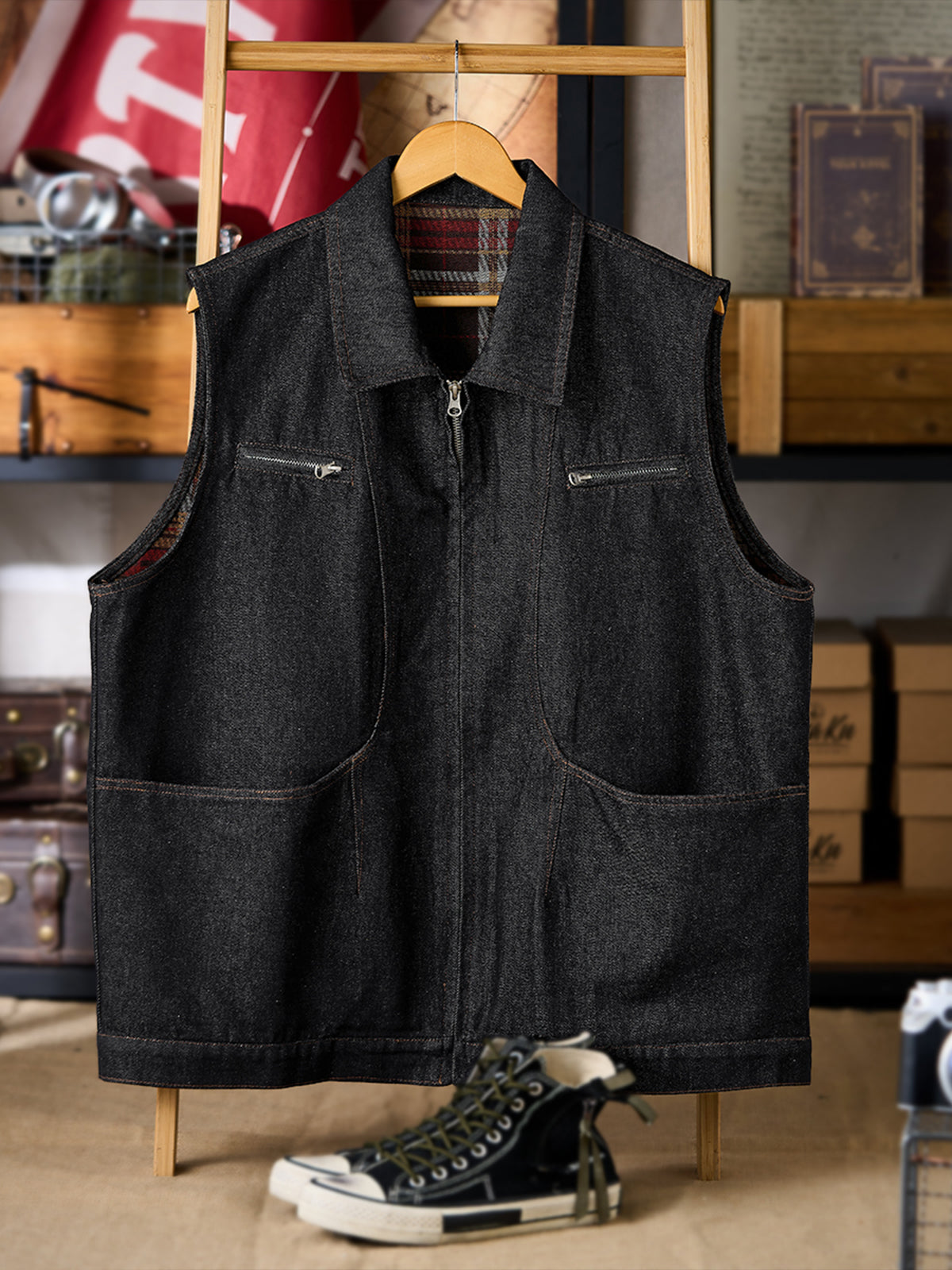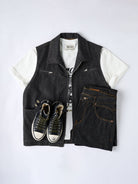 A vintage-inspired washed denim vest that exudes character and casual charm. The gently faded denim creates a worn-in look, giving off a subtle workwear and outdoor vibe. The check-patterned lining adds a playful accent, subtly visible when putting on or moving, highlighting the attention to detail. Multiple functional front pockets provide convenient storage for small items, combining practicality with style. Layer it over a shirt or T-shirt to add dimension and presence to your outfit. Perfect for casual, workwear, or outdoor-inspired looks, this denim vest is a versatile everyday piece.