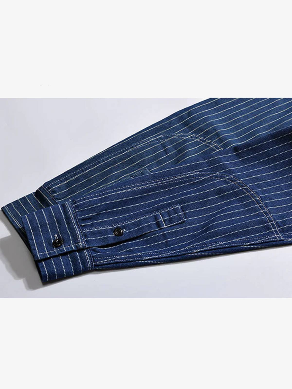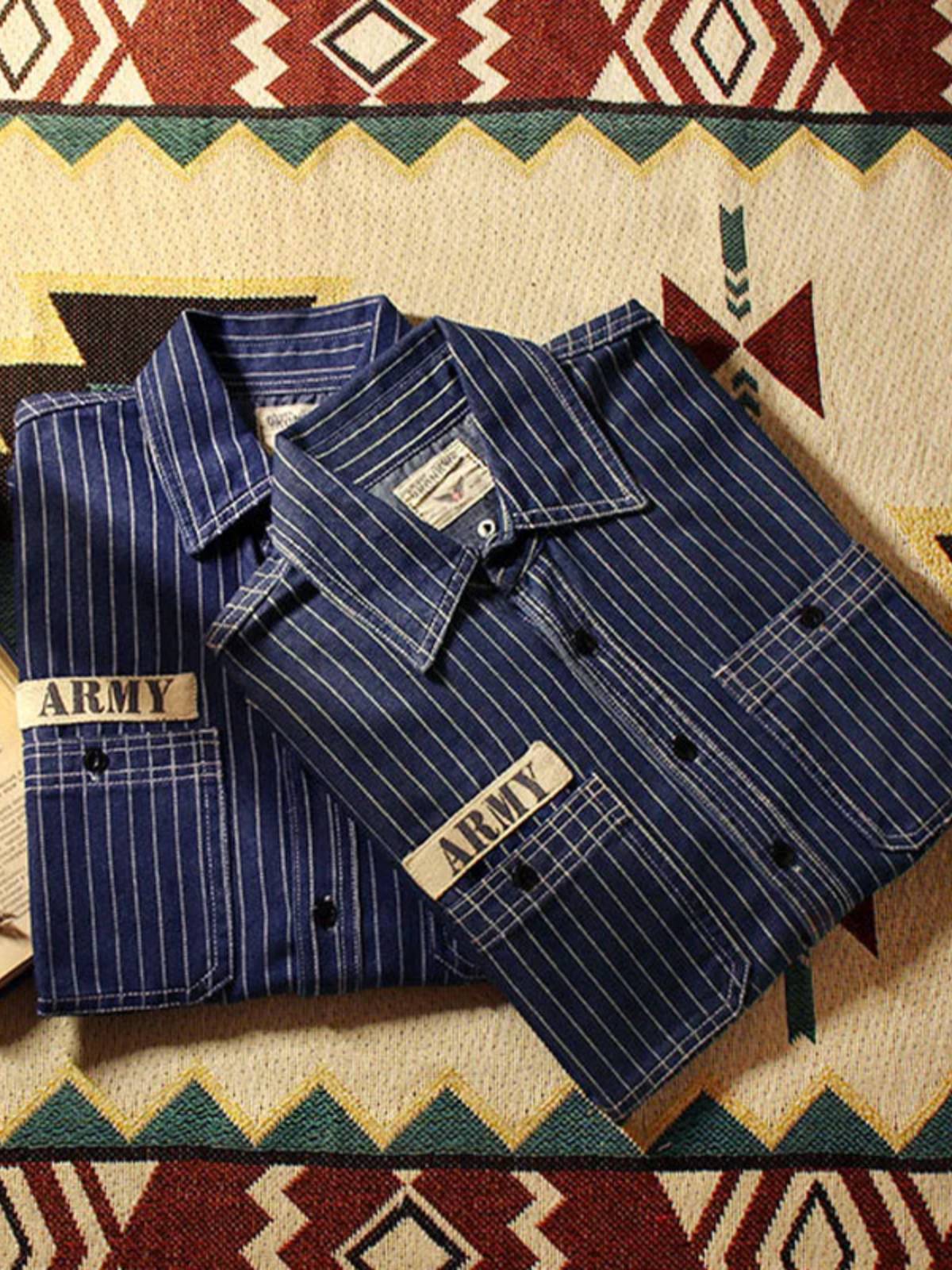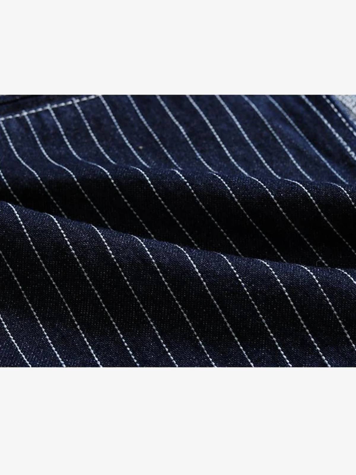 This work shirt features the iconic Wabash denim, beloved by vintage enthusiasts for its unique, dot-patterned stripes. Inspired by the Wabash River in Indiana, this fabric is rare due to its age and use in workwear. The denim's deep indigo and bleach-treated dots age beautifully over time. Perfect for casual or vintage-inspired looks, this shirt adds character and history to any wardrobe.