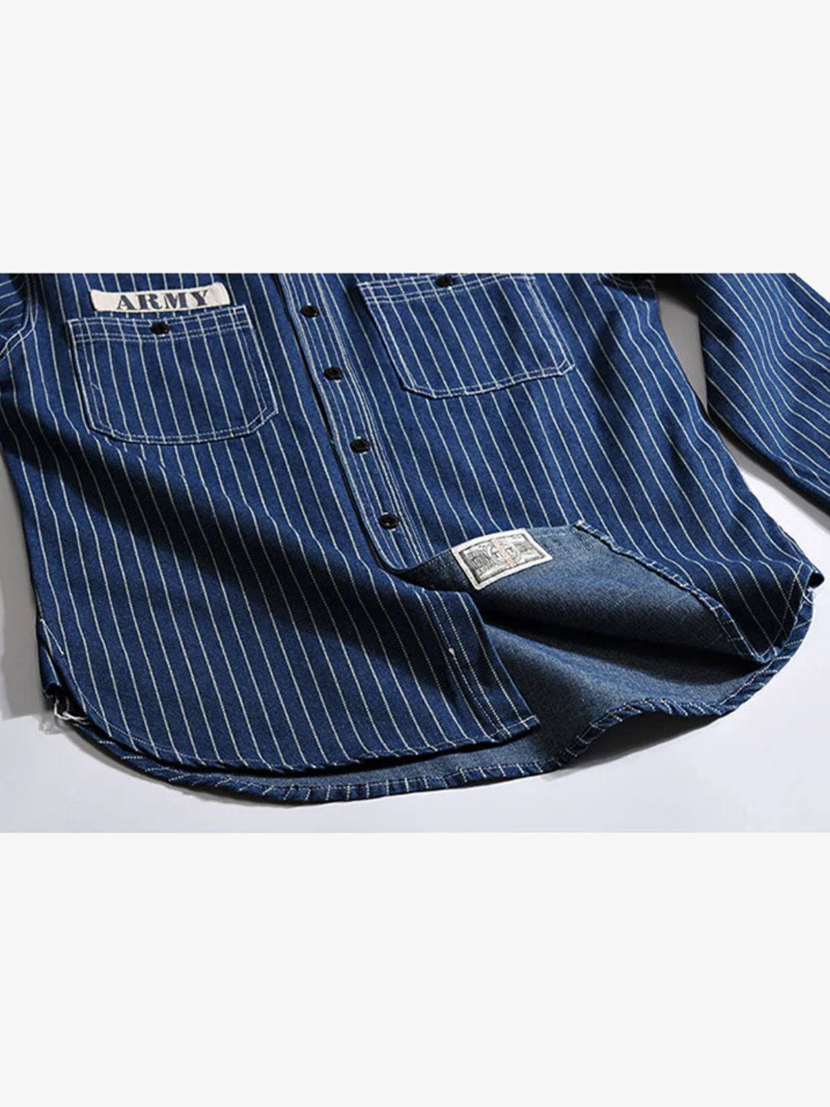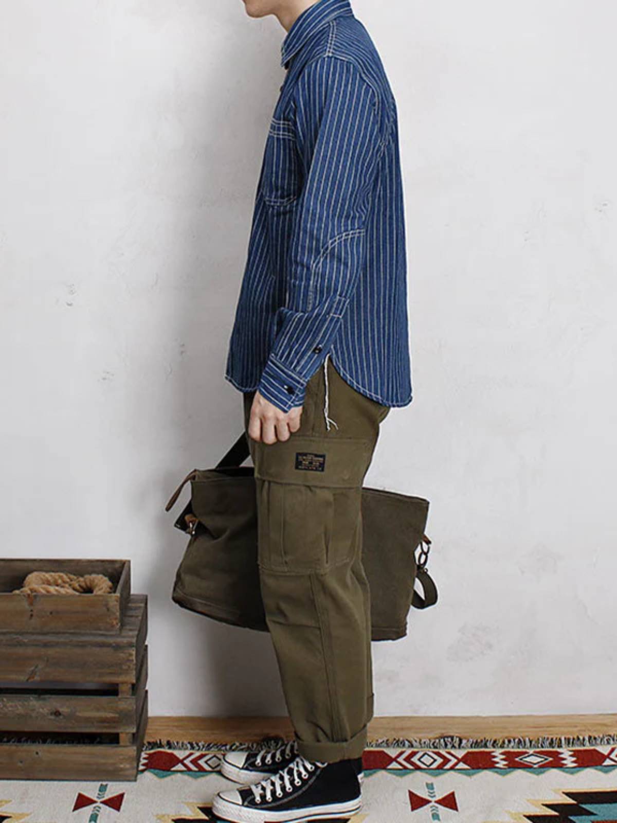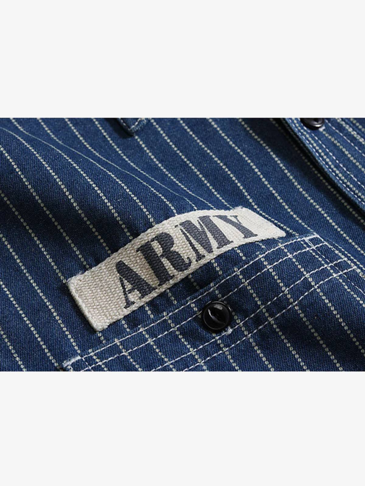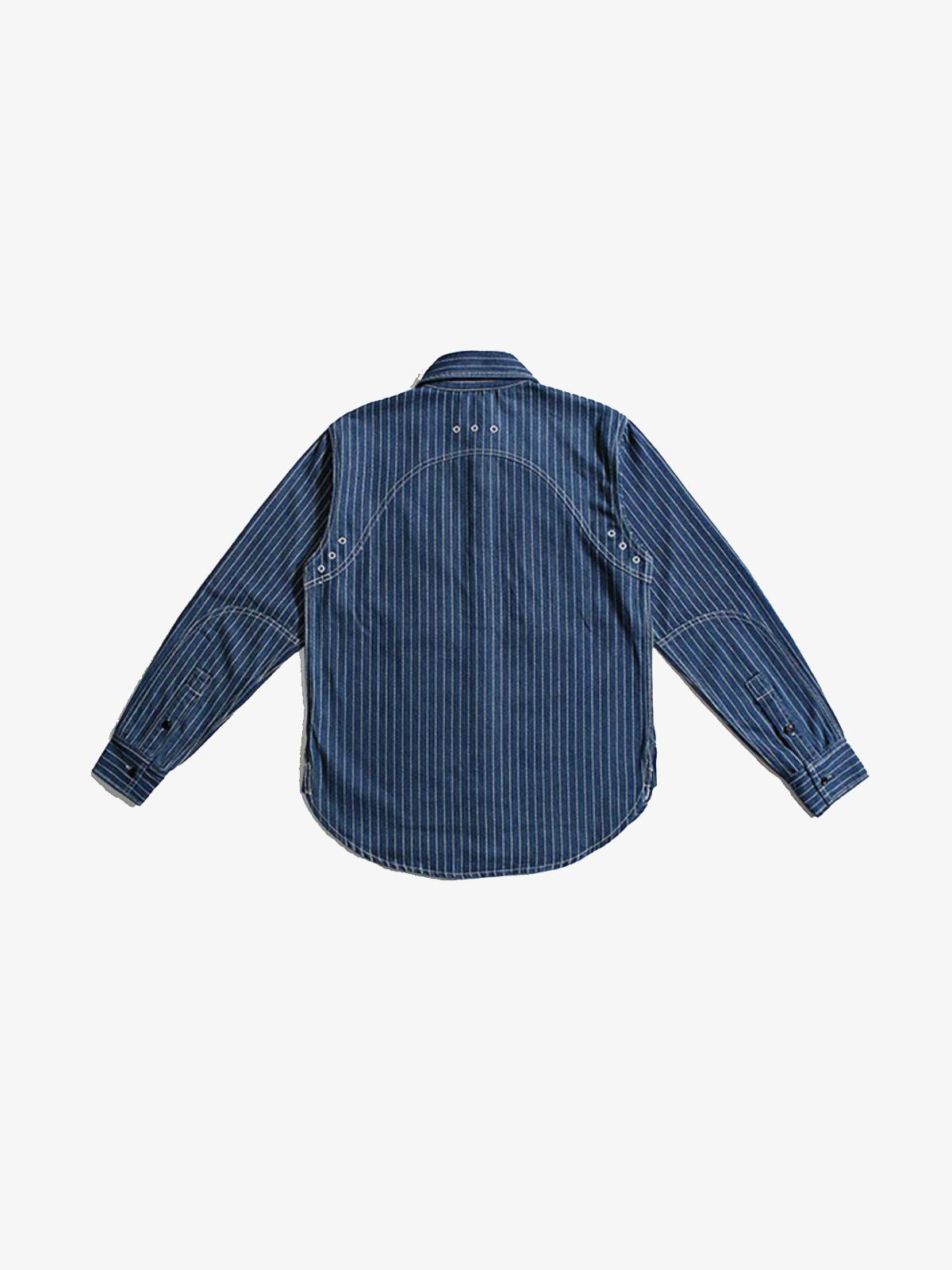 This work shirt features the iconic Wabash denim, beloved by vintage enthusiasts for its unique, dot-patterned stripes. Inspired by the Wabash River in Indiana, this fabric is rare due to its age and use in workwear. The denim's deep indigo and bleach-treated dots age beautifully over time. Perfect for casual or vintage-inspired looks, this shirt adds character and history to any wardrobe.