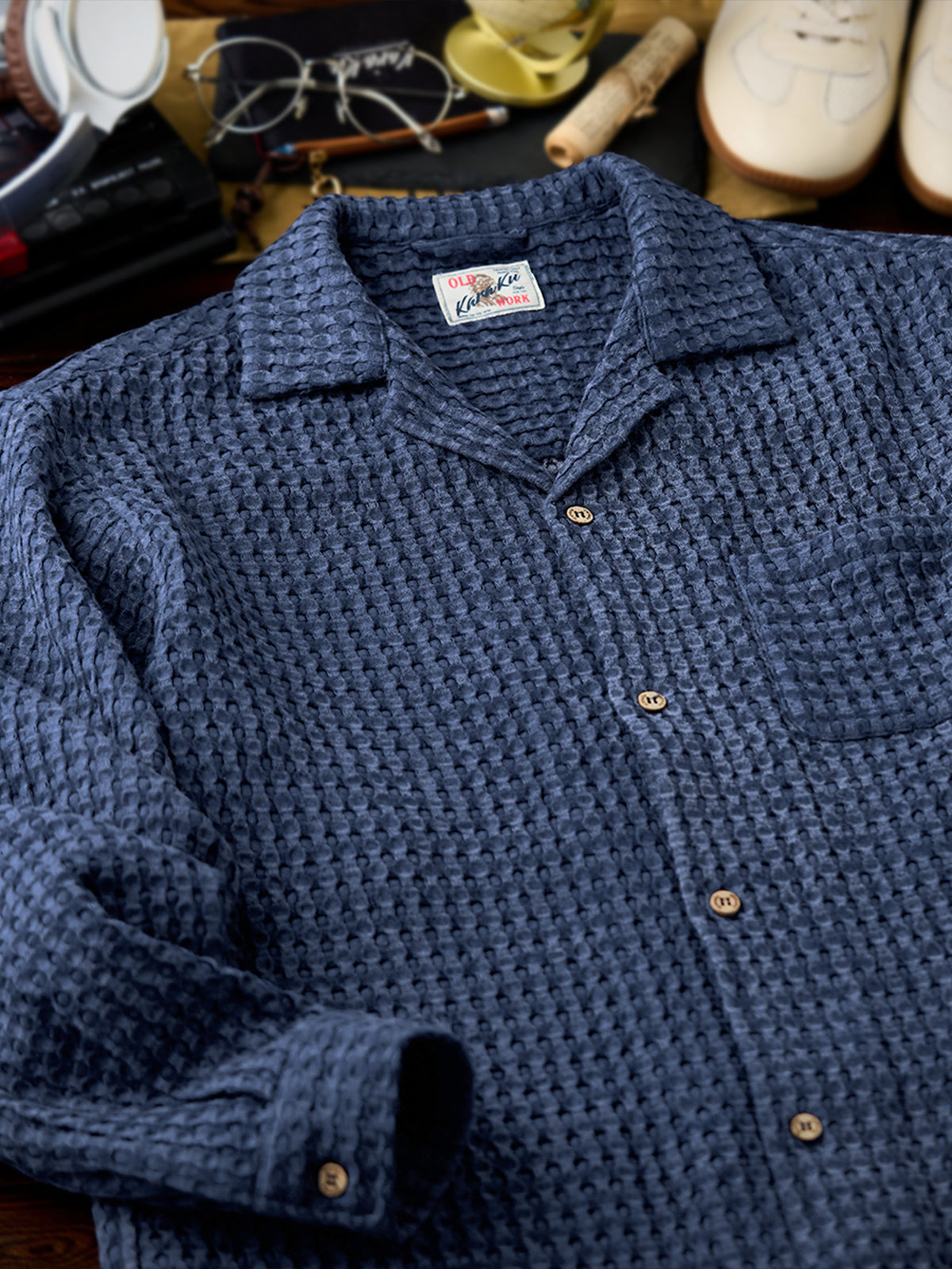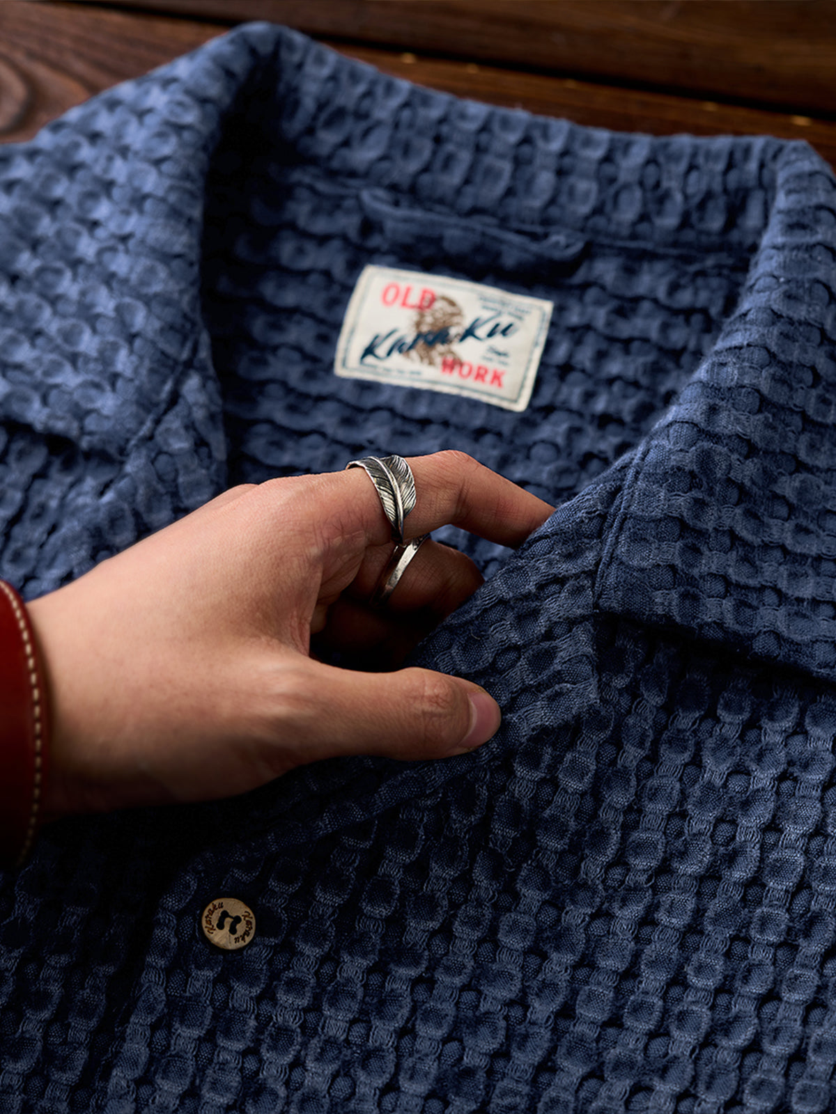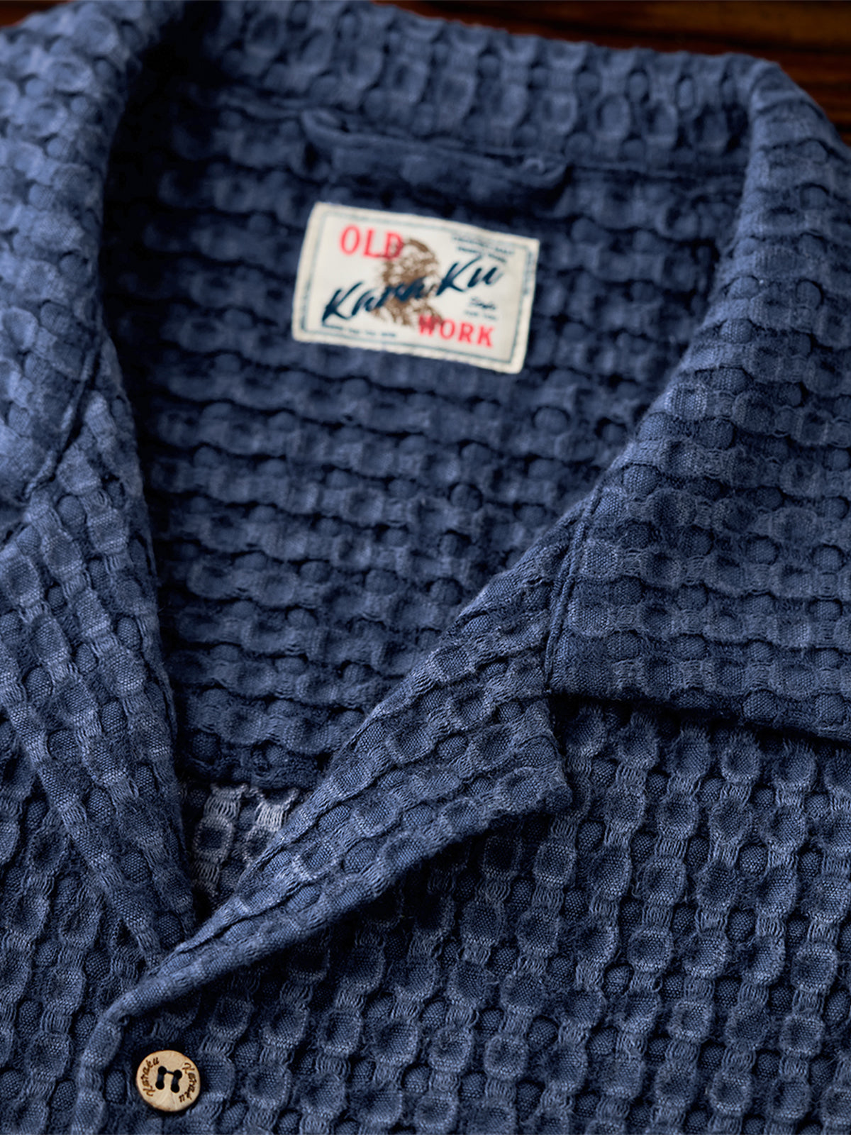 "Indigo-Dyed Series" Cotton-Linen Aloha Shirt with Toucan & Monstera Print