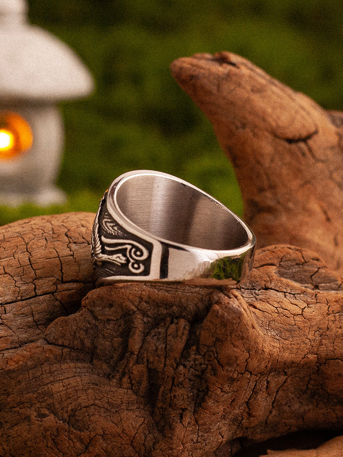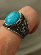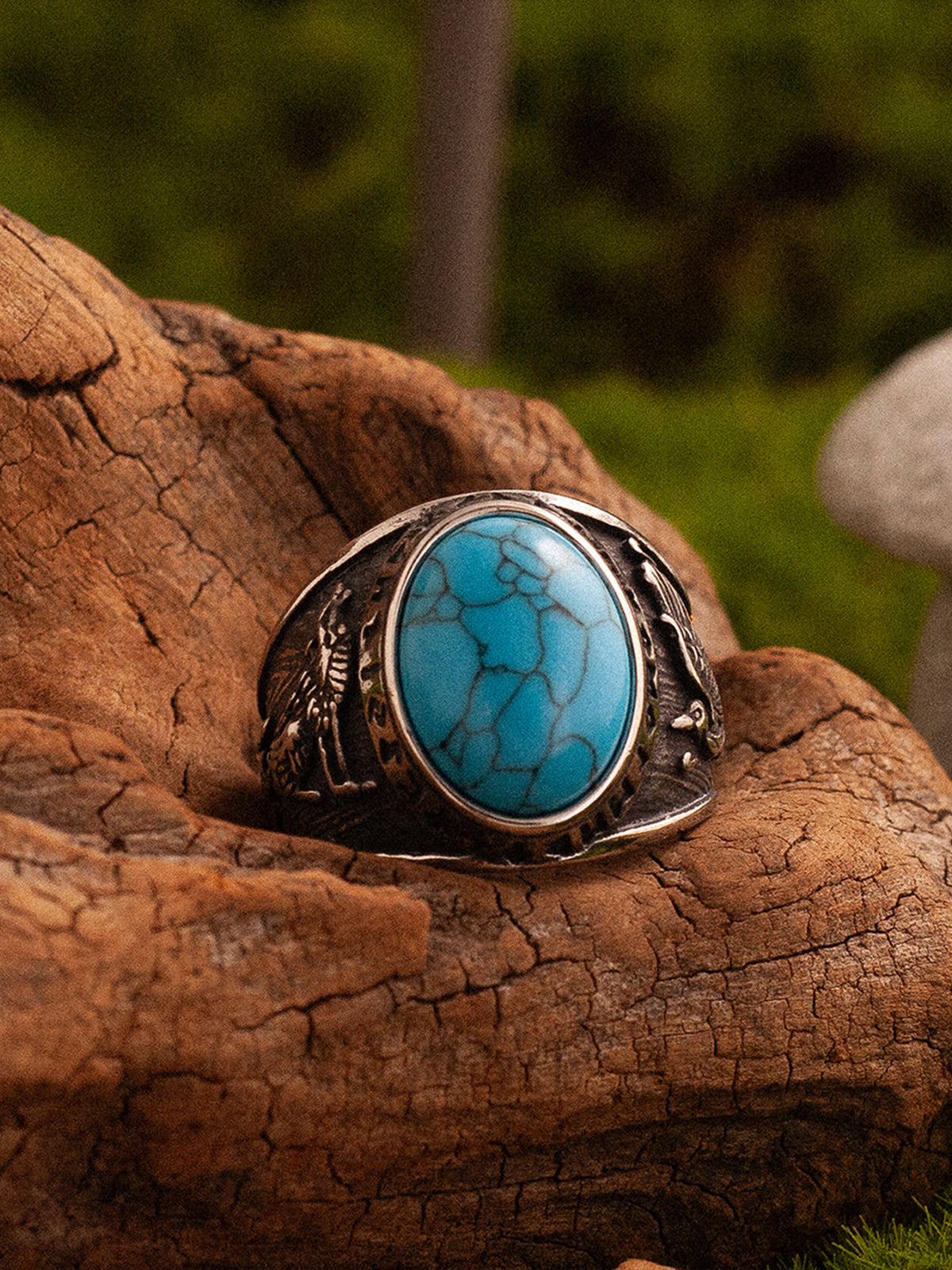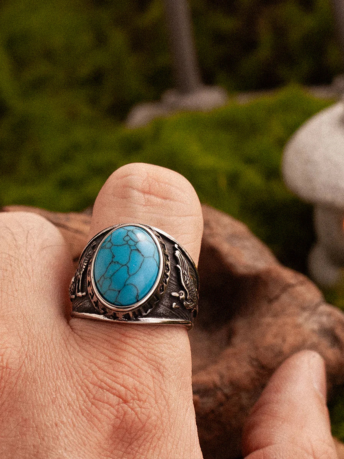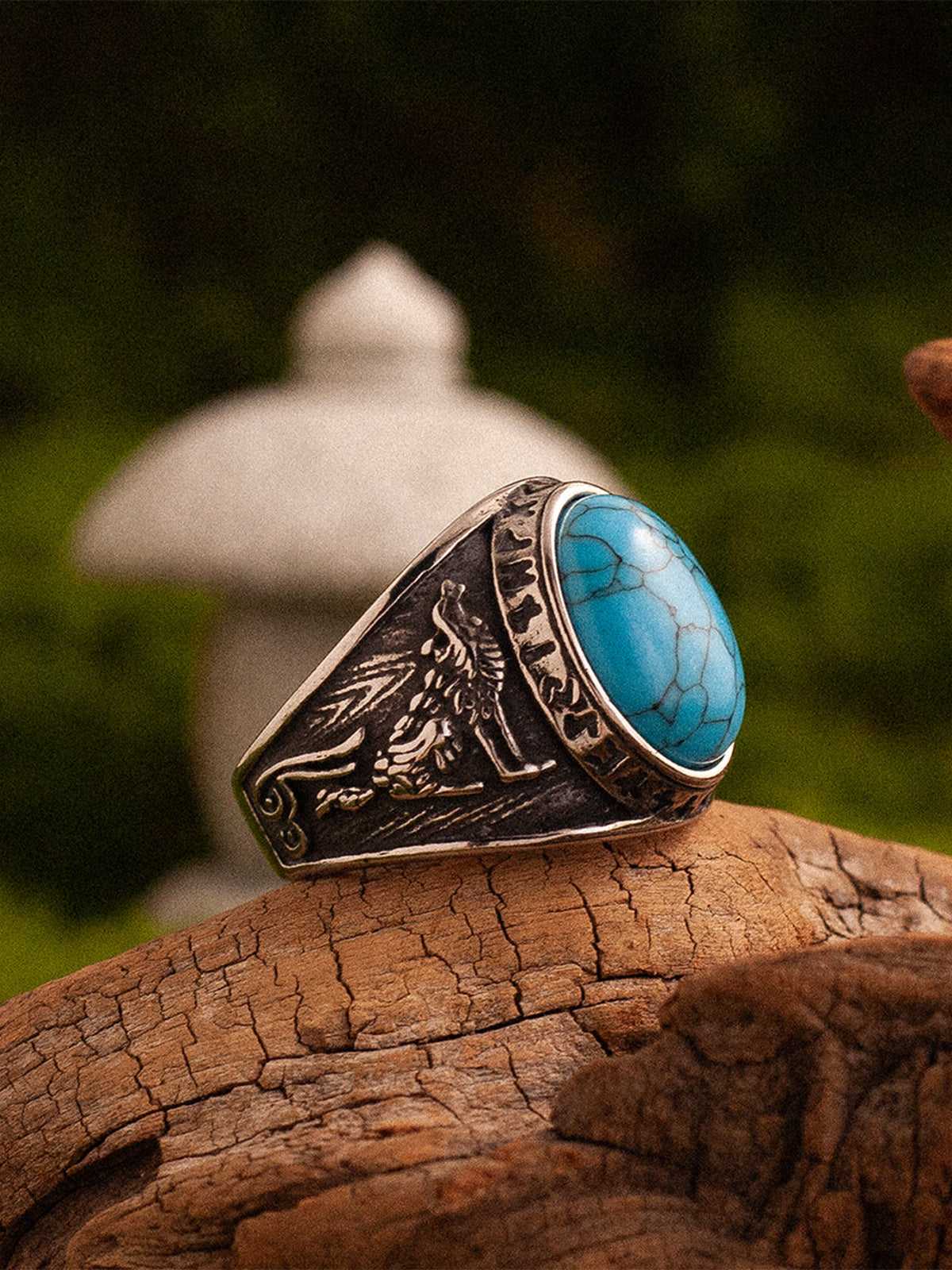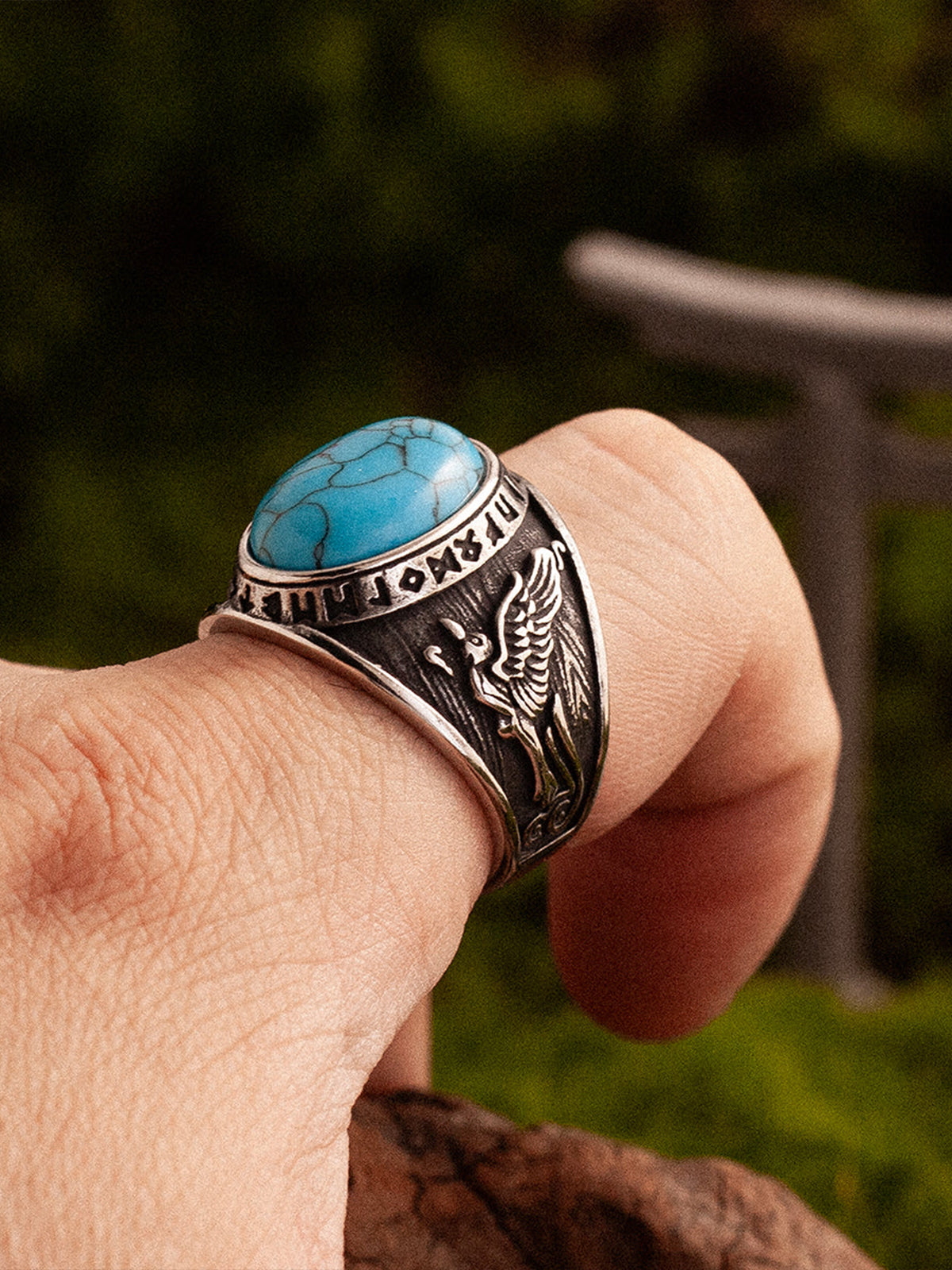 This titanium steel ring features an oval natural turquoise at its center, adding a vivid accent to the bold design. Surrounding rune engravings draw from Norse mythology, while the sides showcase a griffon motif symbolizing strength and protection. Crafted from durable titanium steel, it combines lasting wear with mystical detail.