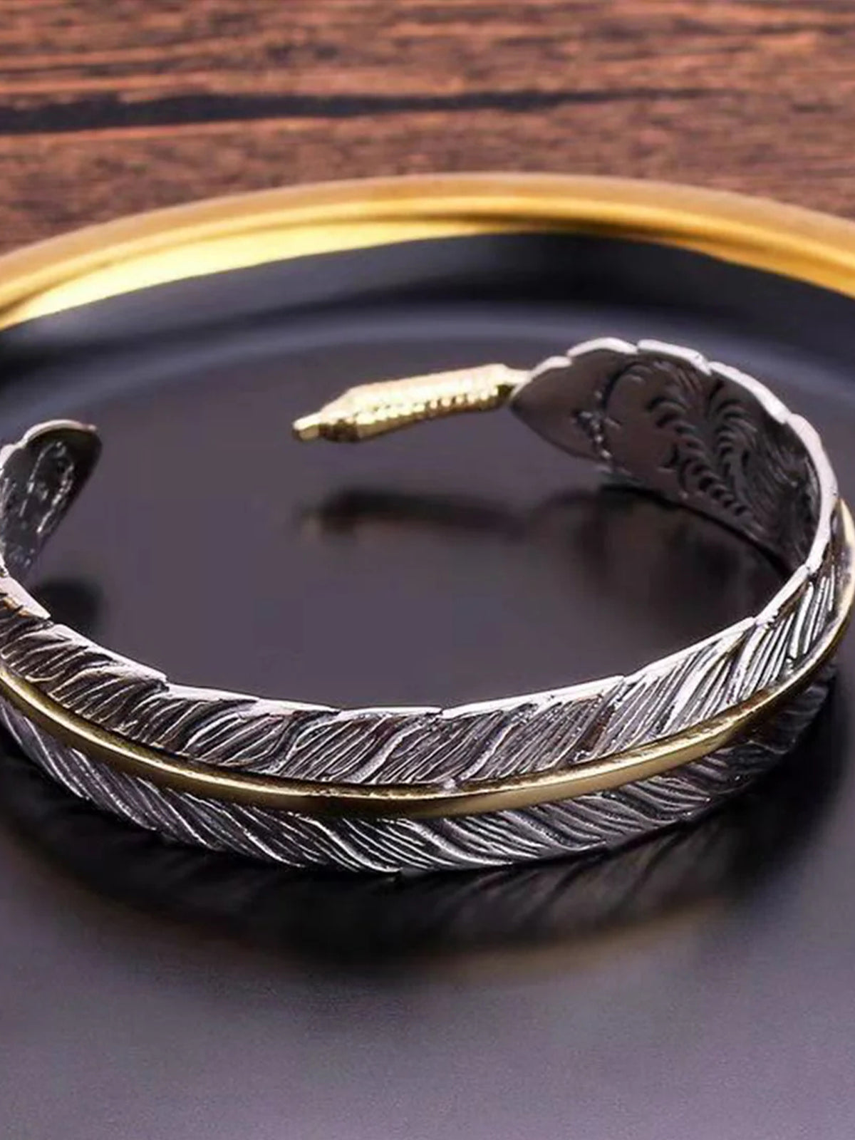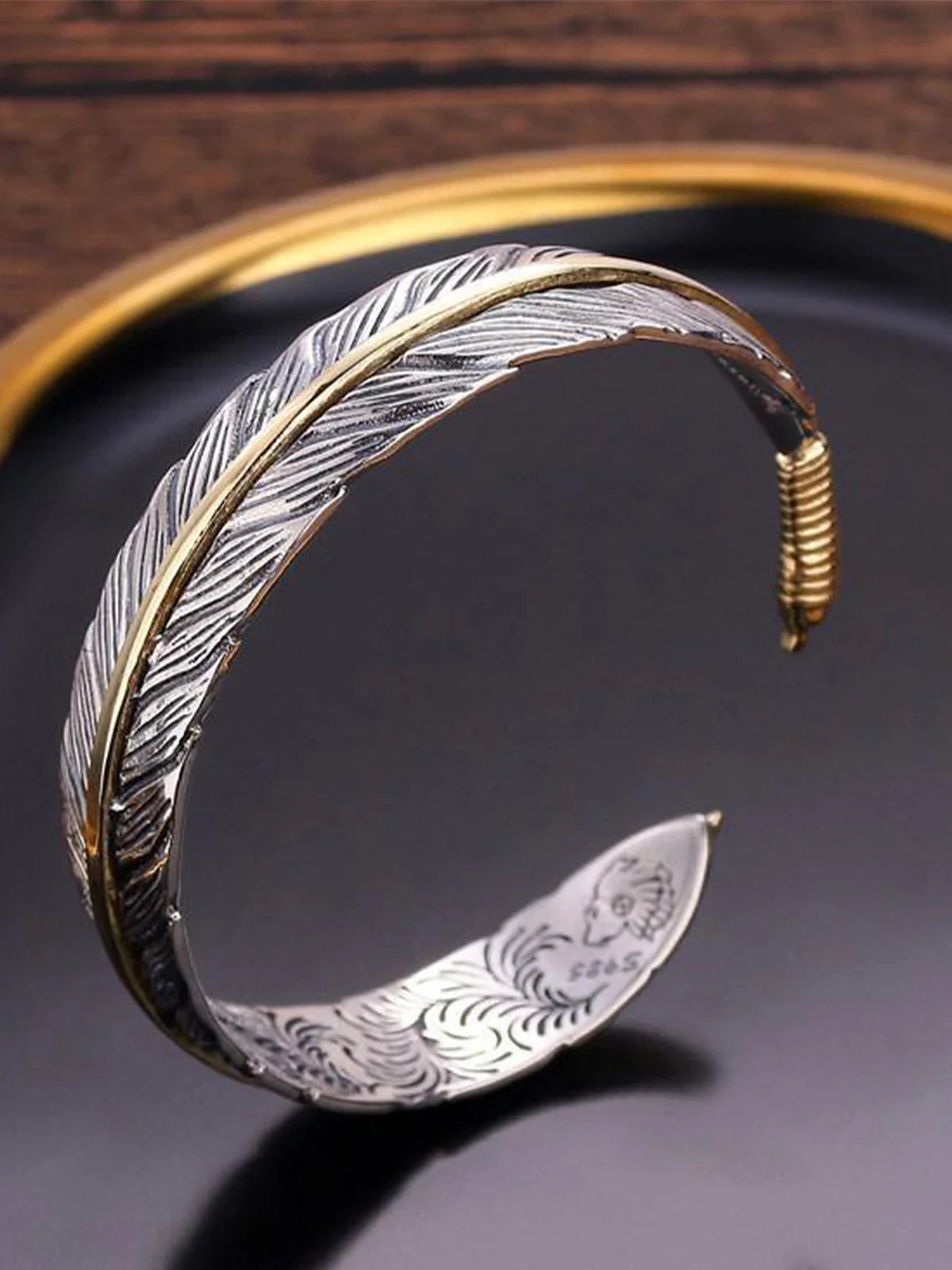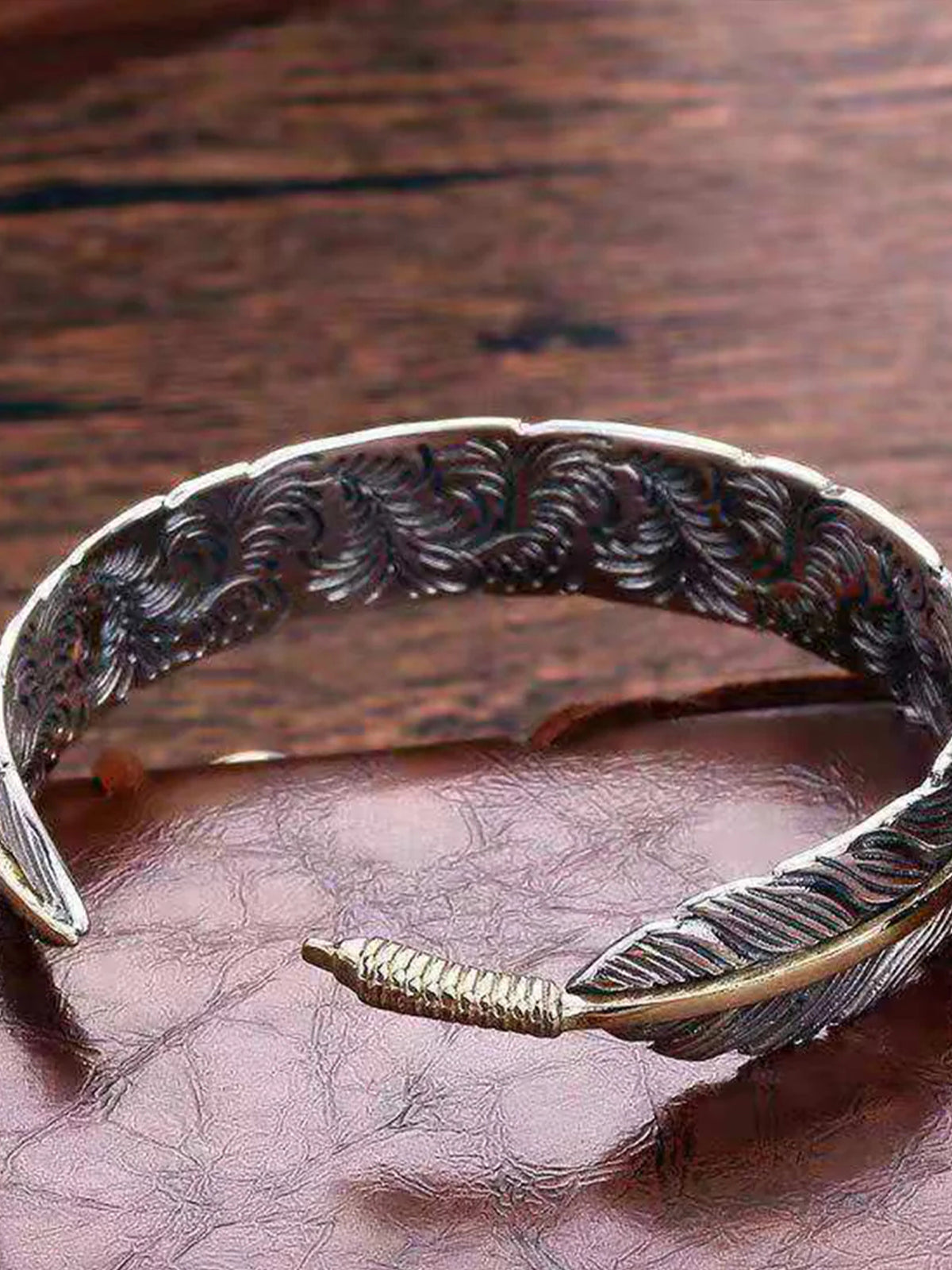 A silver bangle featuring a feather motif with delicate details that stand out. Its open-ended design allows for easy adjustment to fit any wrist size. This unisex piece suits all genders. The inside is adorned with flowing arabesque patterns, combining classic elegance with individuality. Crafted with intricate hand engraving by skilled artisans, the bangle exudes sophistication despite its bold presence.