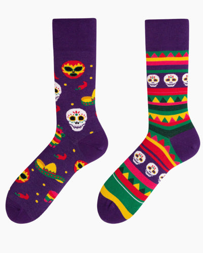 Celebrate Dia de los Muertos in style with our dark purple socks! One features a classic Day of the Dead skull adorned with a festive hat and peppers, while the other showcases vibrant colors and small skulls. Made from a soft cotton blend, these socks offer breathability, durability, and all-day comfort, ensuring your feet stay cozy and stylish.