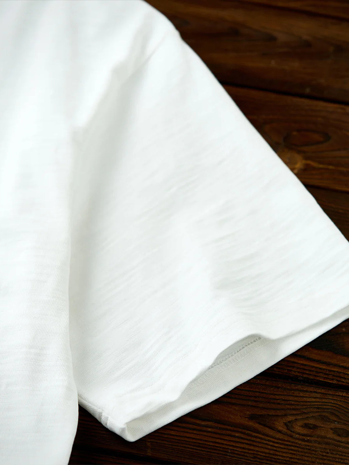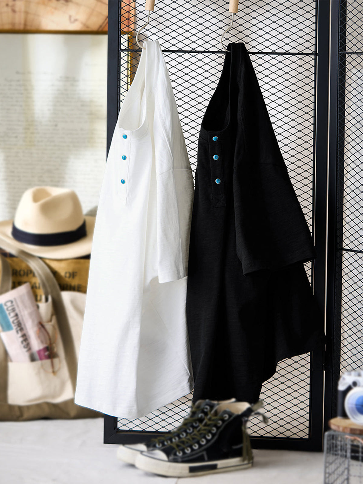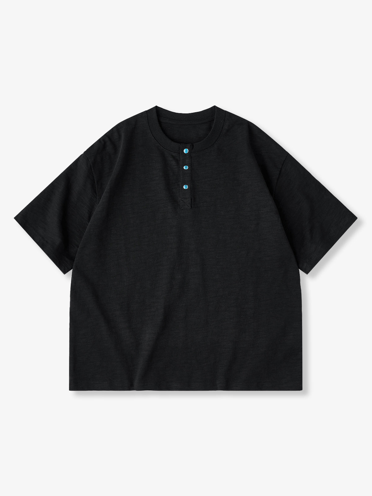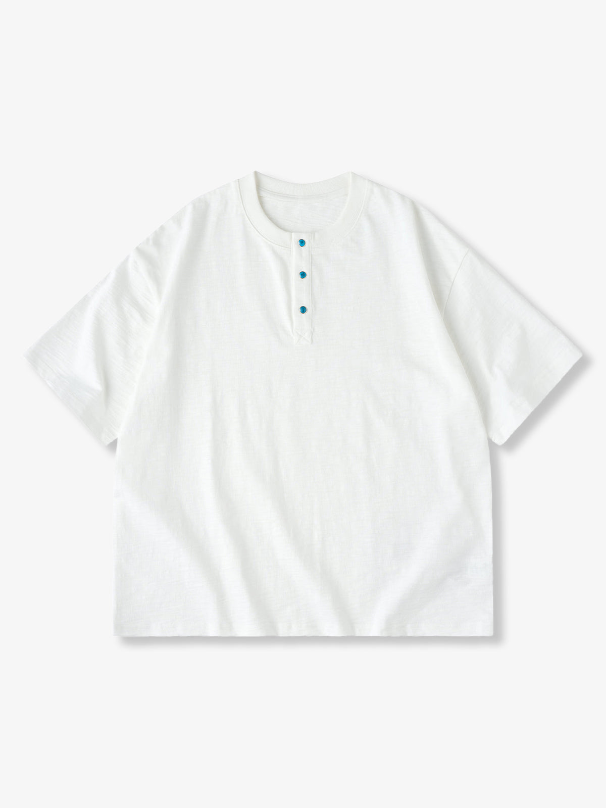 This heavyweight 320g Henley T-shirt is made from slub cotton, known for its vintage-inspired texture. The irregularities in the yarn create a richly expressive fabric that develops character with wear and ages beautifully over time. The chest features turquoise-style snap buttons that serve not only as eye-catching accents but also provide smooth opening and closing. Details evoke a sense of workwear and American vintage. The silhouette offers a relaxed fit for comfort while maintaining a refined appearance without looking too casual.