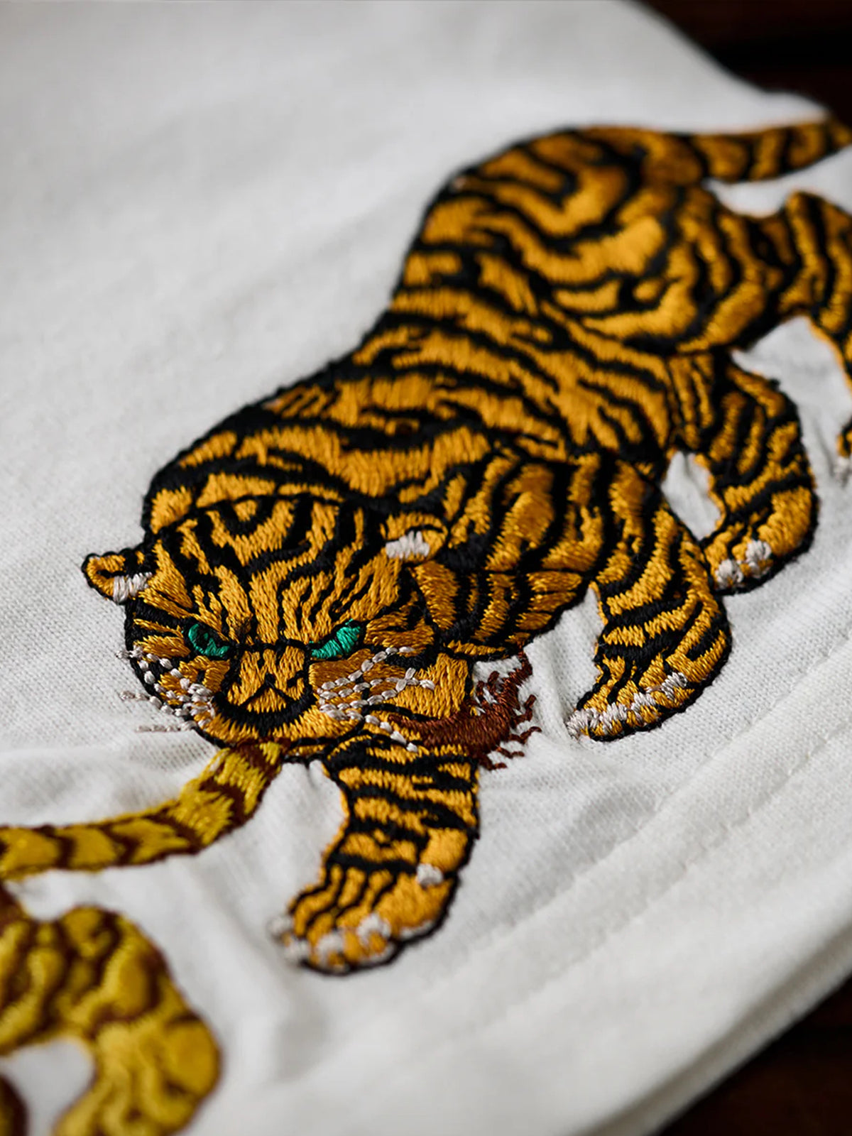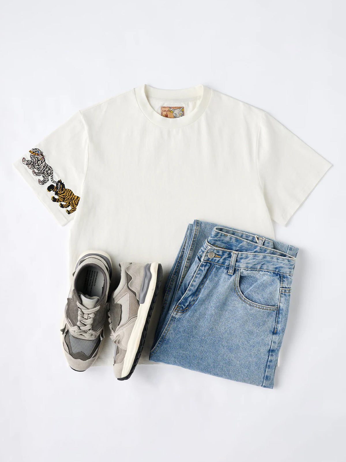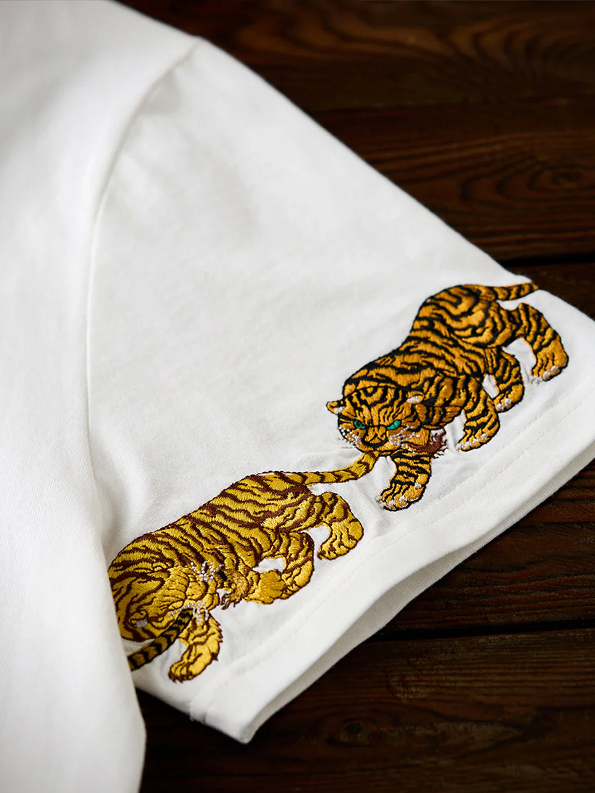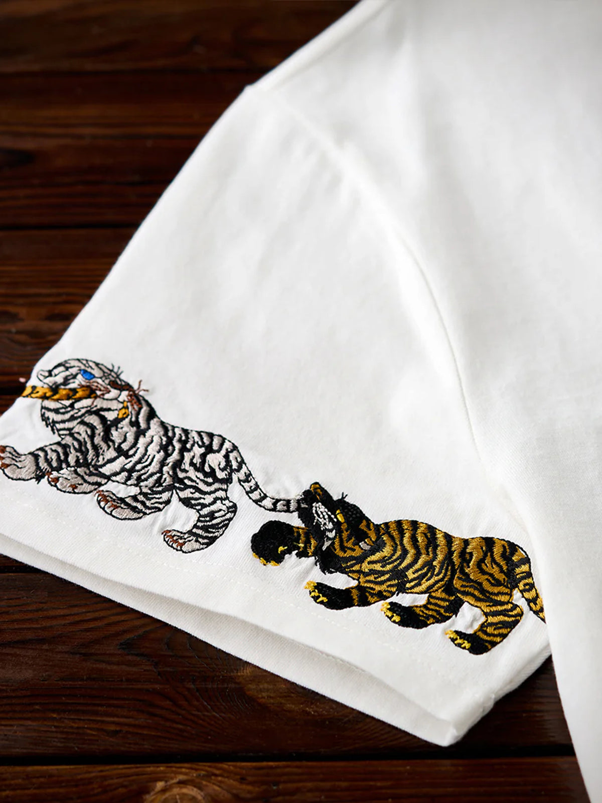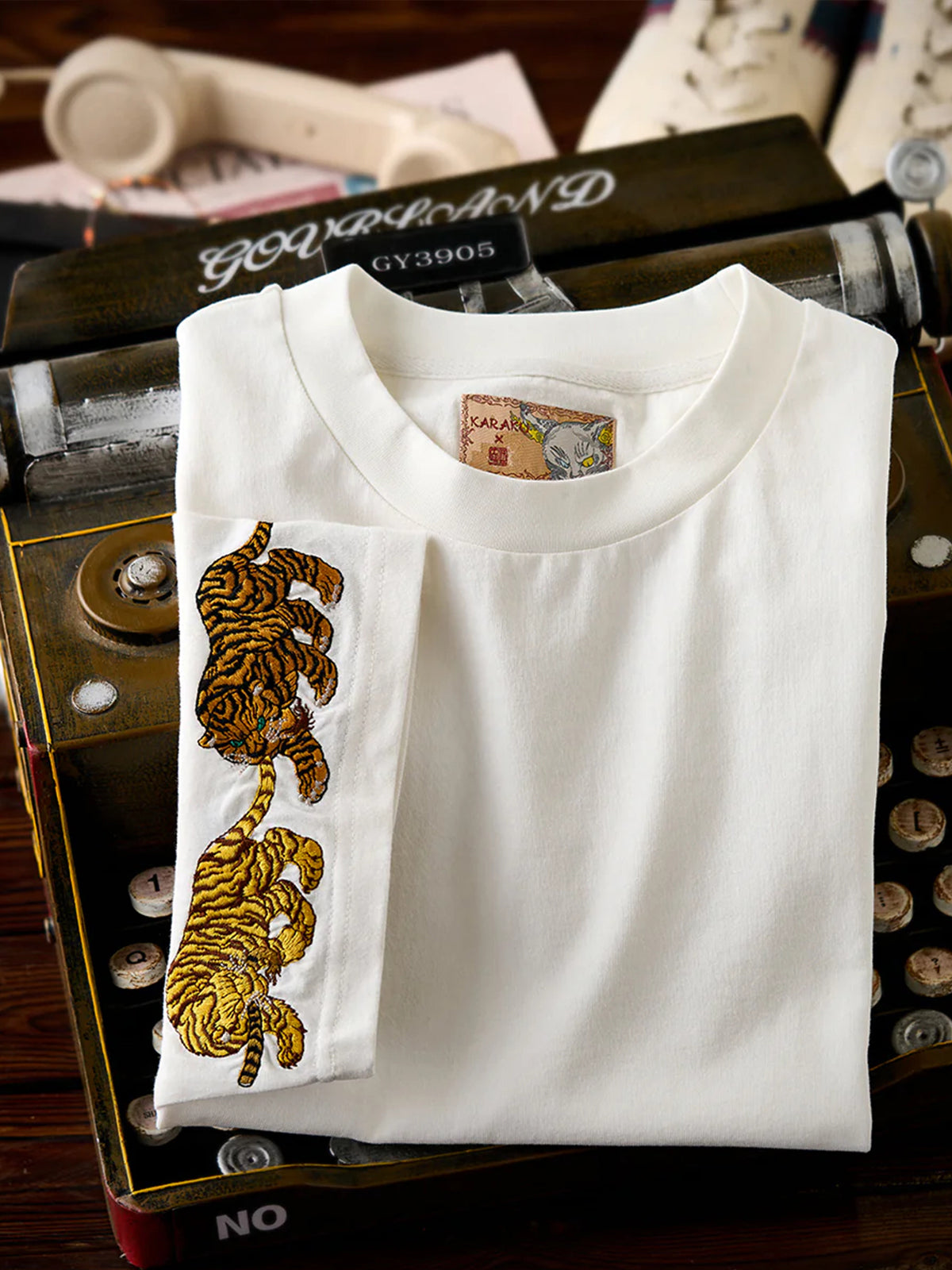 KARAKU×Ayako Ishiguro "Tiger Row Biting the Tail" Sleeve Embroidery Cotton T-Shirt