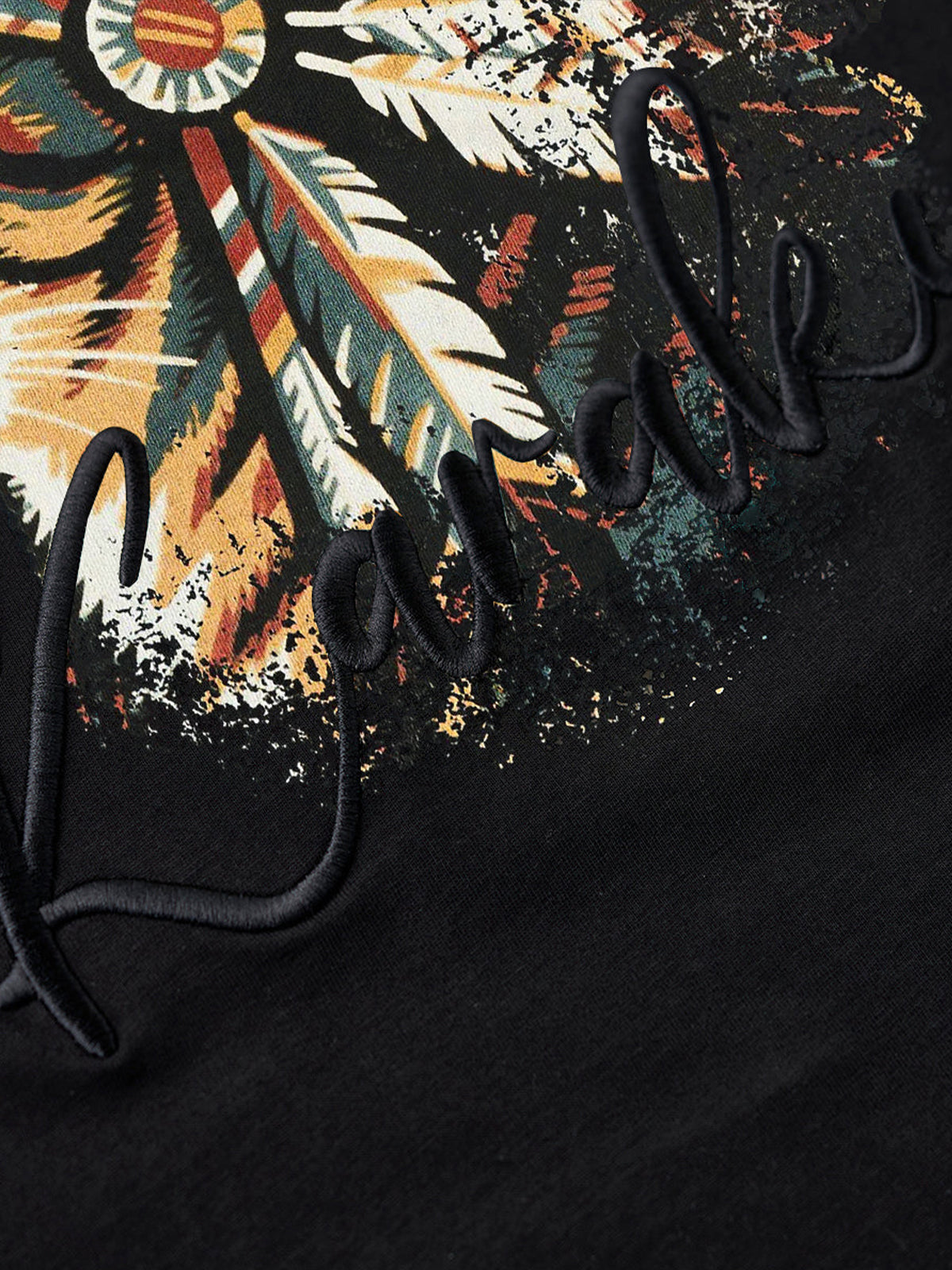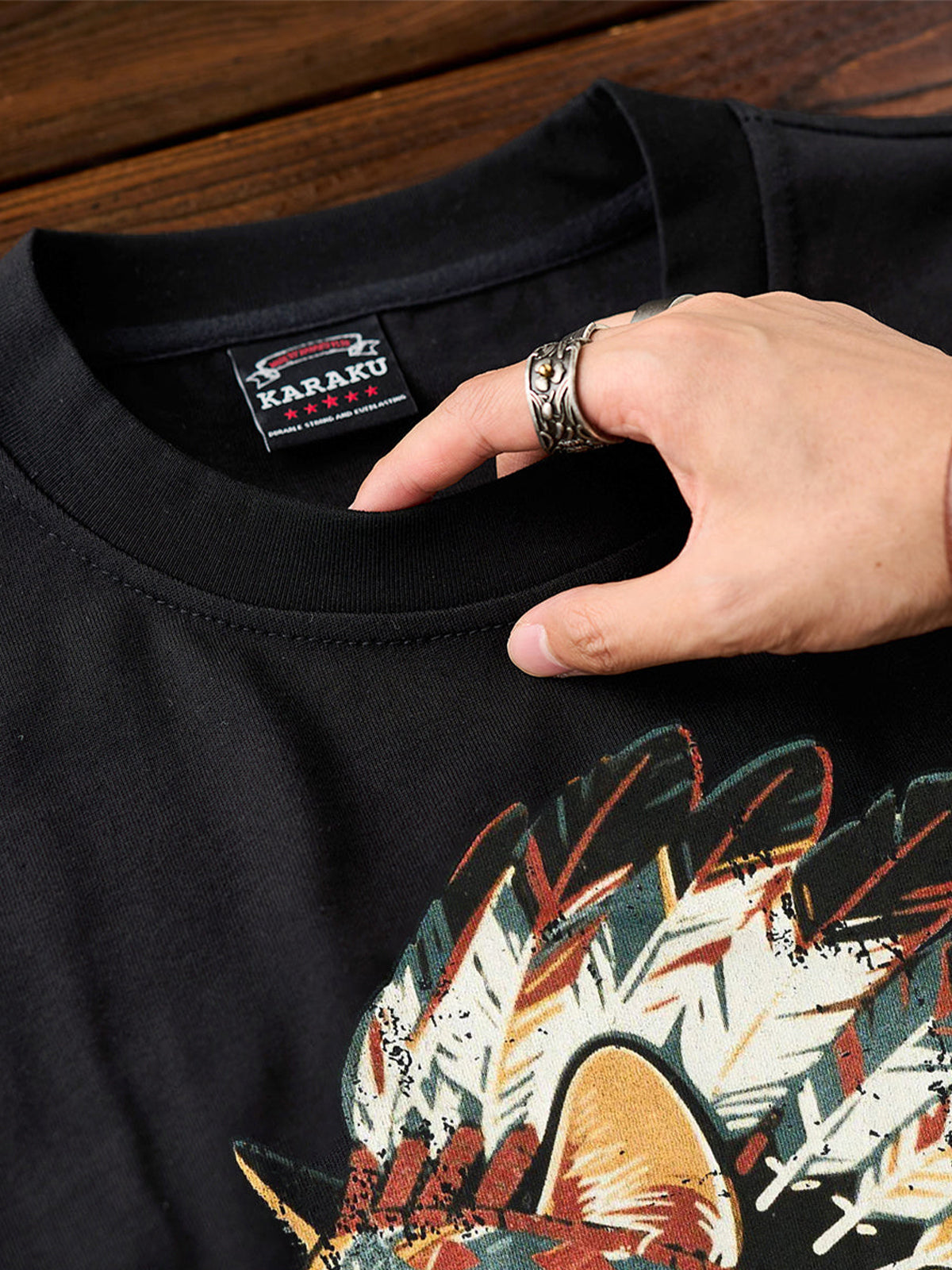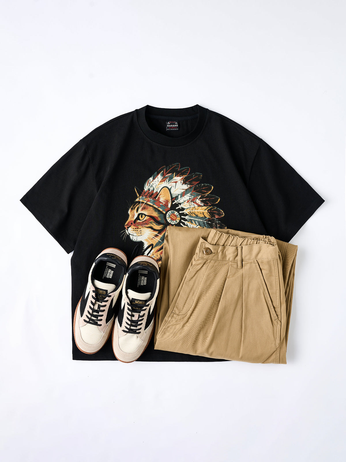 The front features a bold print of a "cat" wearing feather headdress like an Indian chief. The somewhat proud yet humorous expression tickles the hearts of those who see it. The "karaku" logo is embroidered underneath the print, firmly asserting the brand's commitment and individuality. The moderately loose silhouette makes it look great not only as a single piece but also as an inner layer under a jacket. A playful T-shirt that combines humor and art, typical of karaku. Make it the main focus of your outfit.