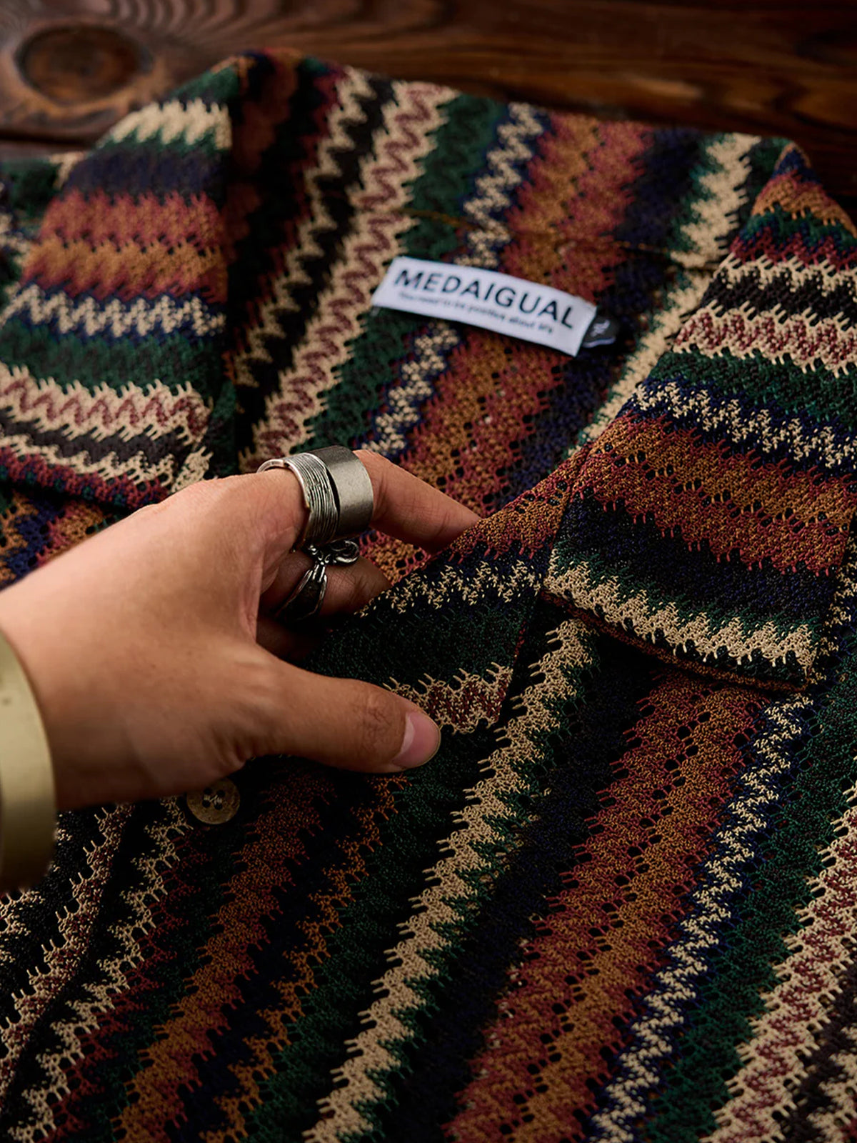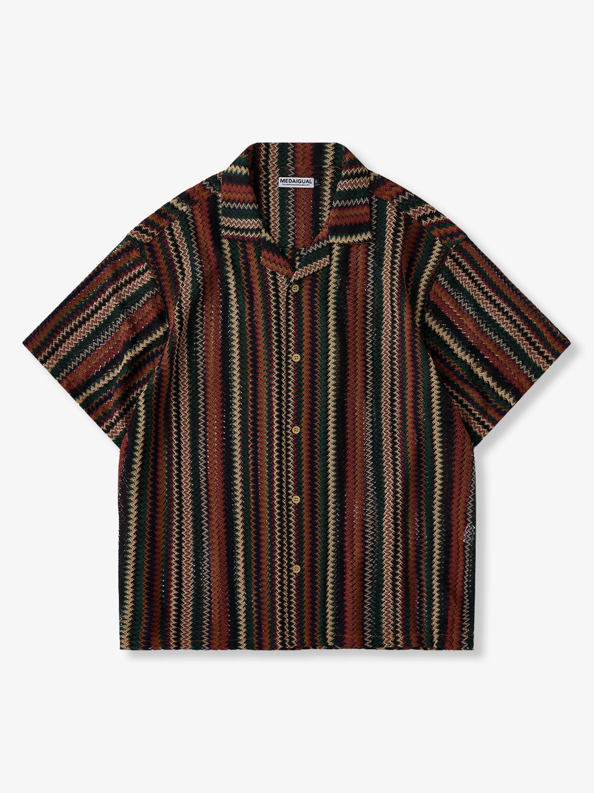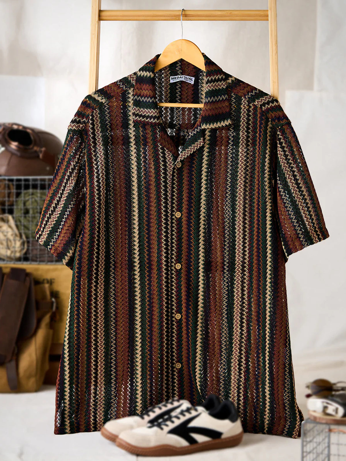 Inspired by the traditional style of Cuban shirts, this updated version features modern colors and patterns. The combination of zigzag stripes and openwork design creates a unique and eye-catching look. It balances a relaxed vibe with a touch of formality, offering ease of movement and a comfortable fit.