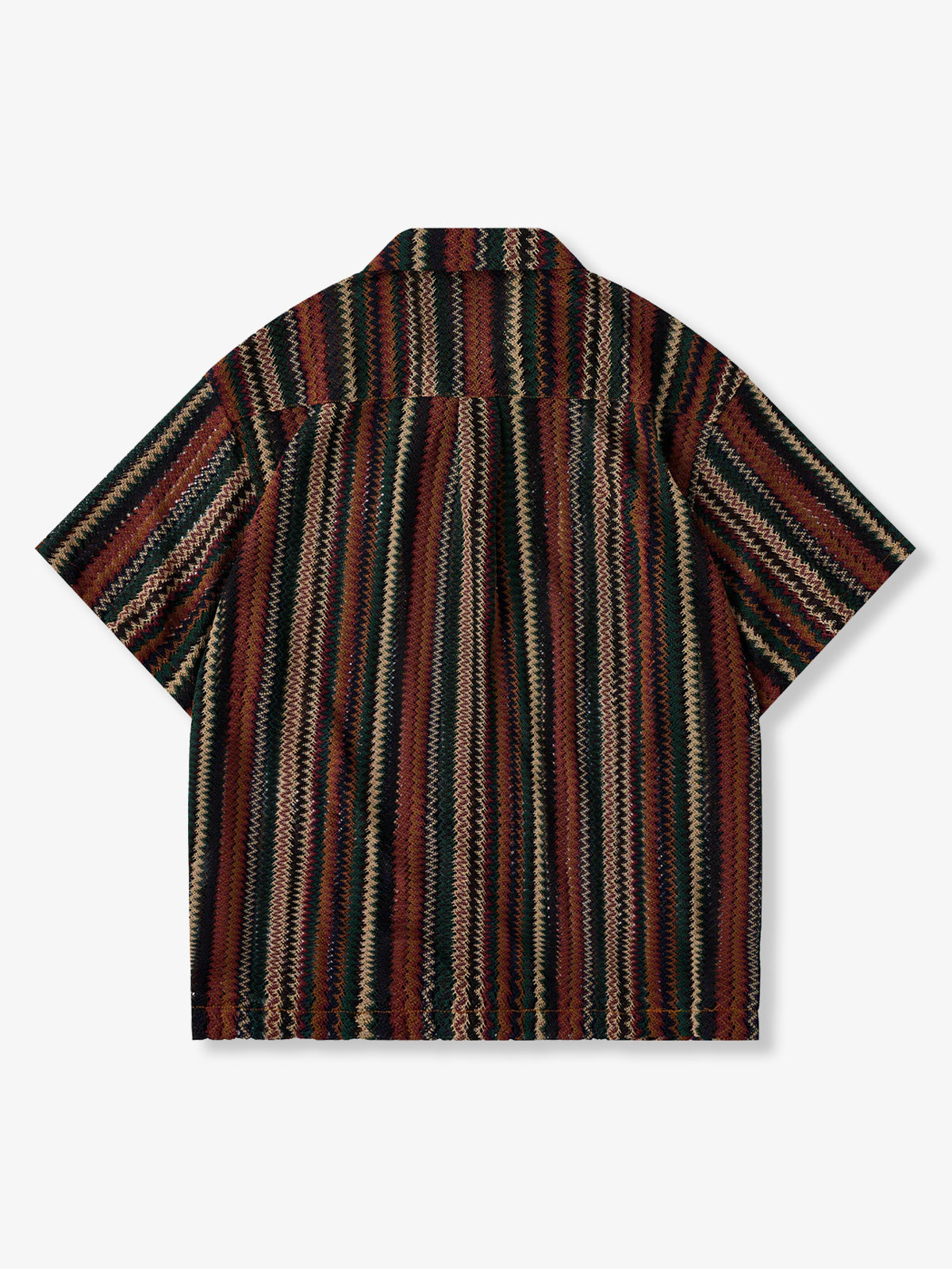 The shirt features an all-over zigzag stripe pattern in earthy tones such as reddish-brown, deep green, cream, and black. This vintage-inspired color palette adds a classical yet modern impression. The fabric has a fine knit texture with a three-dimensional feel and slight transparency, allowing for versatile styling depending on your inner layer.