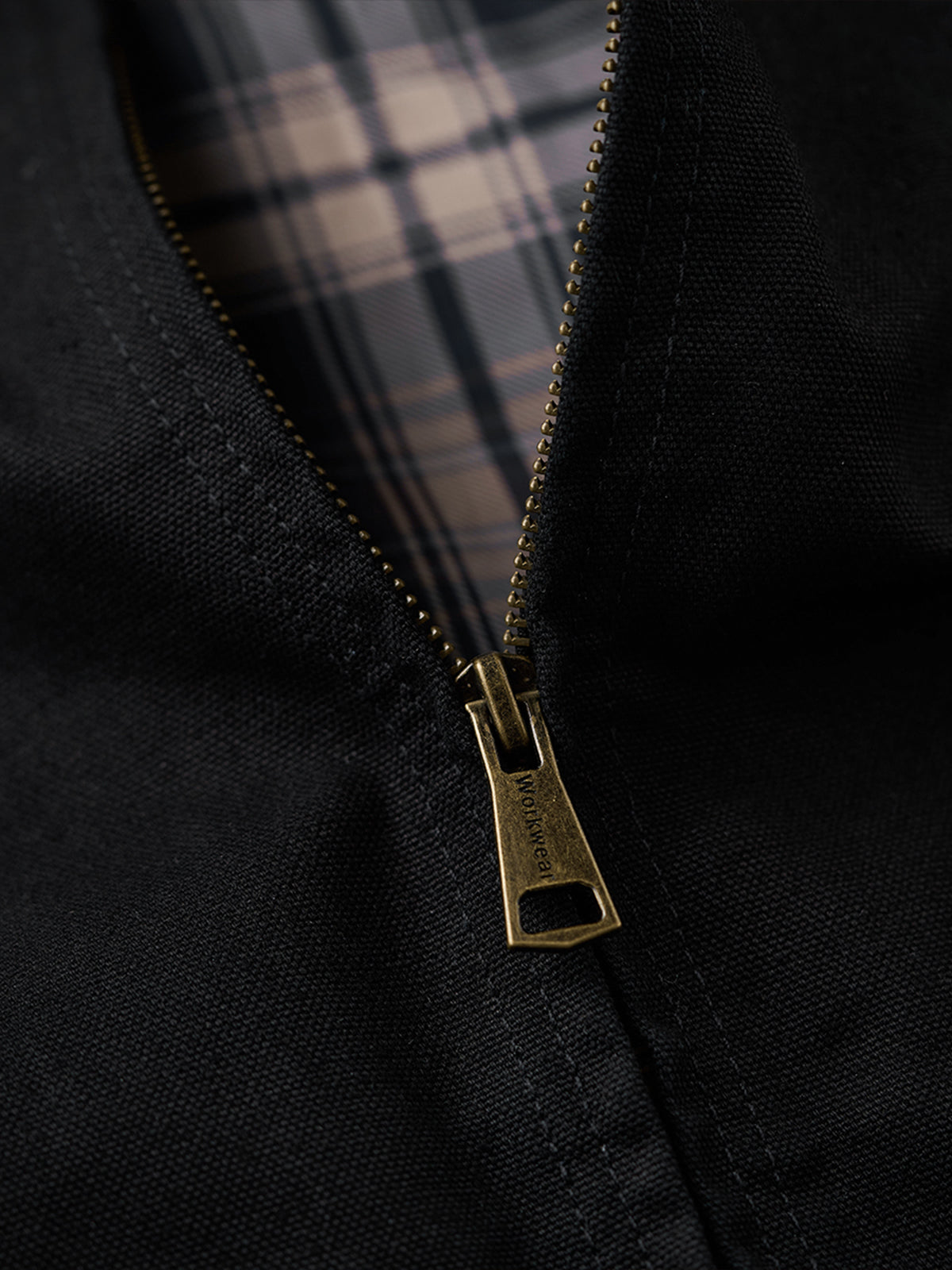 Features include a structured shape, chest pocket, and dual side pockets for functional everyday storage. A check-patterned inner lining adds a subtle visual accent when partially unzipped. Minimal yet practical, this jacket fits easily into both rugged and urban wardrobes.
