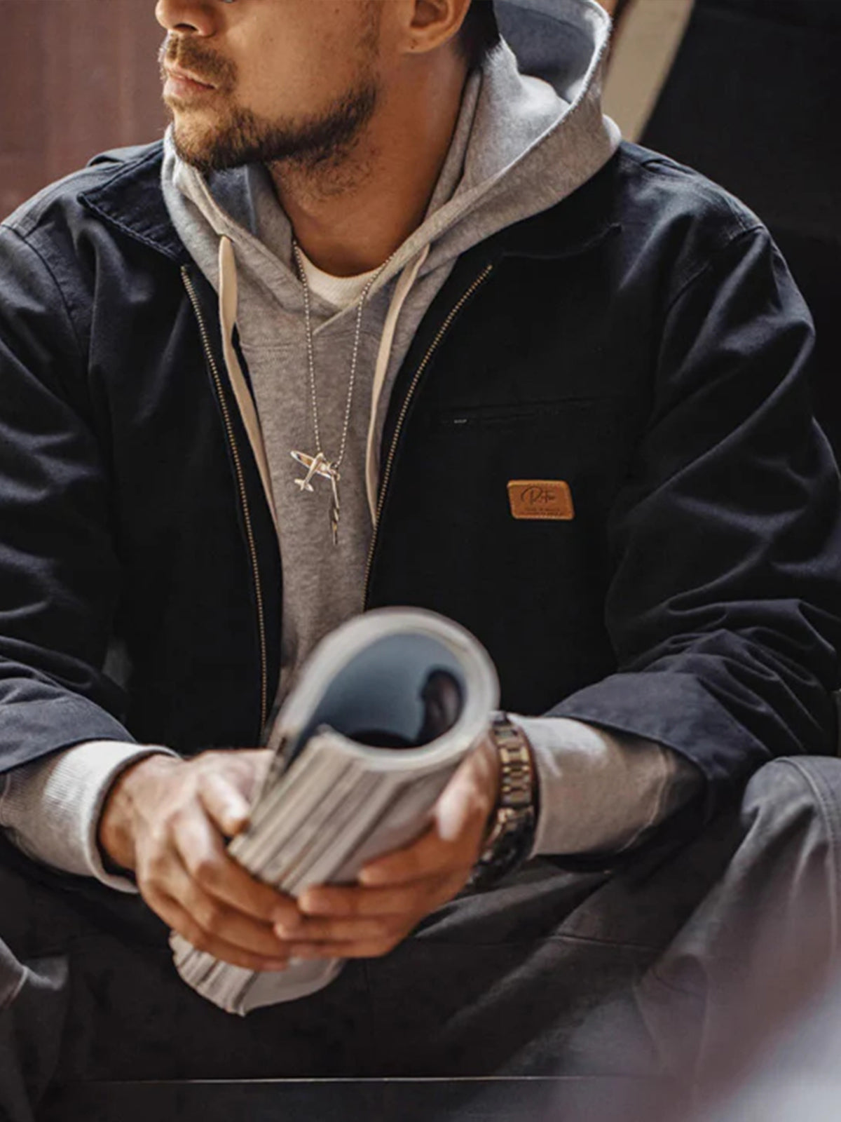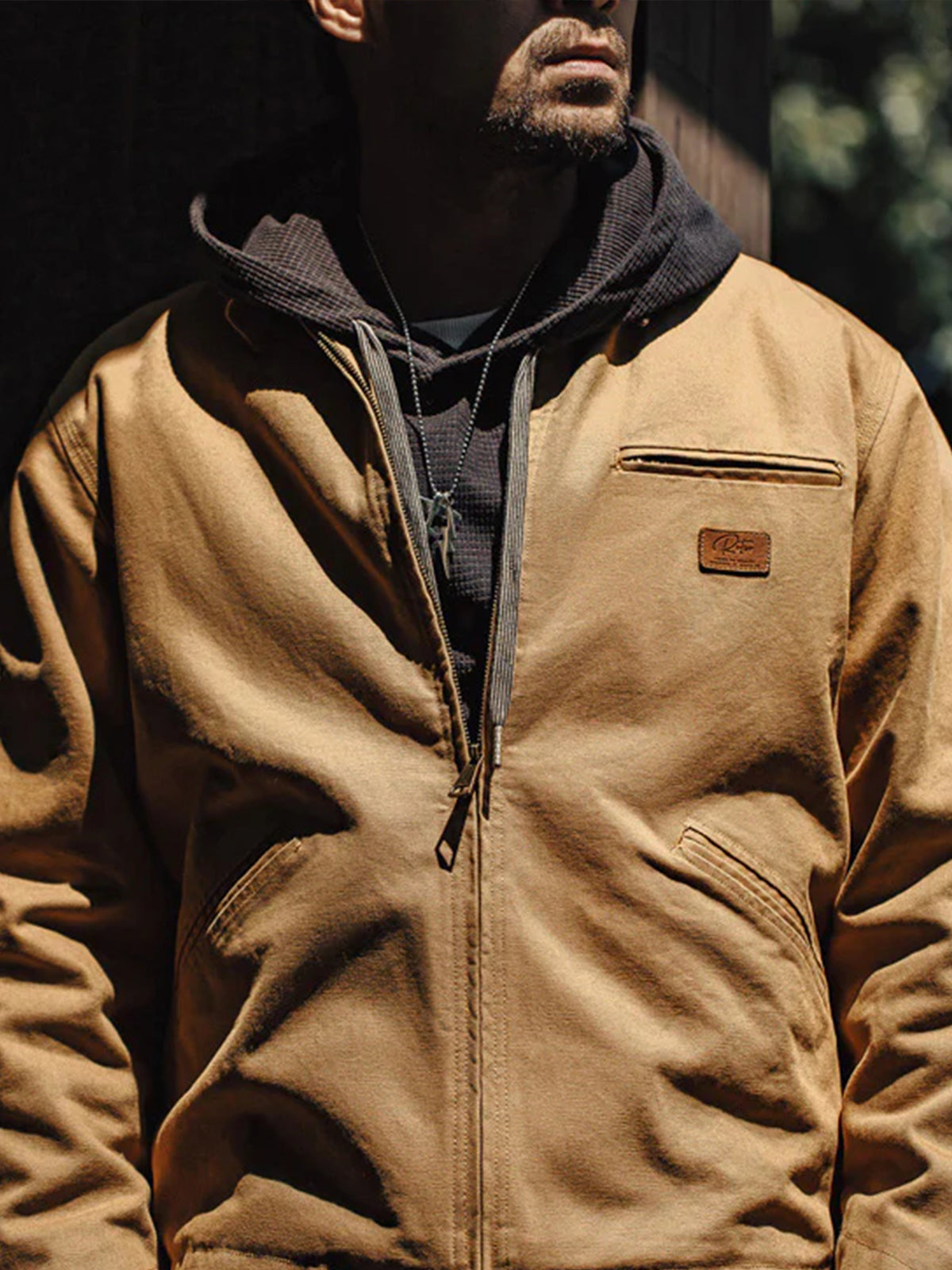 Inspired by traditional American labor jackets, this piece inherits the iconic Detroit-style silhouette with a zip-up front for adjustable wear.