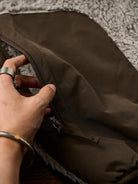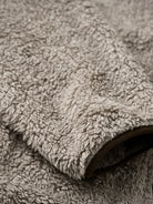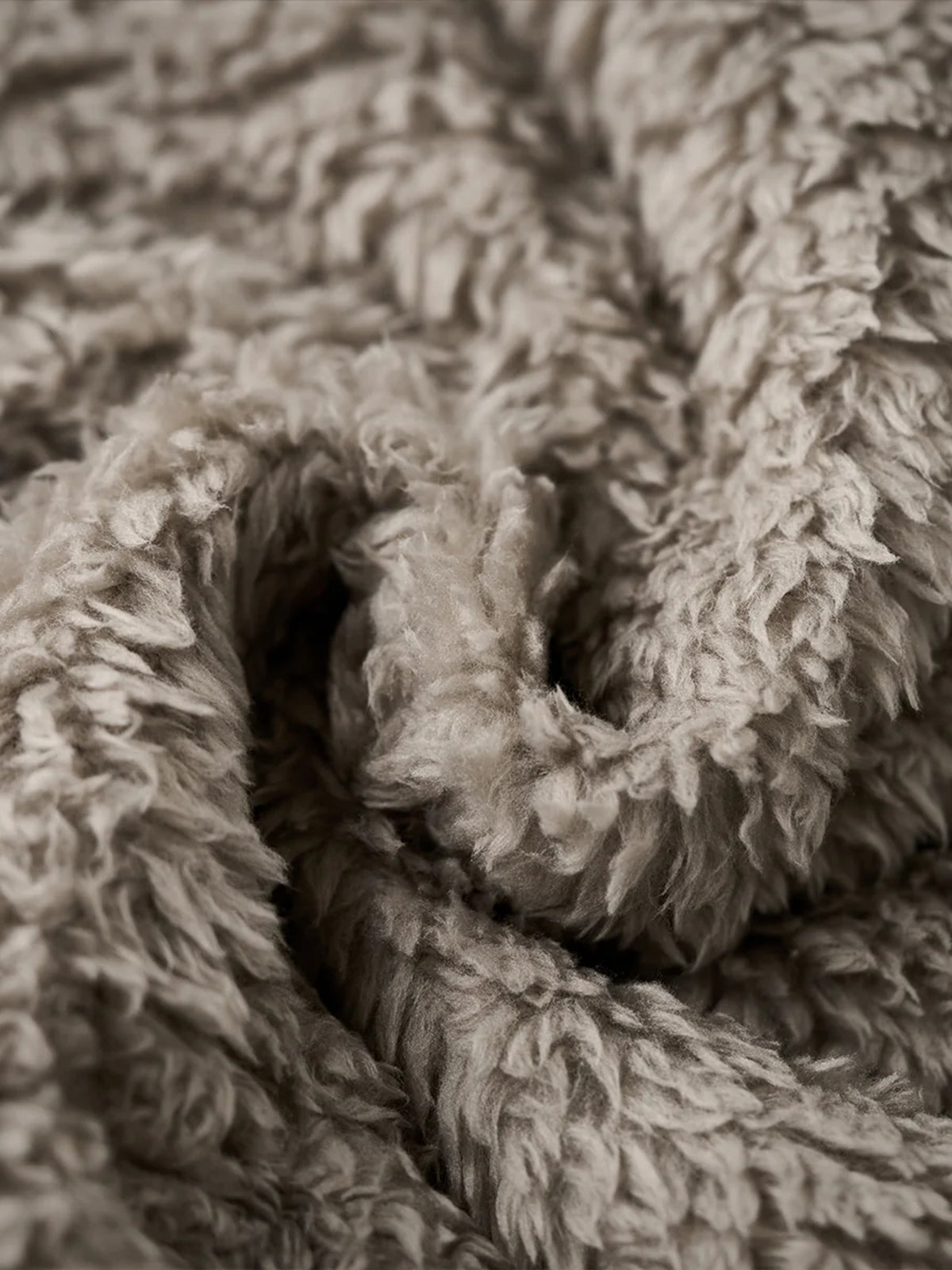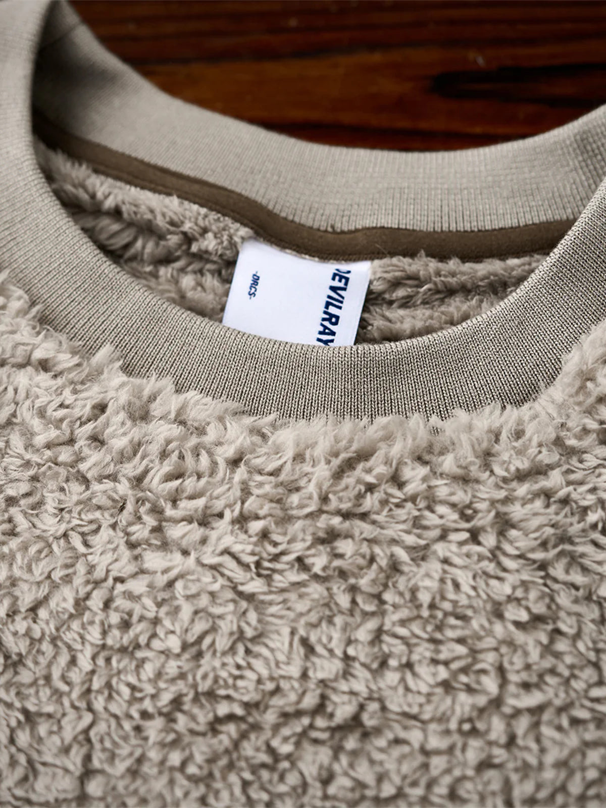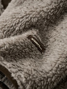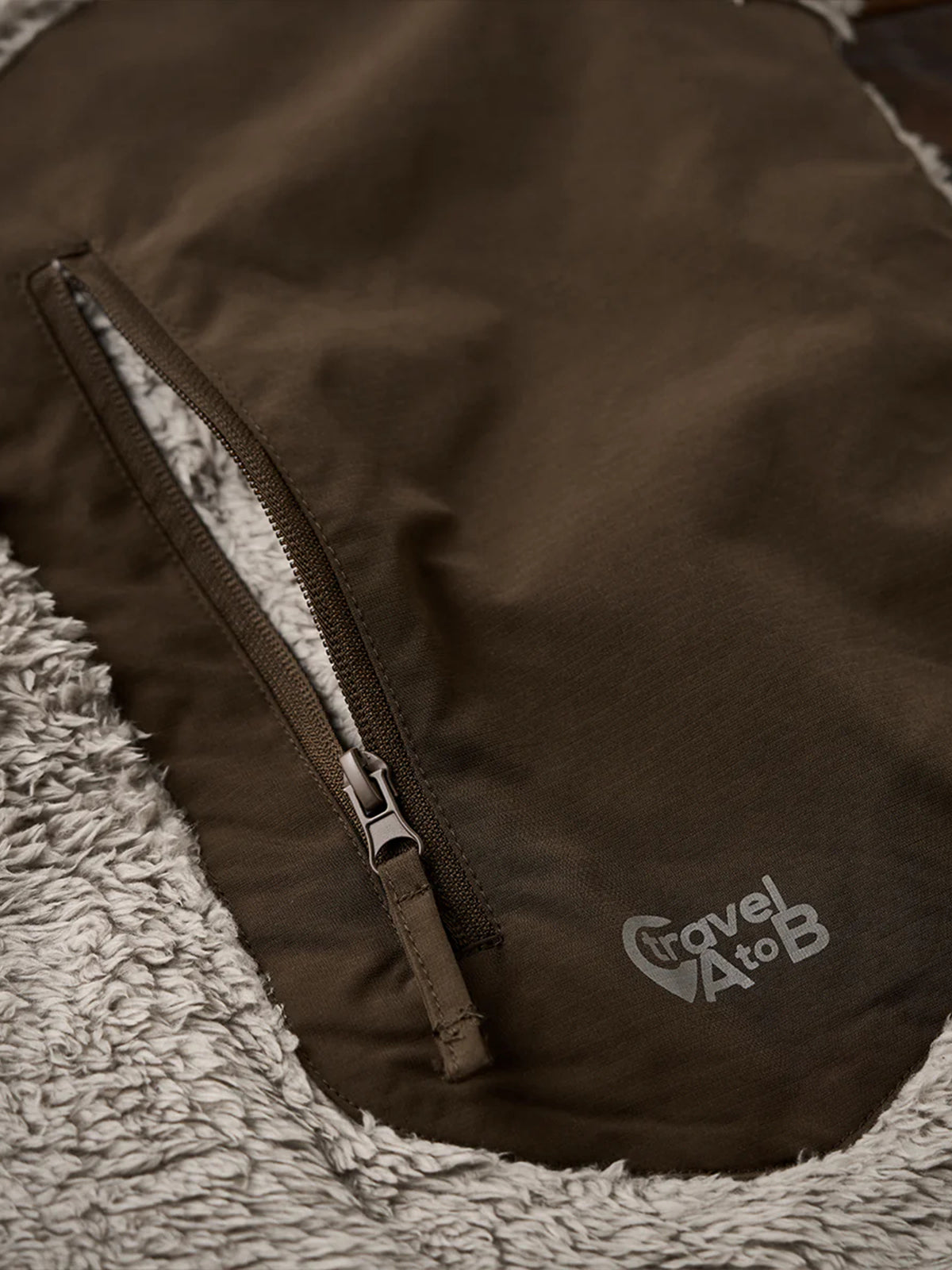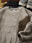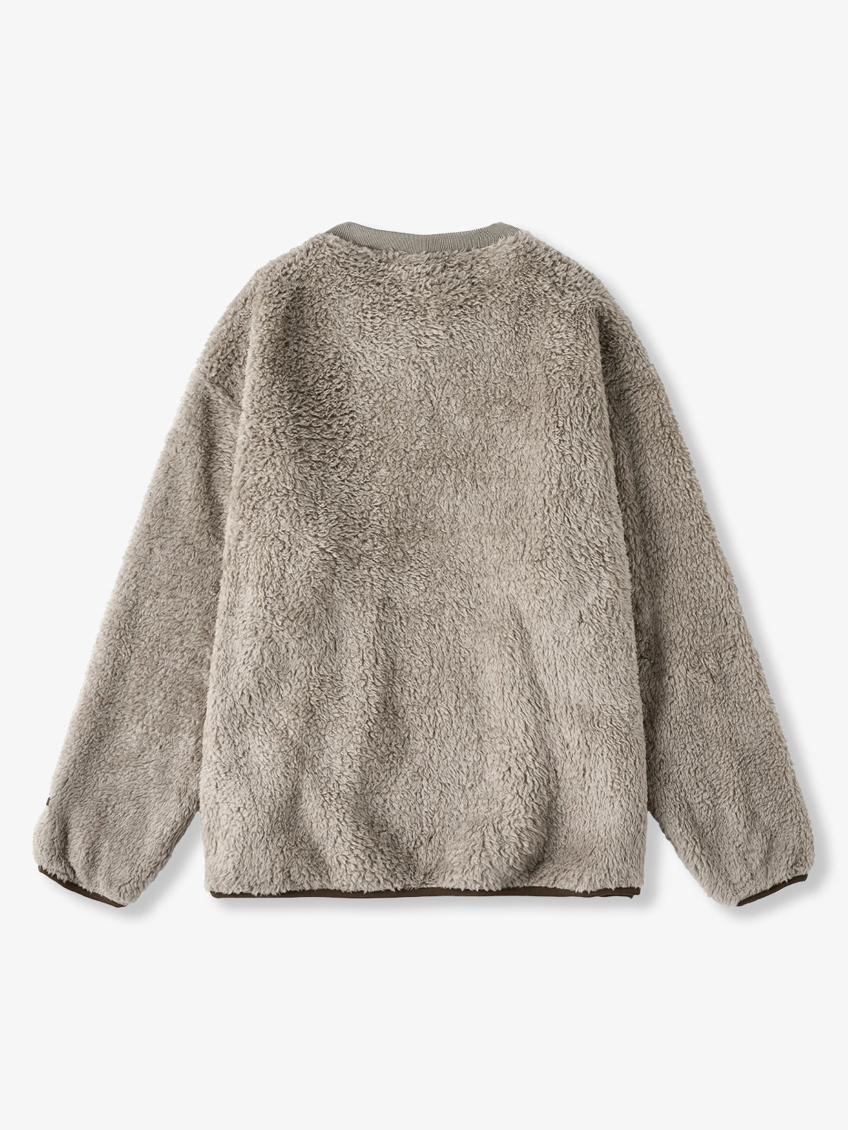 Diagonal zipper pockets placed below the chest and on the sides add visual movement while providing practical storage. The curved pocket design harmonizes with the soft appearance of the fleece, enhancing functionality without disrupting the overall silhouette. The bright gray-beige fleece combined with dark brown pockets and hem creates a calm, natural tone.