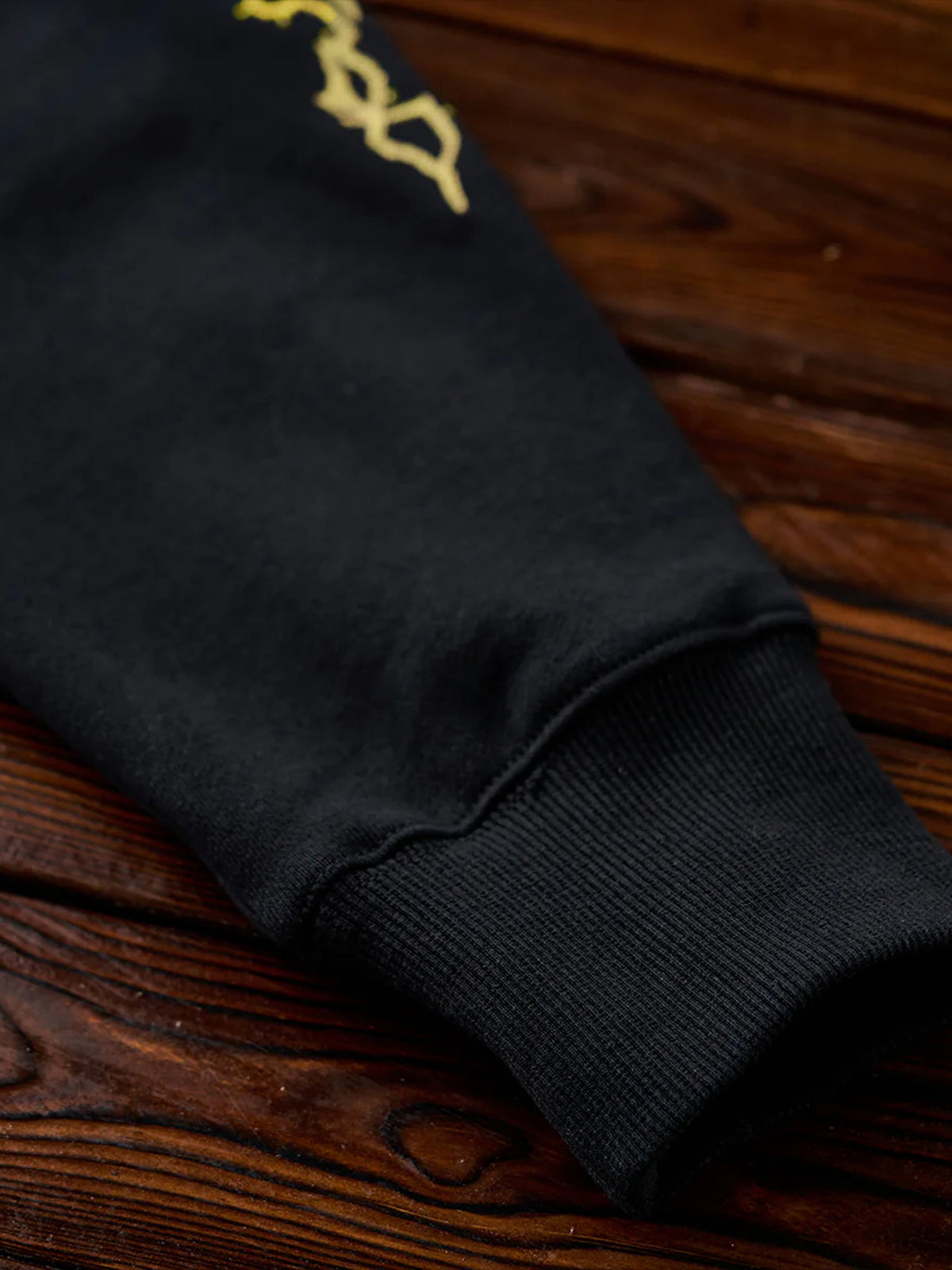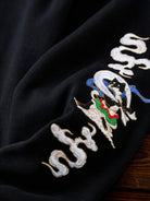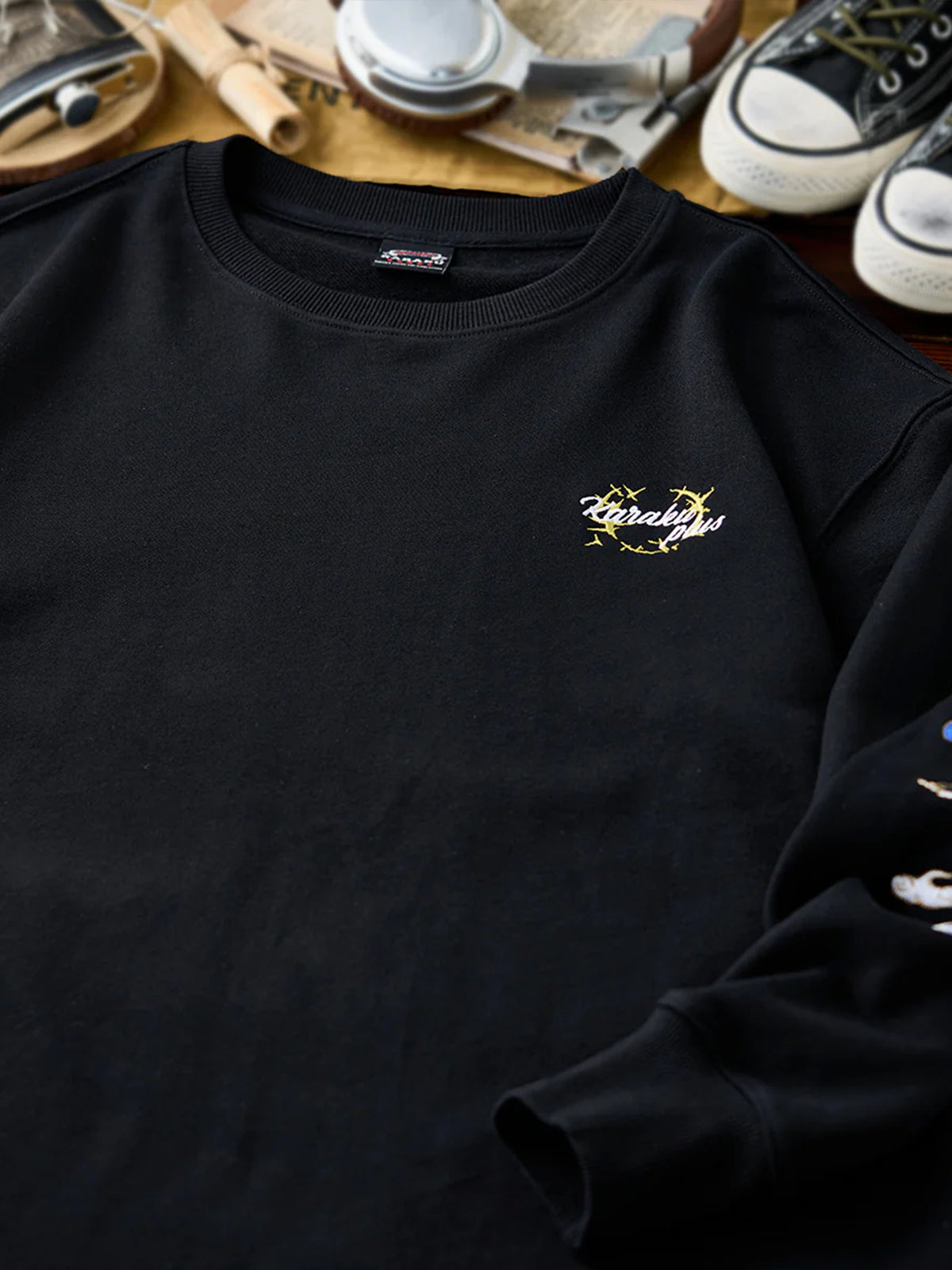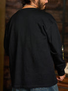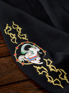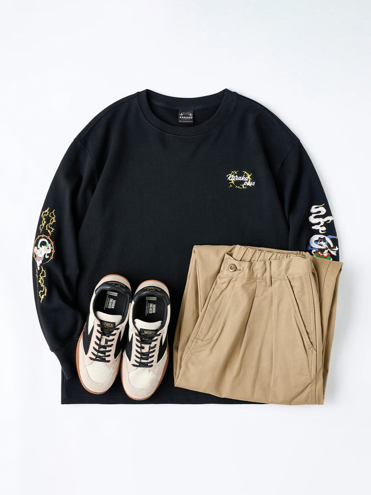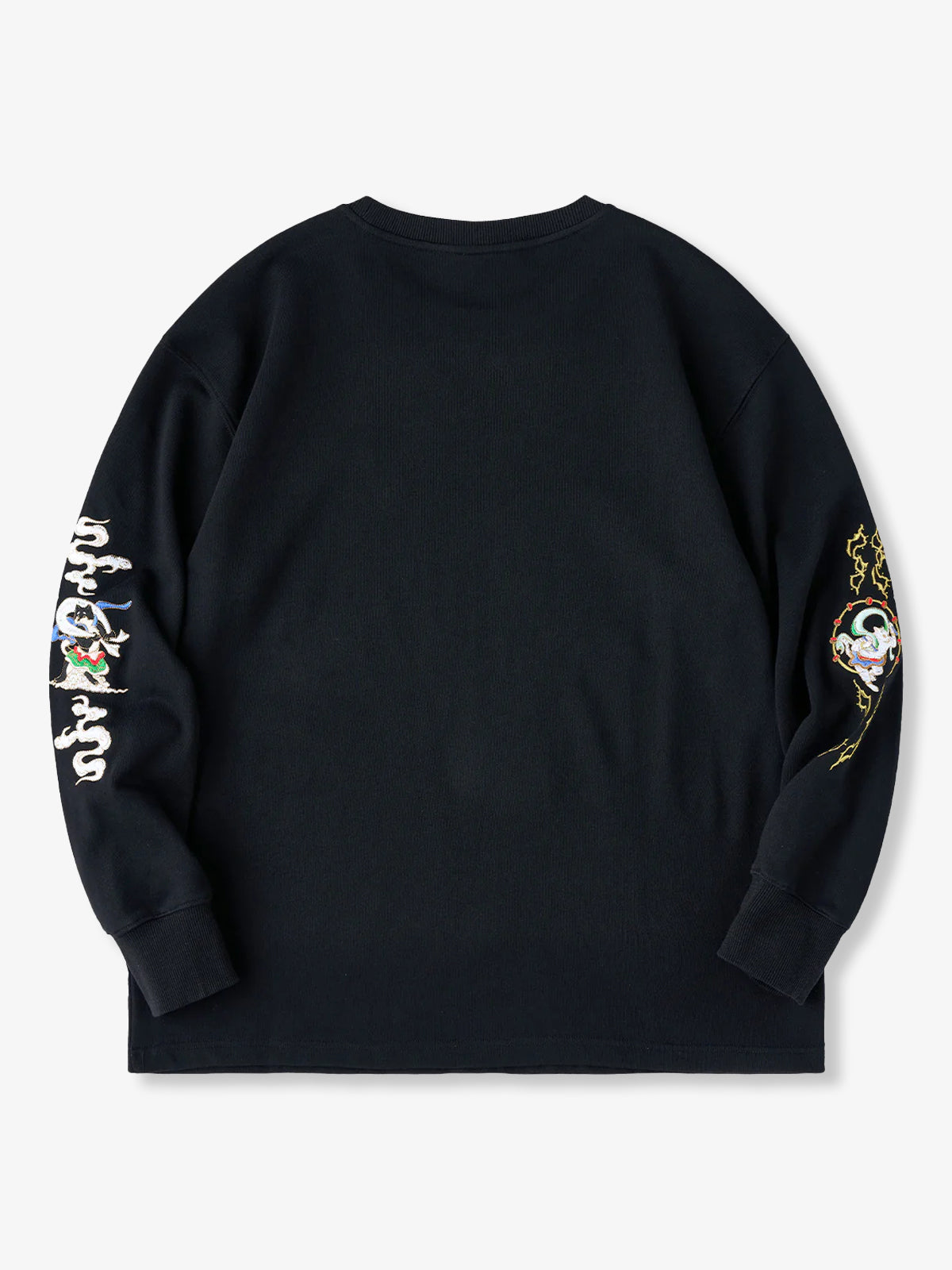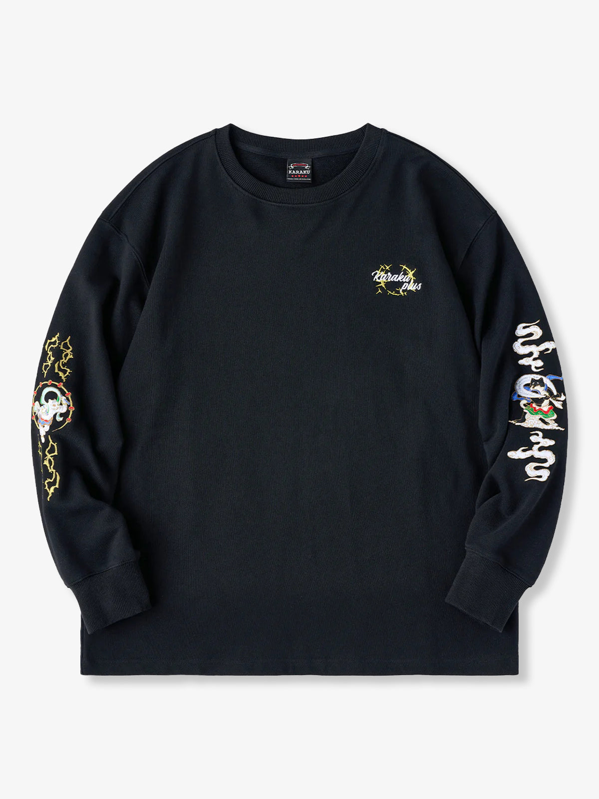 A one-of-a-kind piece that fuses tradition with humor. Featured on the sleeves is playful embroidered artwork inspired by the classic Wind God and Thunder God motif, reimagined with a black Shiba Inu and a white cat. The Black Shiba Wind God stirs up the wind, while the White Cat Thunder God controls lightning—this unique worldview is expressed on the sleeves, making this crewneck long-sleeve tee highly eye-catching. Ribbed detailing at the neckline and cuffs tightens the overall look, creating a silhouette that is casual yet refined. While striking enough to stand on its own, the sleeve embroidery also peeks out beautifully when worn under a coat or jacket, adding a subtle accent to any outfit. An irresistible statement long-sleeve tee for fans of Japanese motifs and animal designs.
